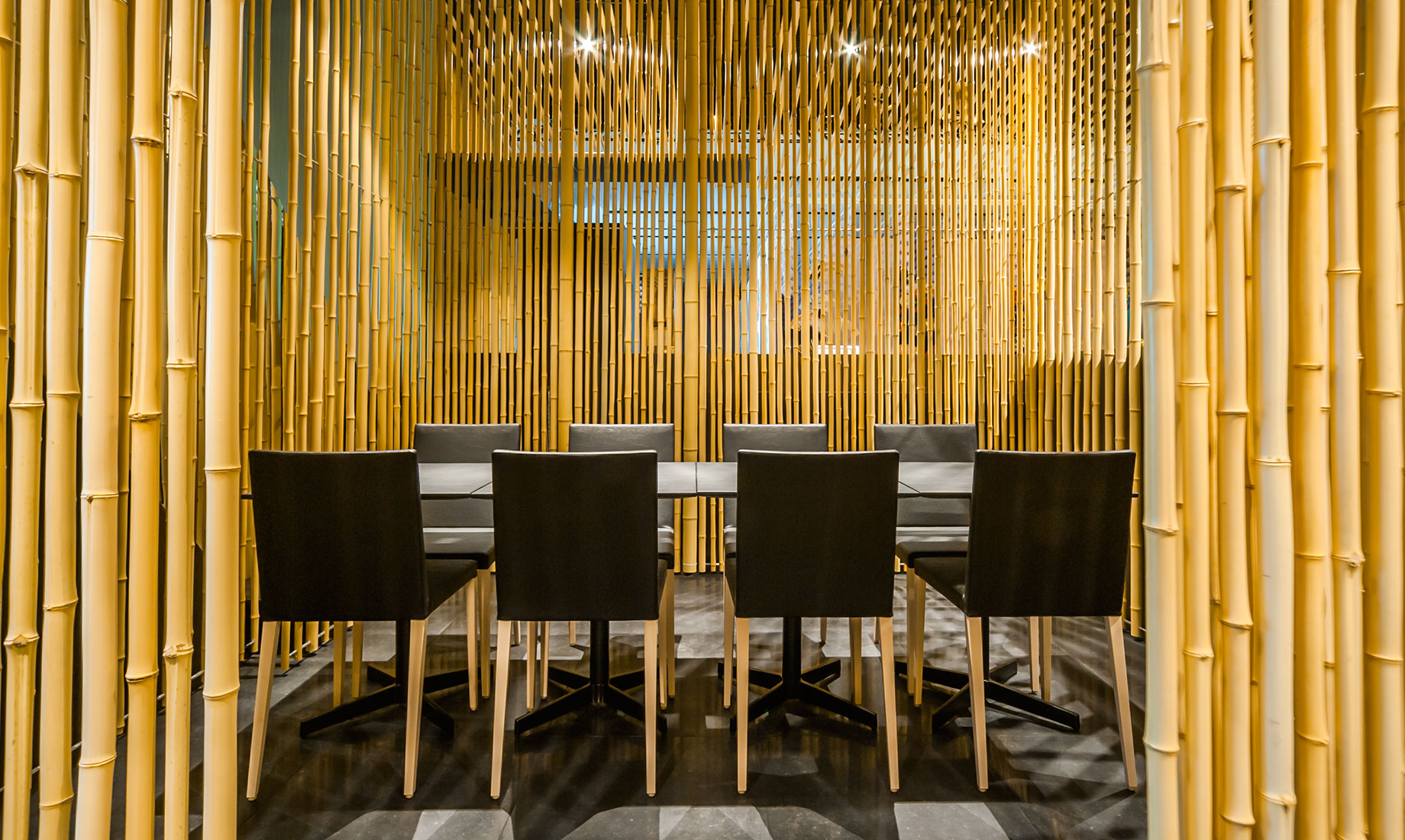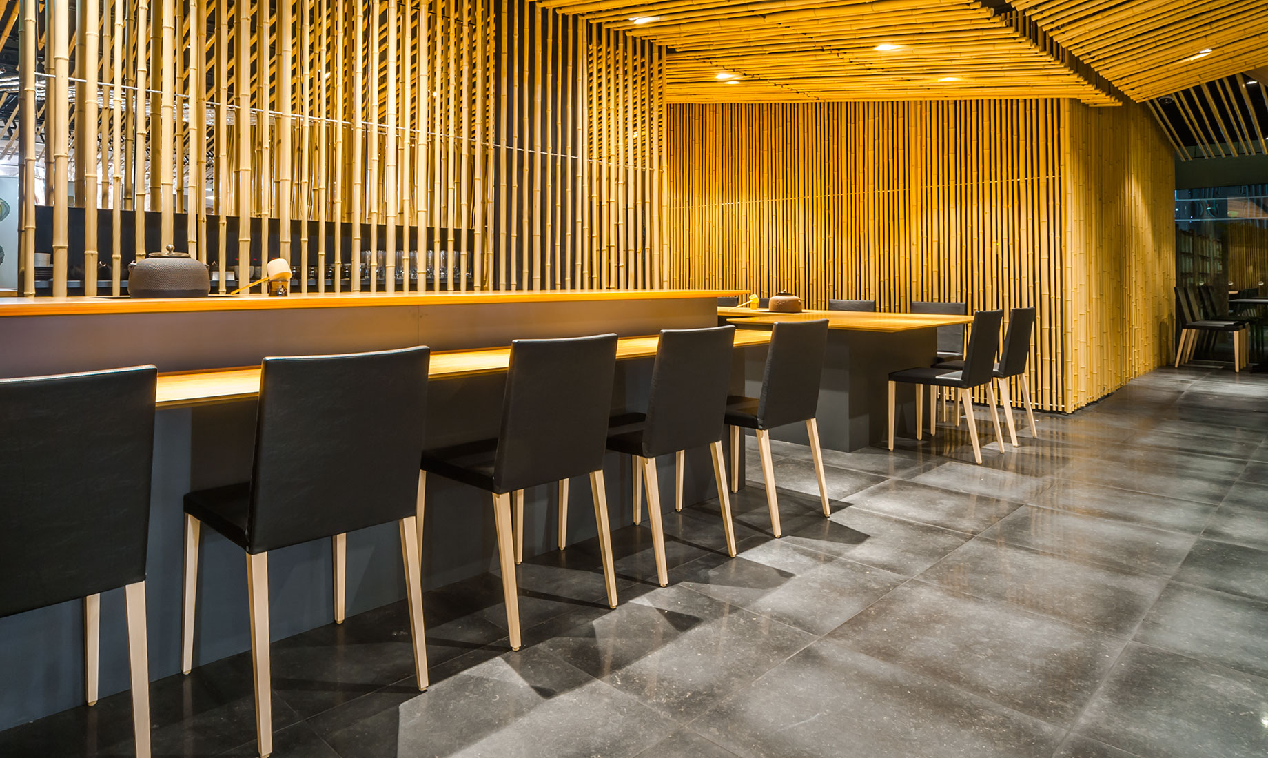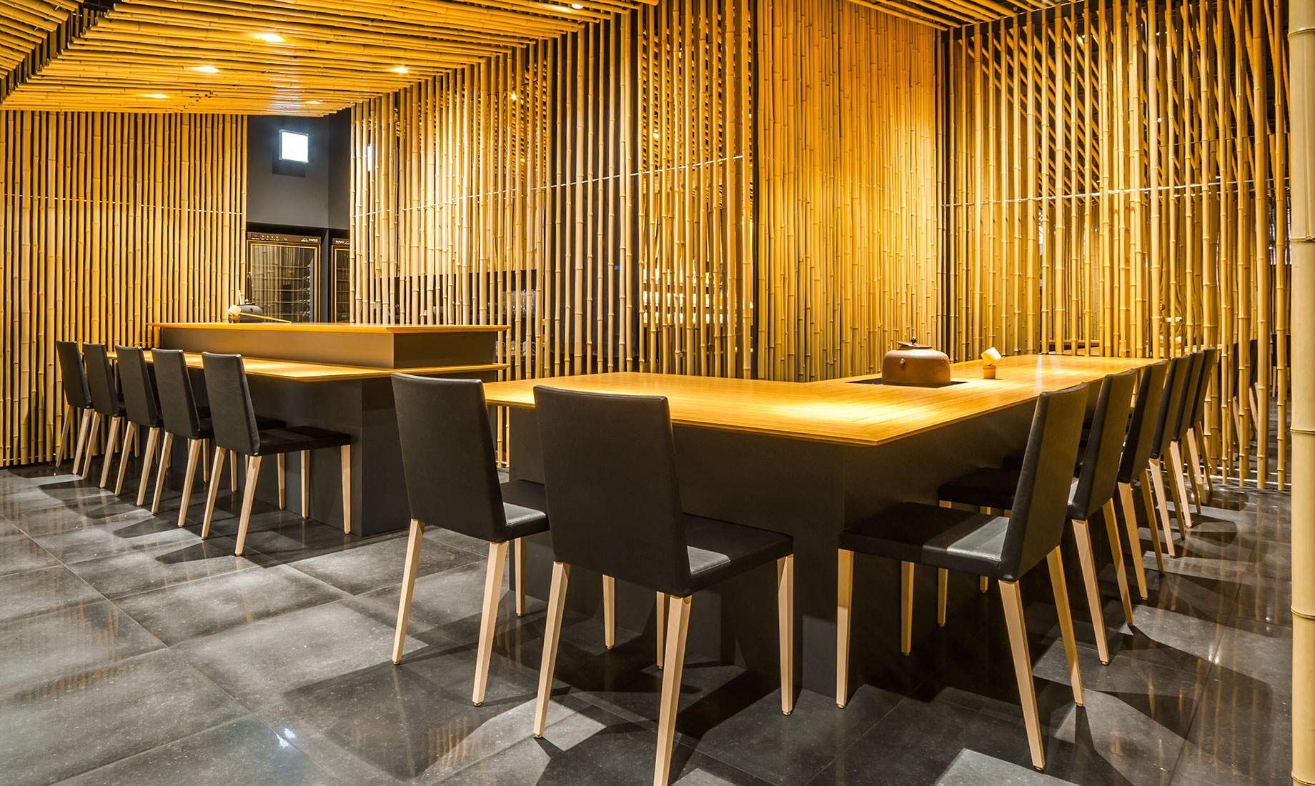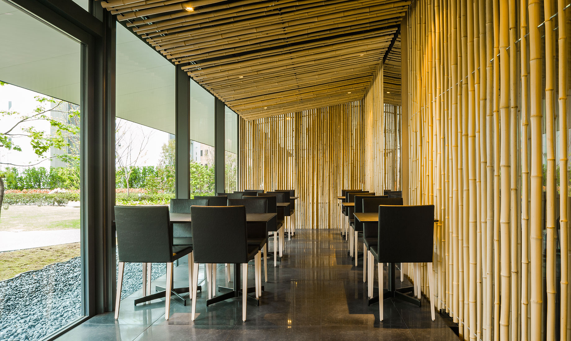 「寿月堂」は、1854 年創業の丸山海苔店が、茶禅の精神を通して日本文化の美しさと茶の心を世界に伝えるために立ち上げたお茶のブランドです。歌舞伎座タワー5 階の屋上庭園と歌舞伎座ギャラリーに隣接する「寿月堂 銀座 歌舞伎座店」の家具を製作しました。3,000 本の竹を用いて作り出された竹林の空間に、隈研吾氏と当社の共同開発によるNC チェアが採用されています。カフェテーブルは天板にレザーを張った特注仕様です。