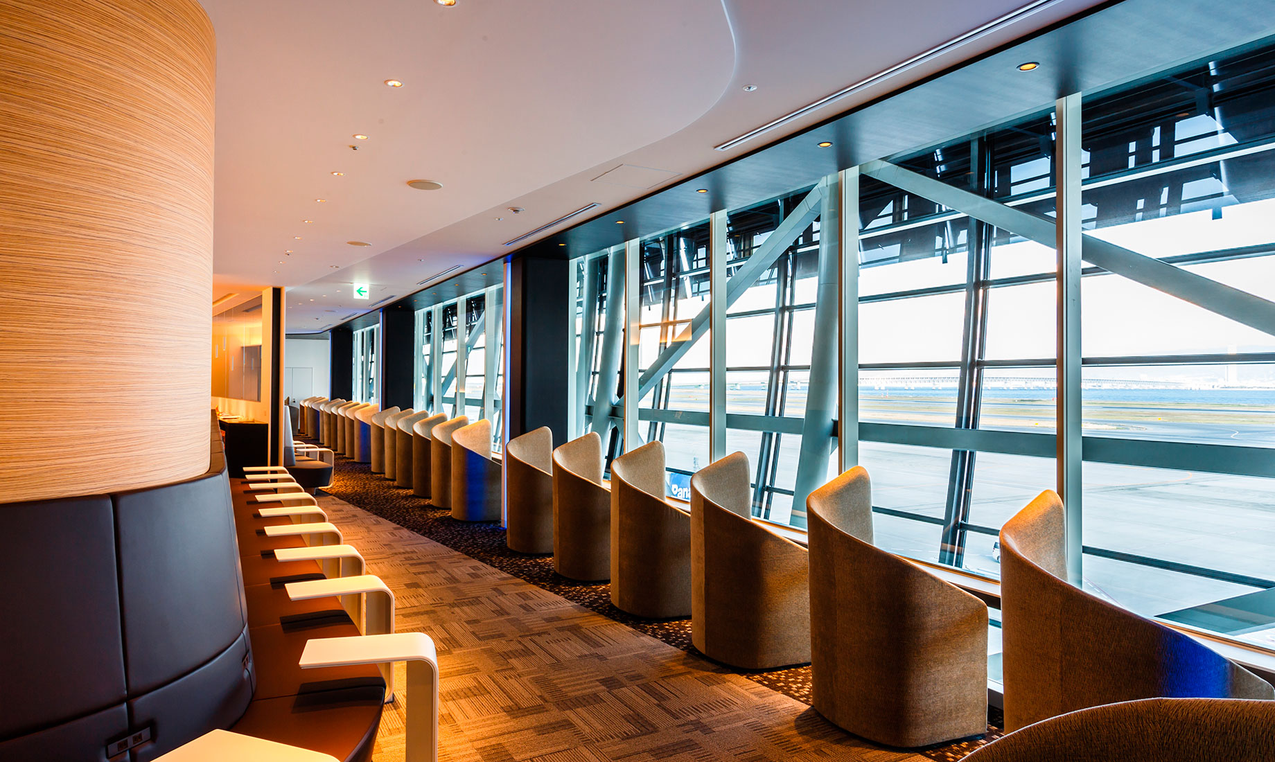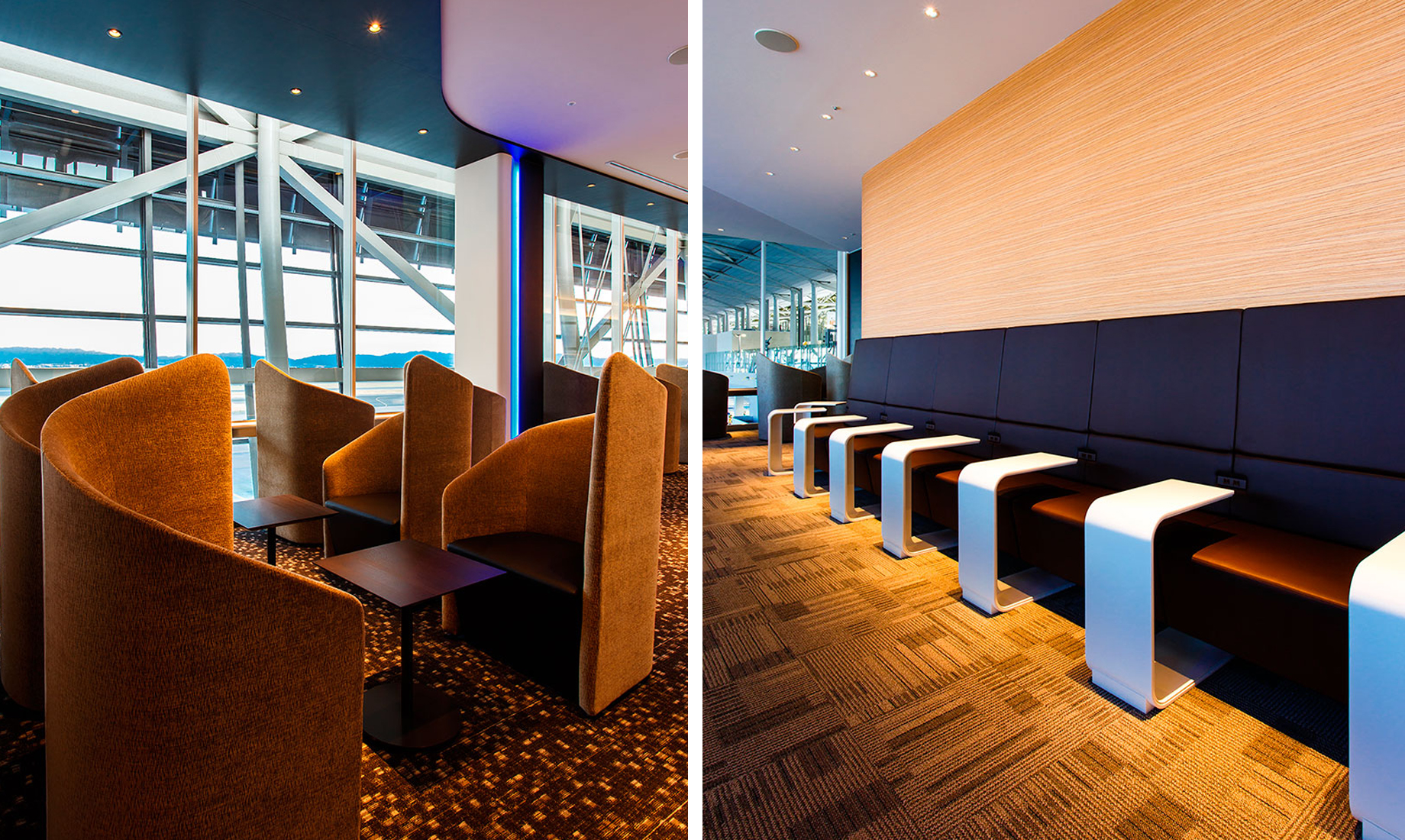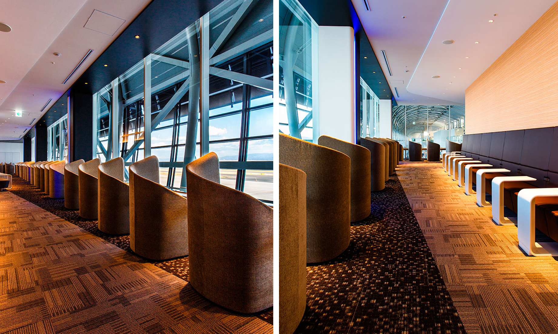 関西国際空港国際線出国エリアのラウンジに、べンチソファを含む特注家具一式を納品しました。曲線のシェルで構成されたラウンジチェアは、包み込まれるような心地よさと共に、利用者一人ひとりにパーソナルな空間を提供します。回転機能を備えているため、複数人での利用にもフレキシブルに対応することが可能です。ベンチソファと人工大理石のサイドテーブルは、ラウンドした壁面に合わせた有機的なデザインを実現しました。
