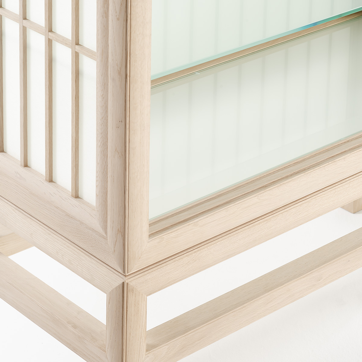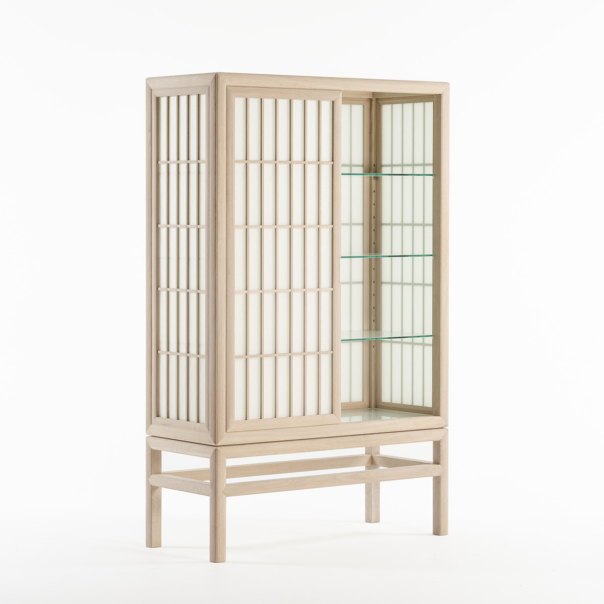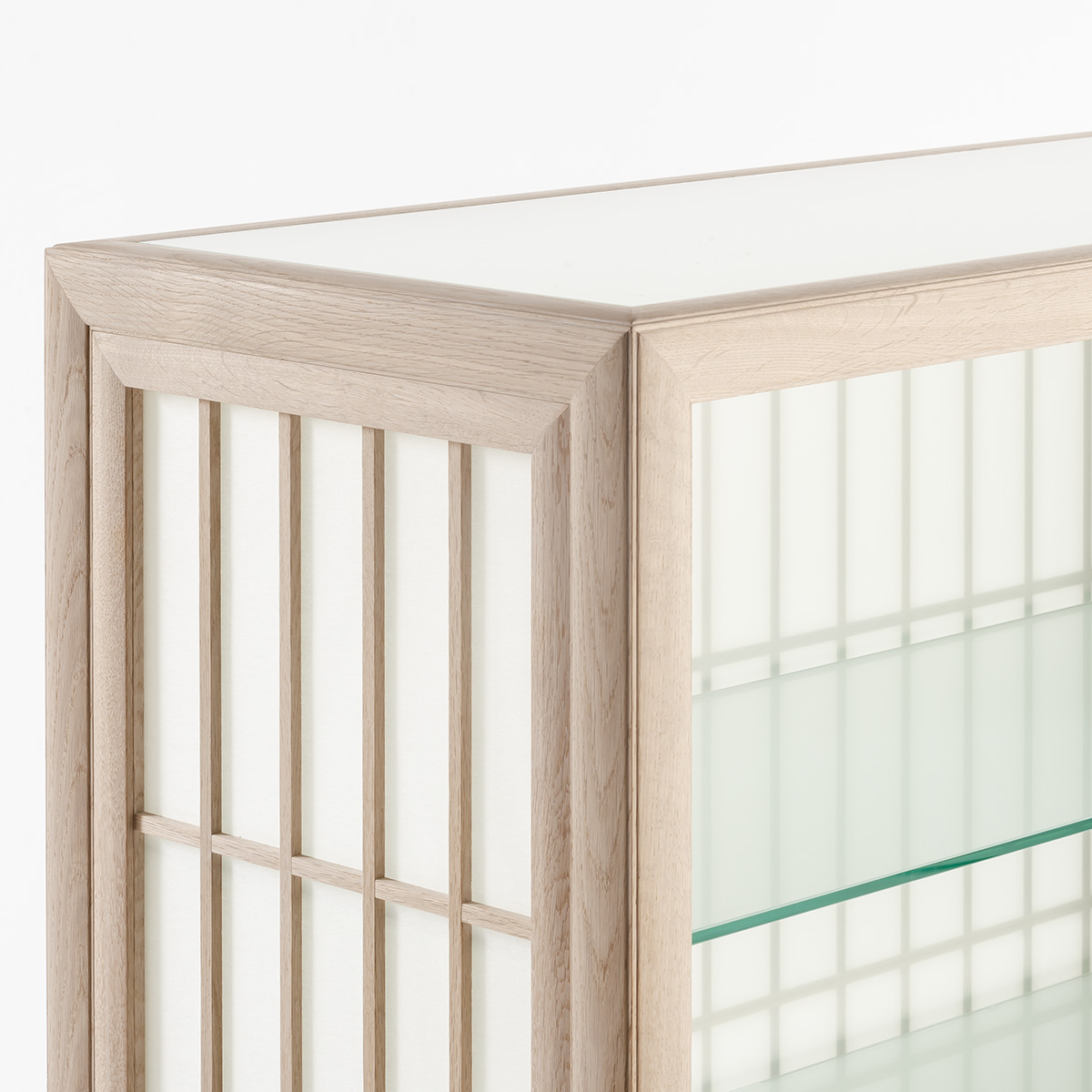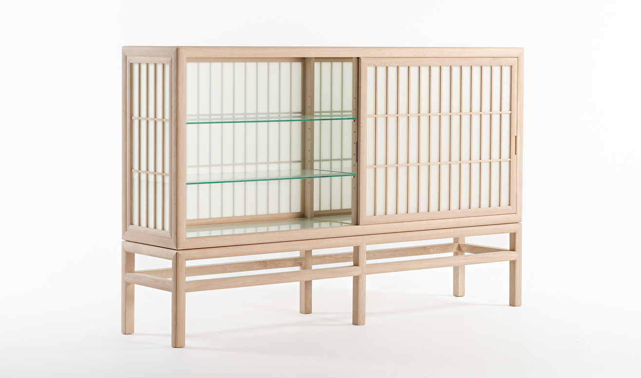 美濃の手漉き和紙職人による和紙を、指物師によって製作されたフレームに張り込み、自社工場で製作した扉枠に取り付けました。扉は障子と同じように引戸になっています。天板・底板・棚板は全てガラスにして、光がキャビネット全体を通り抜けるように設計しました。
