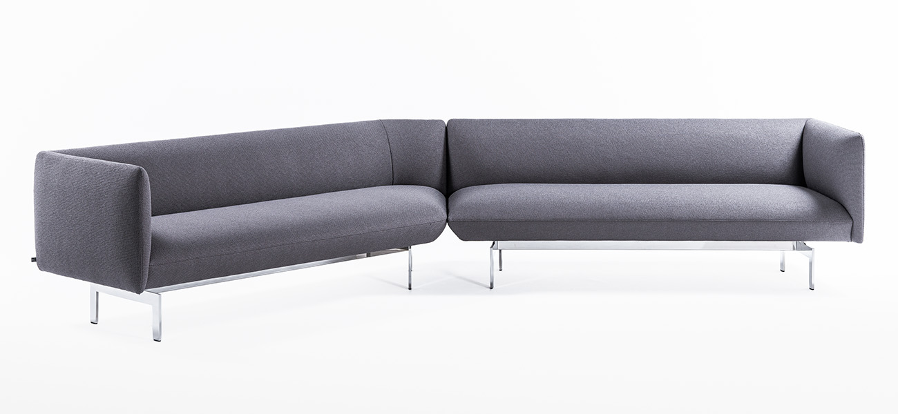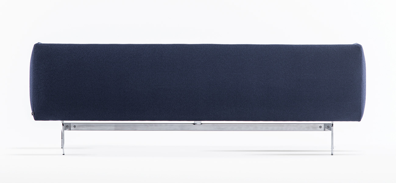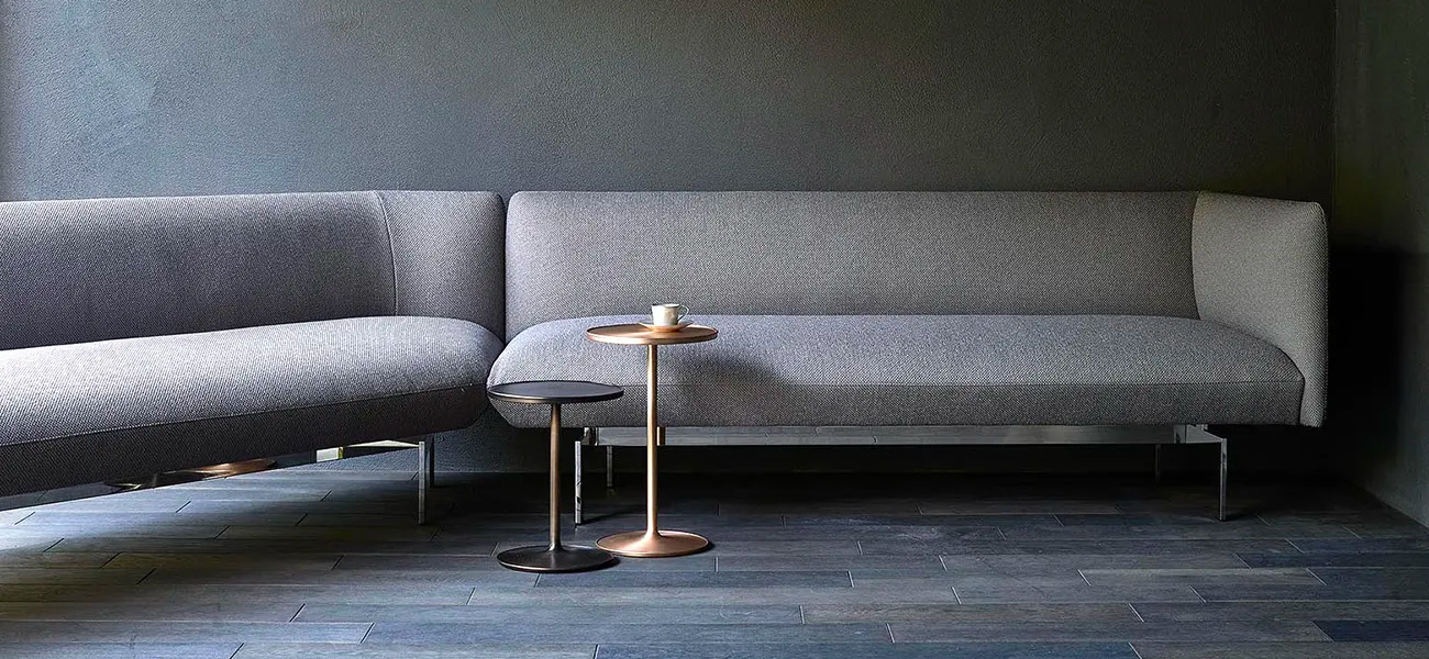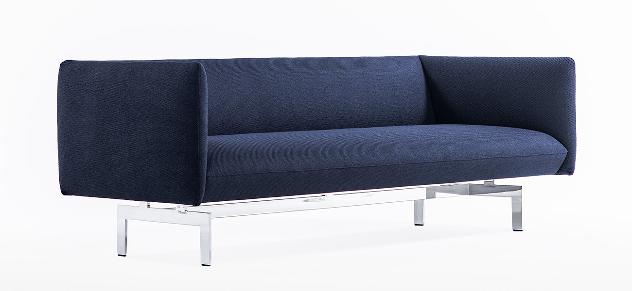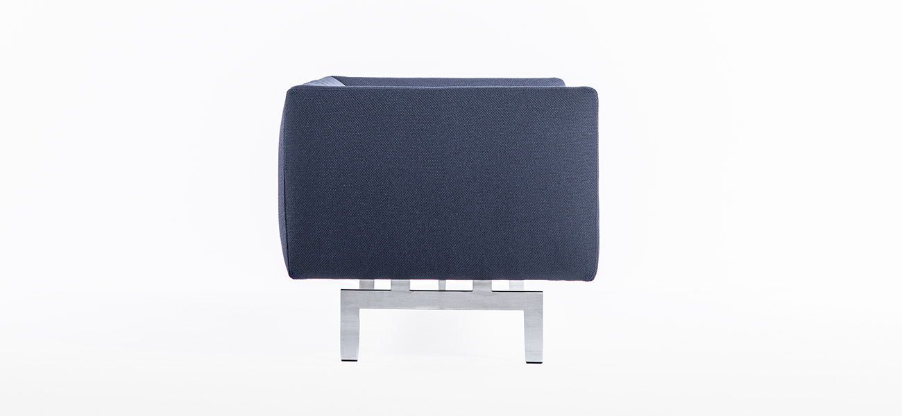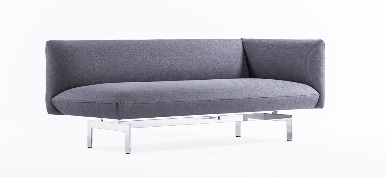 ソファ本体の表と裏の両面を 1 本のステッチラインで繋げてシャープな端部にすることで、有機的なボリューム感を保ちながら、モダンさと端正な印象を生んでいます。コンパクトなサイズながら、それを感じさせないシンプルなフォルムは、私たちの製品の中で新しい意匠となりまし た 。座面は膨らみの中に極力薄く軽快なデザインと快適な座り心地になるように、金属のフレームで強度を確保し、ウェービングテープと復元力のあるウレタンを採用しました。フラットバーで構成した脚は、本体と脚の設置部分に空間を持たせることで浮遊感を出しました。