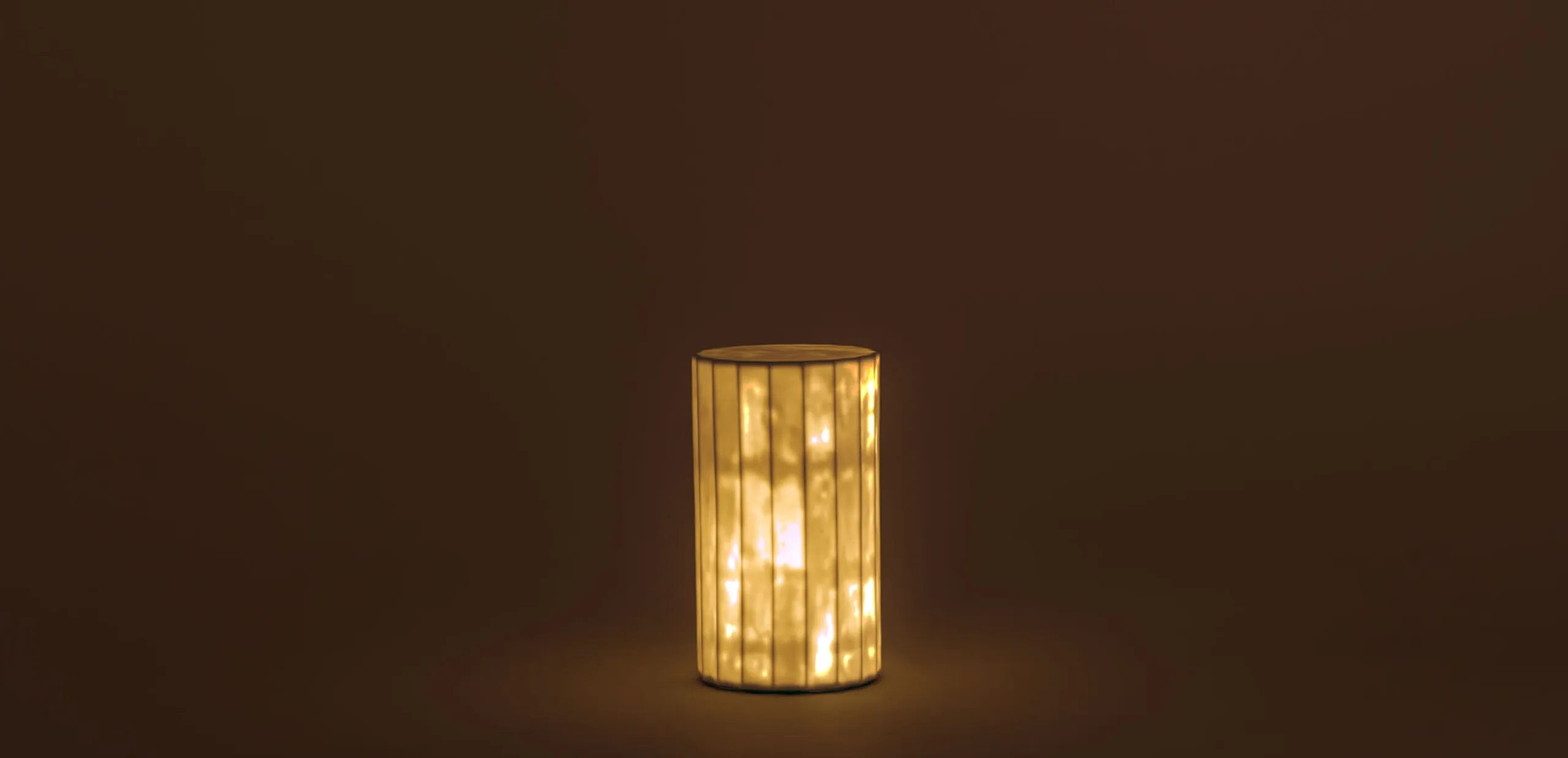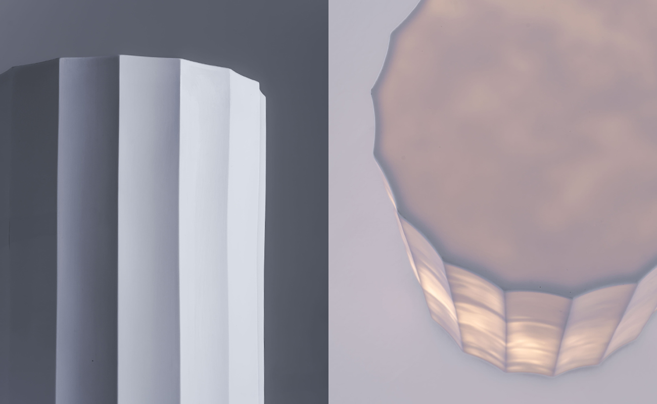 釉薬を施さず、白磁のマットな素地の質感をそのまま生かした仕上げとしています。型で成形されたシャープな面が織りなす幾何学的な造形は焼成の過程を経ることでわずかにやわらぎ、整然とした中にも穏やかさを感じさせます。消灯時には彫刻のような端正な佇まいを見せる一方、光を灯すと泥漿の流れによって生じた揺らぎが面に現れ、温かな色調と共に有機的な表情を浮かび上がらせます。