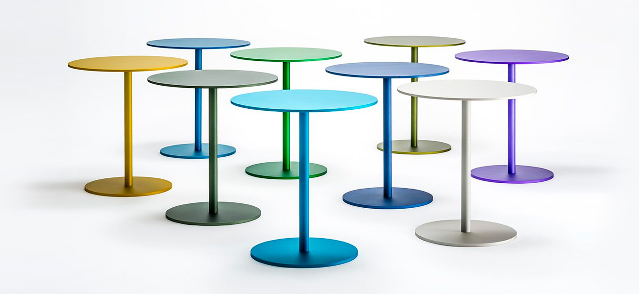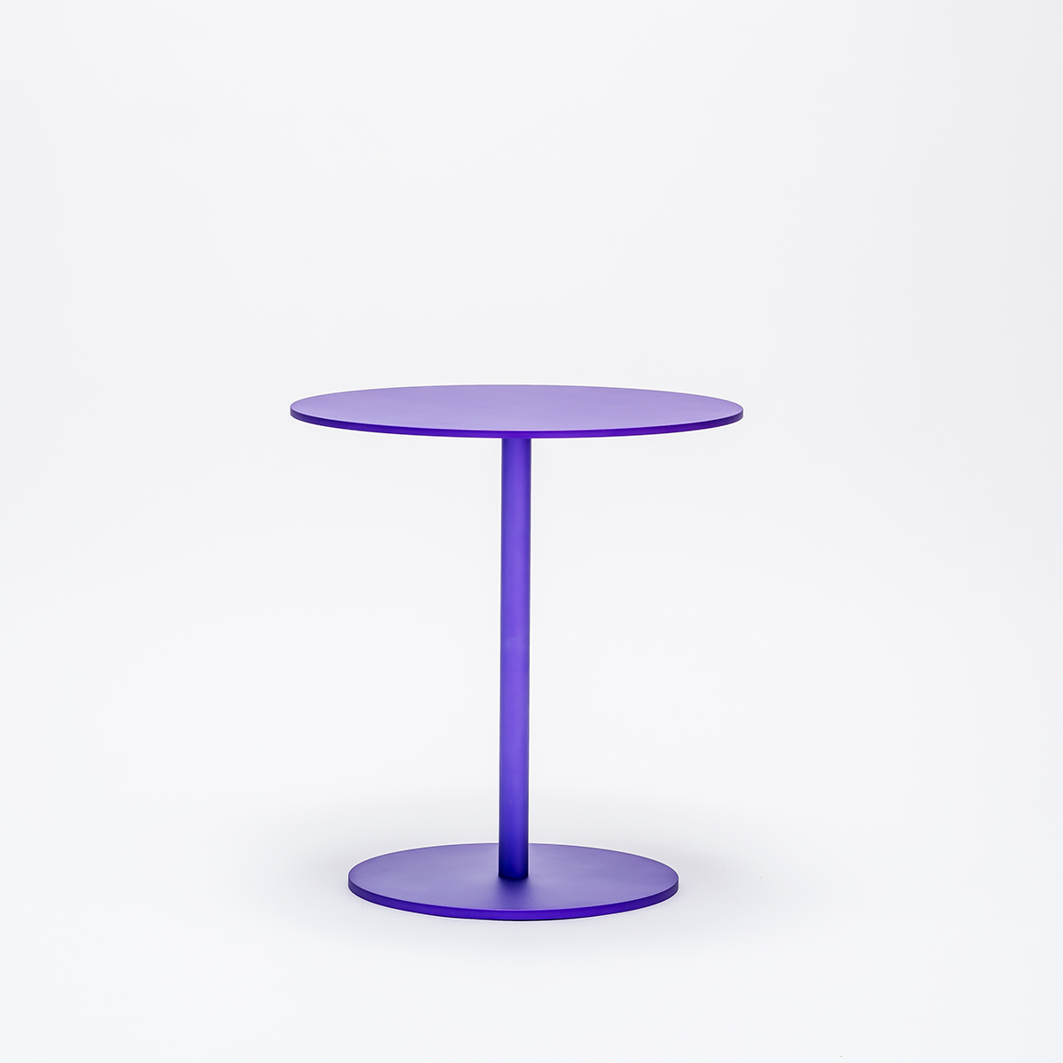アルミアルマイト仕上げはコンピュータやカメラなどの精密機器のパーツの仕上げに多く使われているアルミの耐食性を上げるための最終仕上げです。アルマイト処理する工程から 2 次的に生まれた染料によるアルミの染色加工にとても魅力を感じ、家具として製品にしたいと考えました。染色加工はアルミの表面に色を塗装するのではなくて、アルミアルマイト処理によってできた多孔質層の孔に染料を入れ、その孔を塞ぐ処理によってアルミそのものを染め、深みのある表情を作ります。染料の色と濃度、浸透時間の長さによってアルミの色が変わる、経験値と計測値の両方が必要な技術です。
