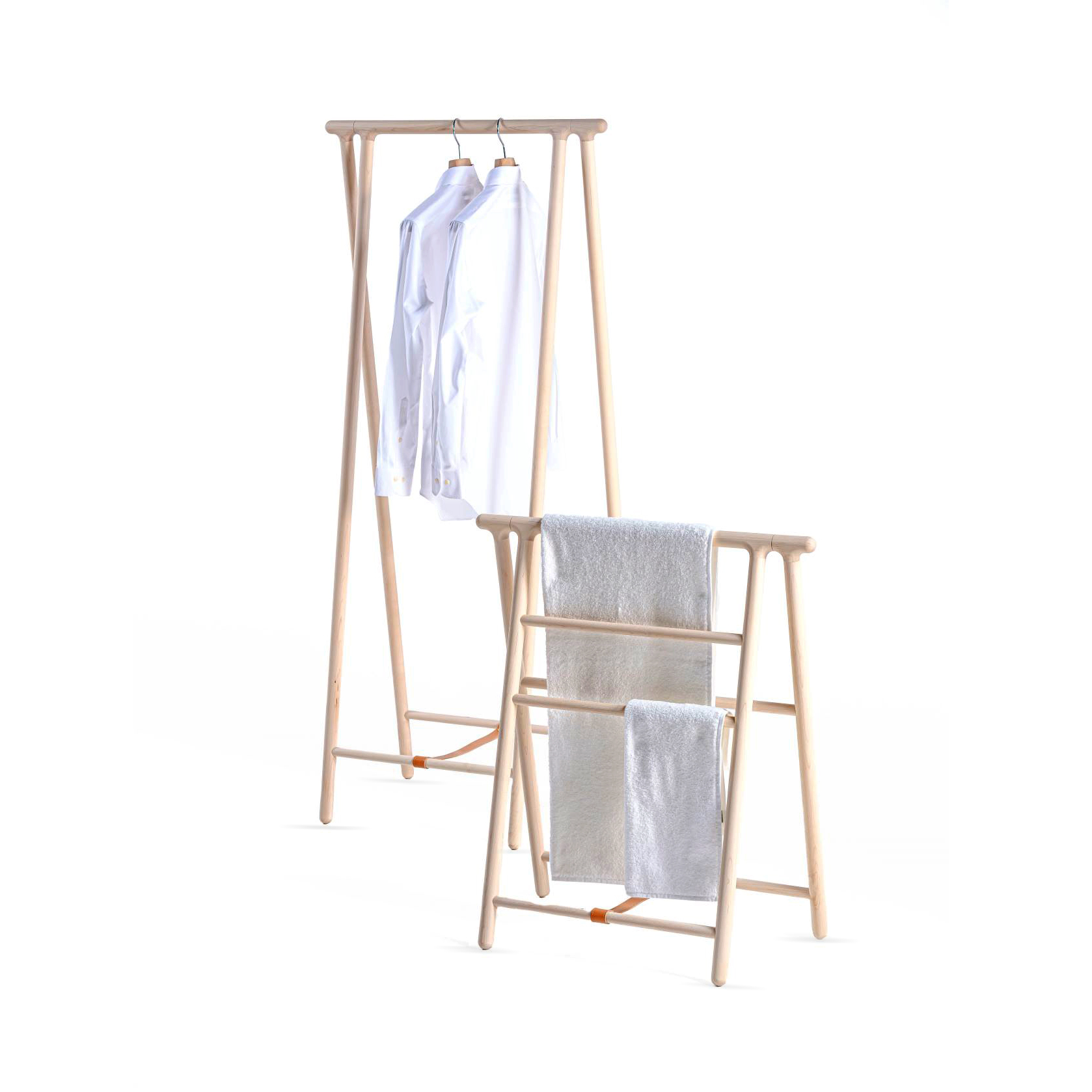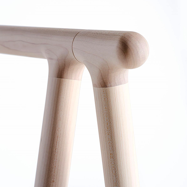 Branch of the maple hangerは、丁寧に削り出した無垢のメープル材で構成したハンガーです。メープルの滑らかな質感と開き留めのヌメ革のベルトは経年によって増す風合いを楽しむことができます。軽量なので、使う時に取り出して、使わない時には畳んで壁に立て掛けたり、収納しておくことができ、バスルームや寝室、リビング、玄関などへ気軽に持ち運びながら幅広い空間で使えます。フレームの脚先などの端部を丸く優しい形状に仕上げたので、肌に触れても安心です。