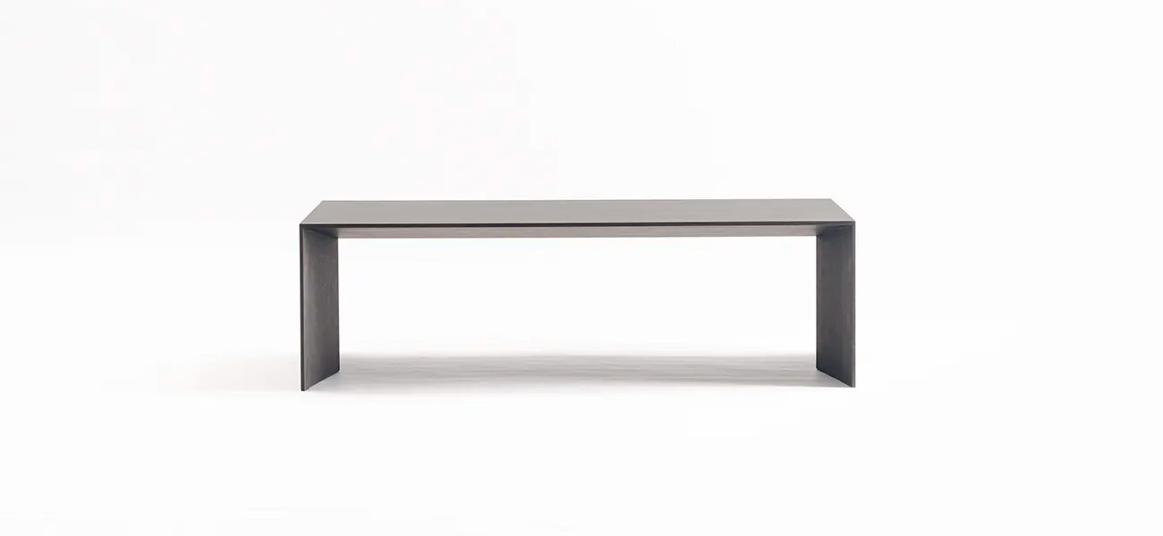 両面の小口を薄く繊細に作り、中央に向かって傾斜をつけて厚みを持たせることで強度を確保しました。そうすることで中脚や方立などの補強材を入れずに、極限まで薄くした長い天板のテーブルを作ることが出来ました。構造力学を応用し、建築的な視点で考えられた木工のテーブルです。