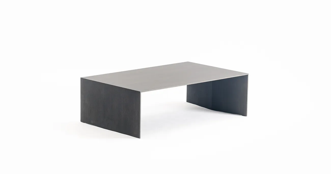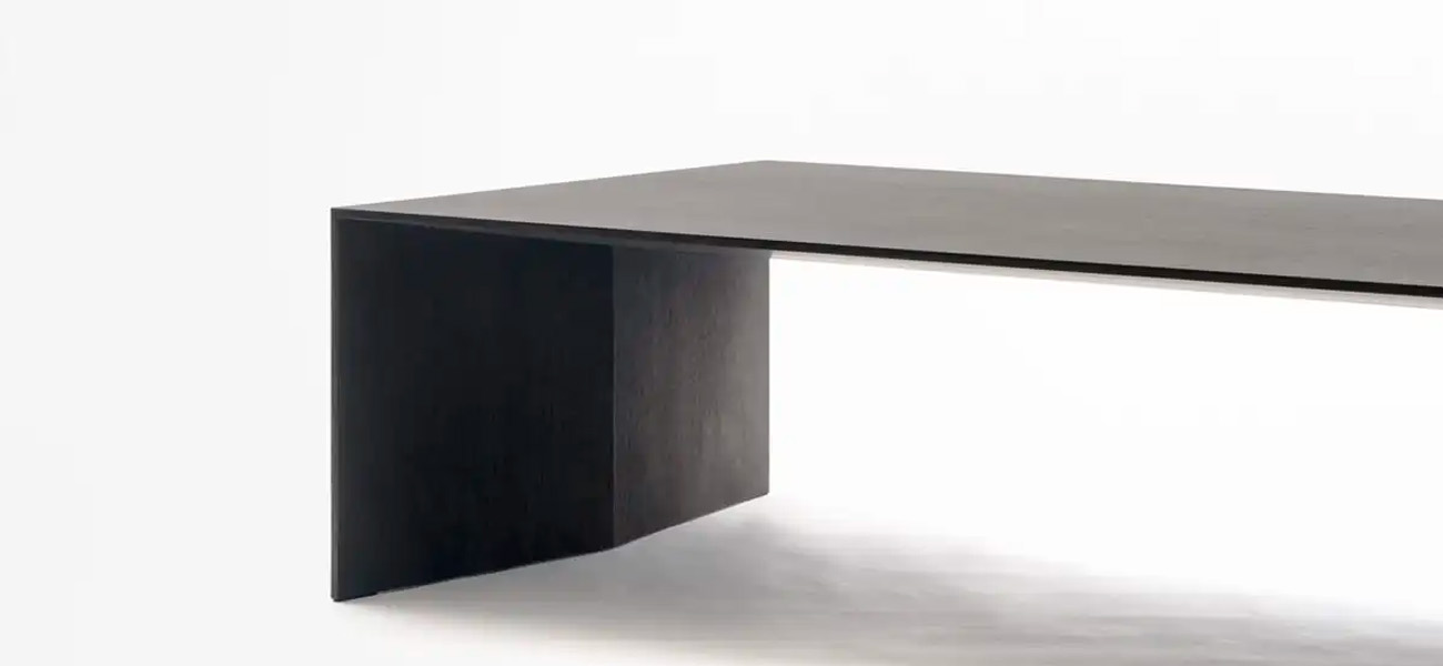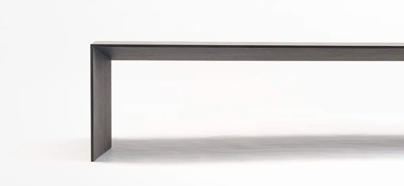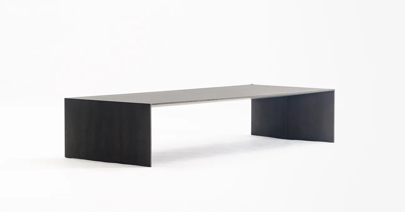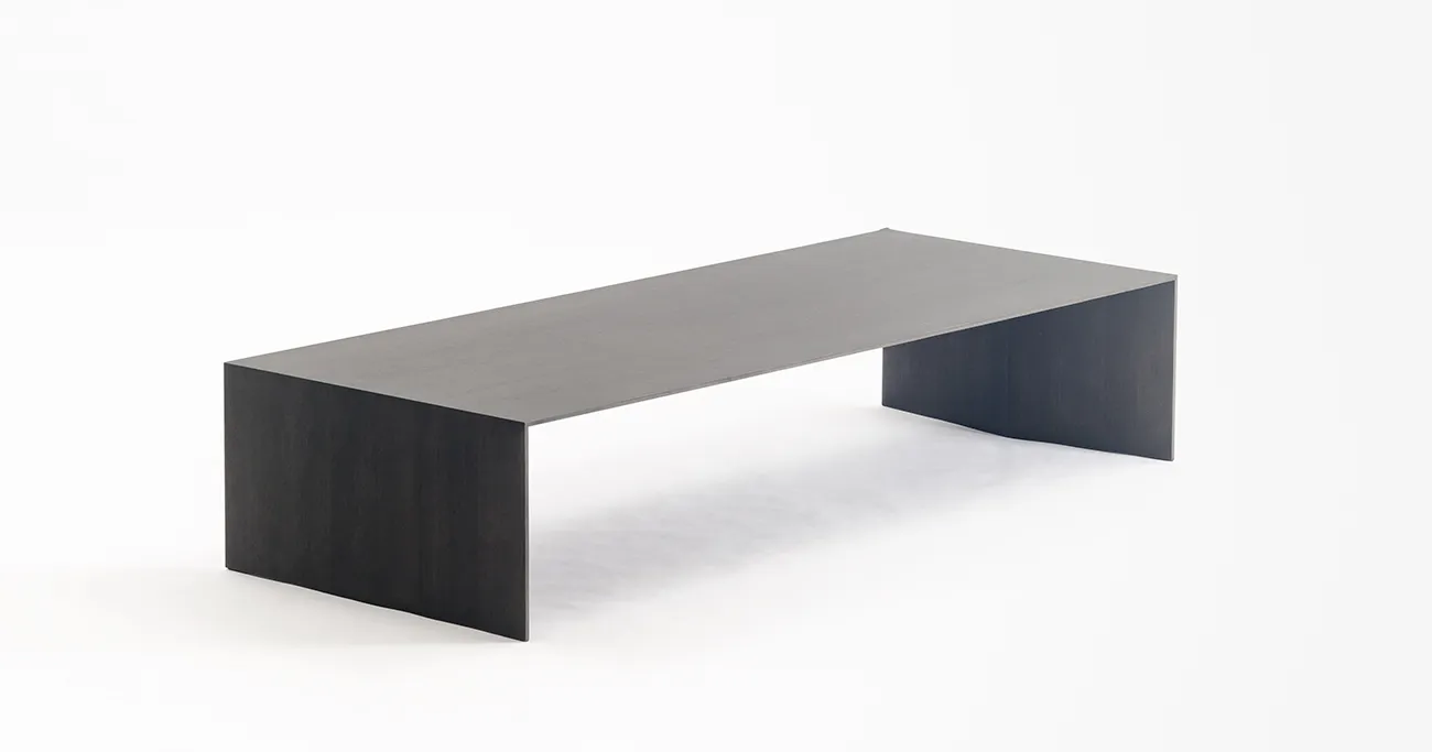 木質のテーブルに薄さと強度を出すために、芯材にアルミハニカムパネルを使って突板や木目シートを貼り付ける製作方法があります。しかし、私たちは隈研吾氏の建築に寄り添うように、木工のみで限りなく薄く、シャープな印象のデザインを実現することに挑みました。