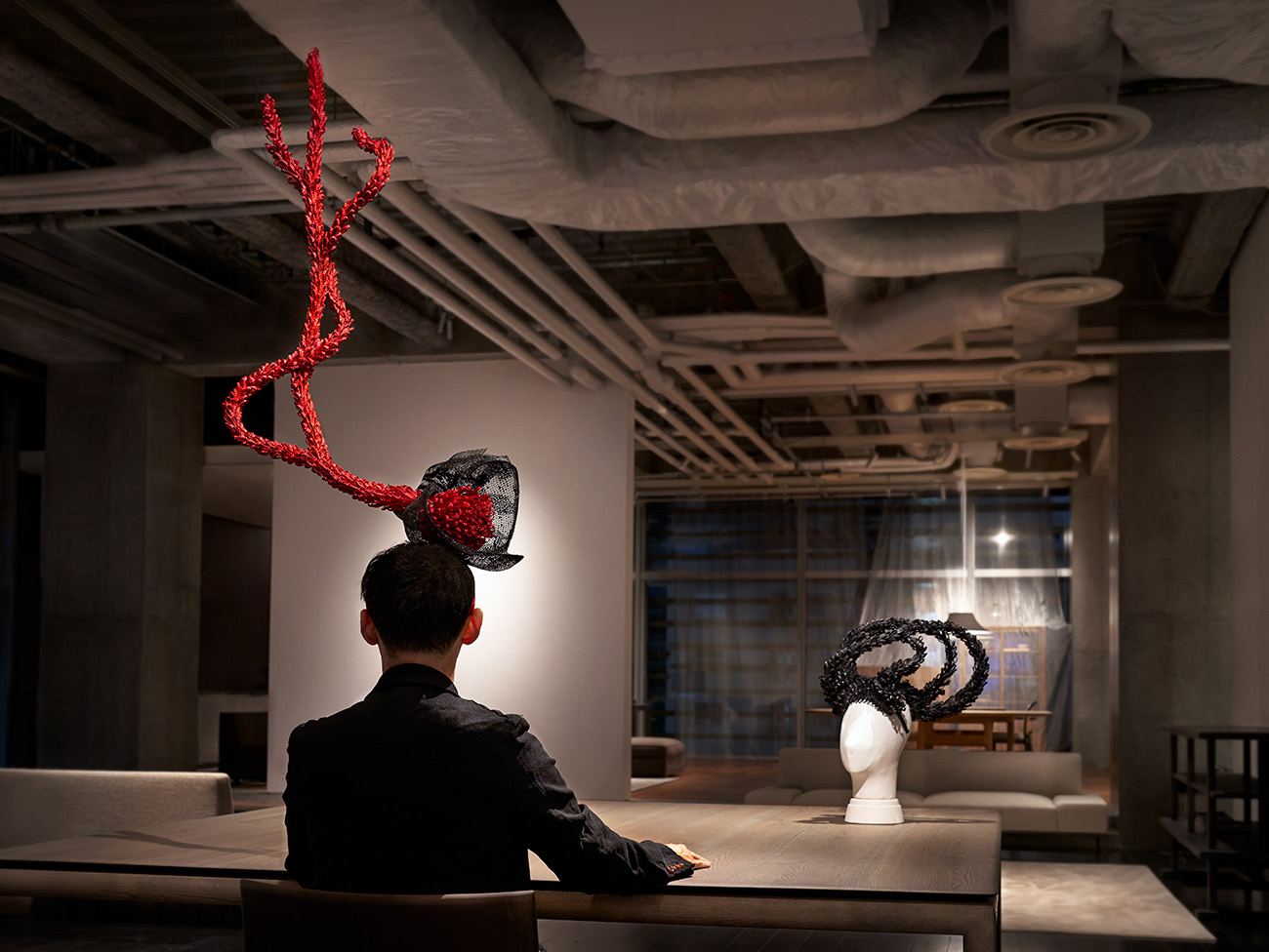 彫刻的な帽子を作るスソアキコが、家具・照明・テーブルウエアが並ぶ静的な空間の中で、動きのある展示表現に挑みます。作品に触れ、被ることを通して、見ることだけでは感知できない変化を体感していただきます。