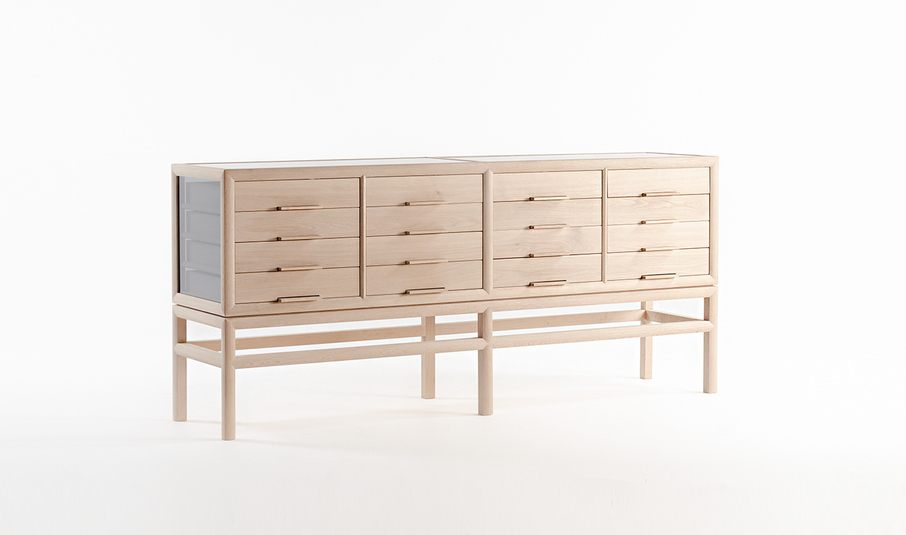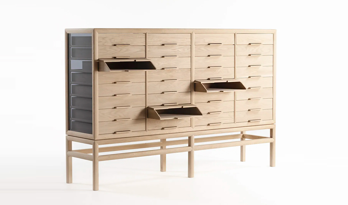前板のつまみを引くと、中の木製トレーが引き出されます。これに連動して上開きのフラップ扉も緩やかに上がります。この仕掛けは日本の古い道具のアイデアに倣いました。職人たちの知恵を基に、単純な機構による機能的な収納家具を作ろうと考えました。木製トレーを引き出 時、木が擦れ合う音が、心地よい感覚を呼び覚まします。