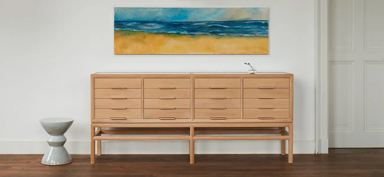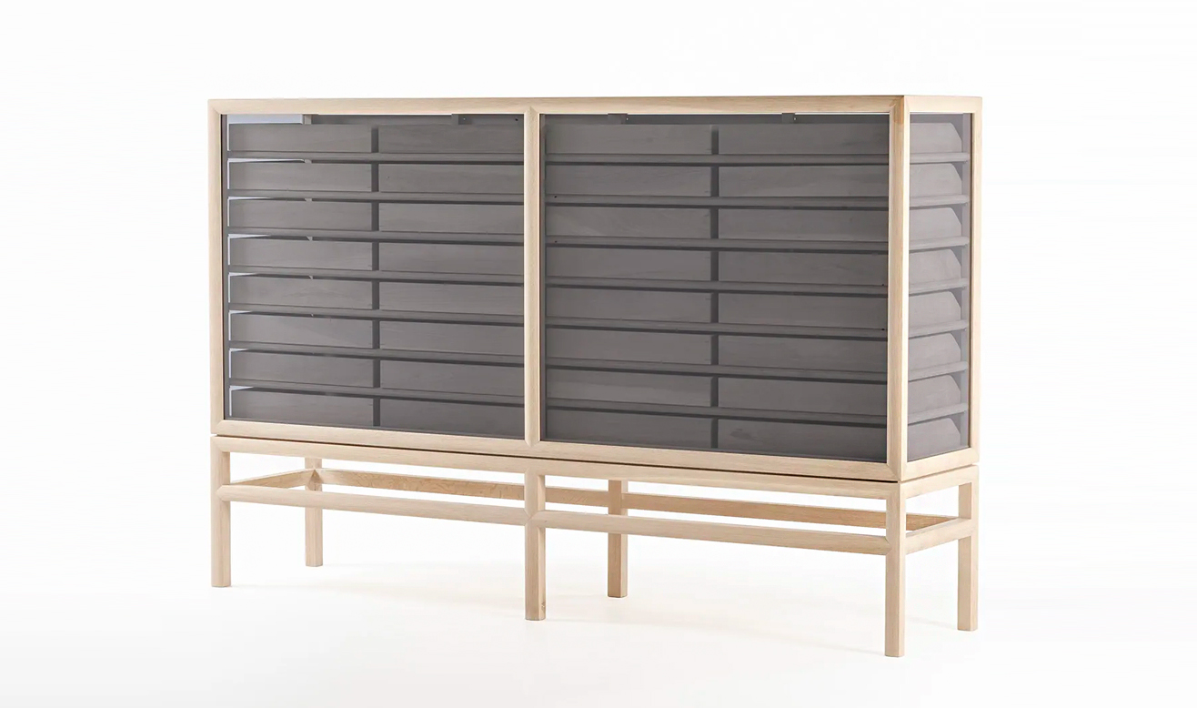 キャビネットの側面と上面、背面にはスモークガラスをはめ込んで、中のトレーとフラップ扉の動きが見えるようにしました。また、ガラスと組み合わせることで、工芸的な要素だけでなく、現代の生活に溶け込みモダンな空気を持ちます。書類のほかにオブジェやジュエリー、シャツなど、大切なコレクションを収納して自由に使ってほしいと思います。