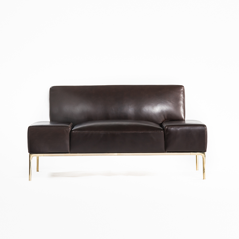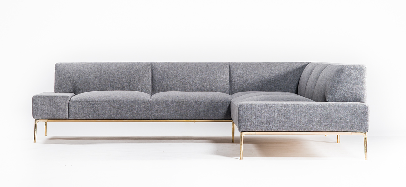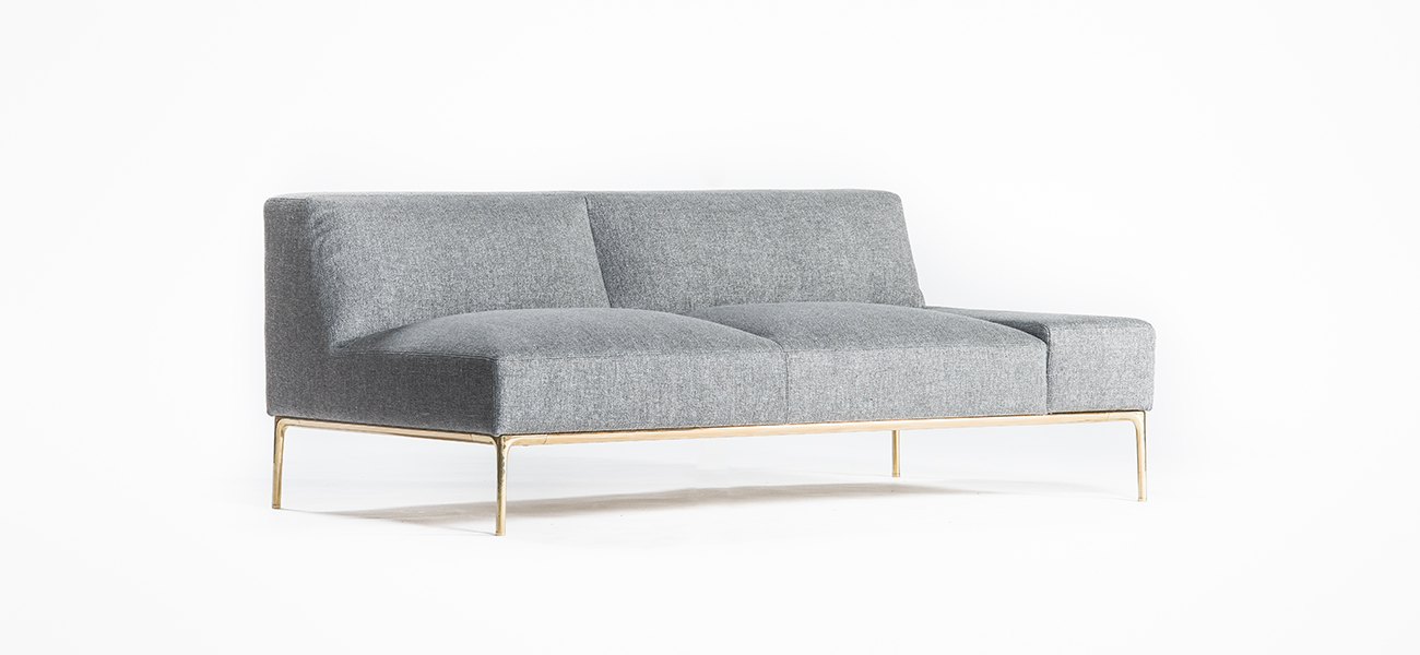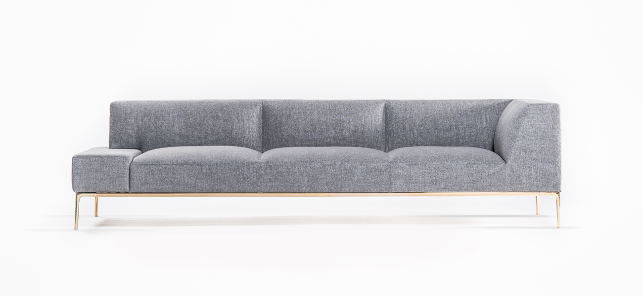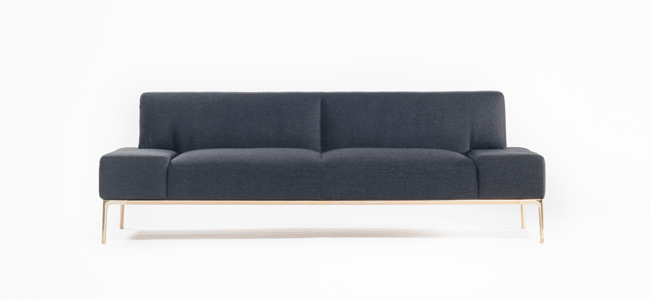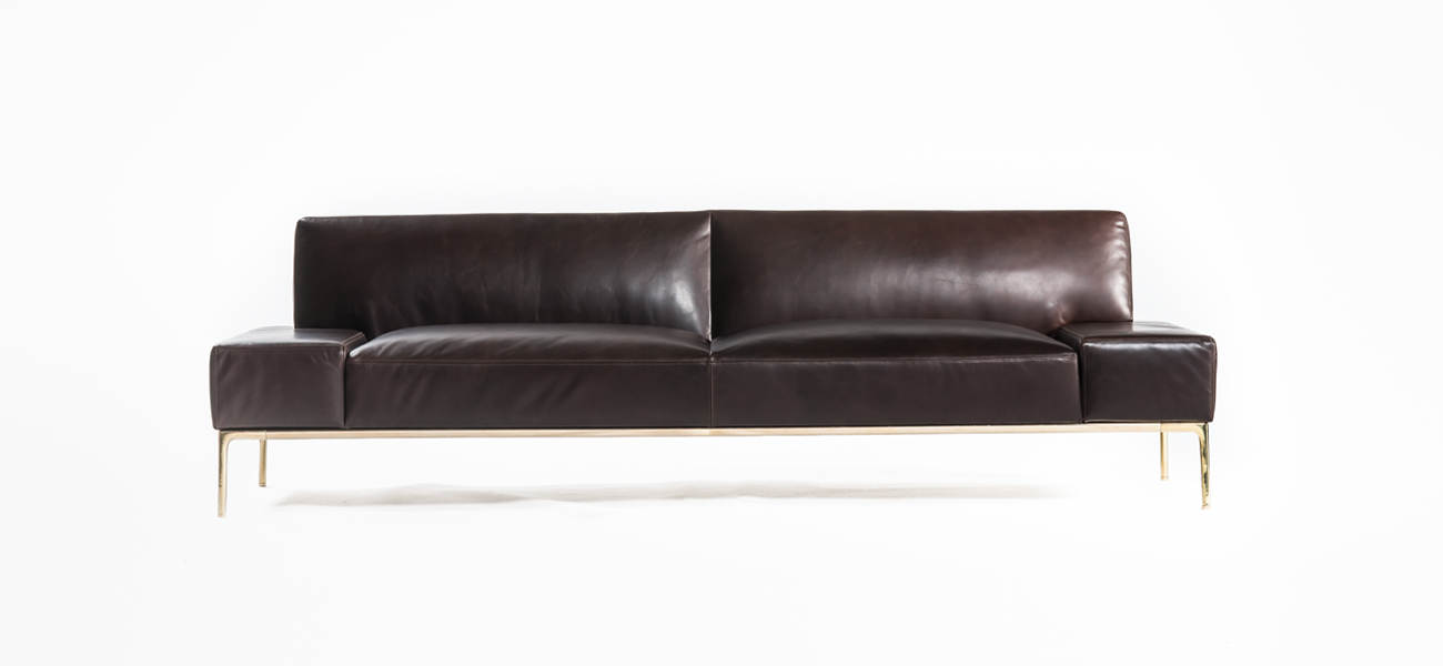 このソファの新規性の一つは、真鍮の脚とその脚を繋げる貫です。それぞれ異なる製造方法による脚と貫を組み合わせて、美しい有機的な曲線と曲面が融合したベースが出来ました。このベースの脚によって真鍮の艶のある表情が品格と華やかさを生み、ソファ全体が浮かび上がったような軽快感を作り出しています。