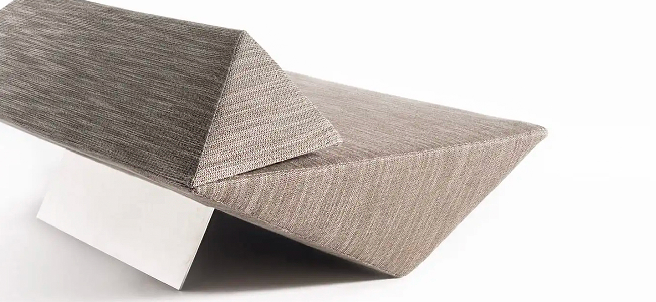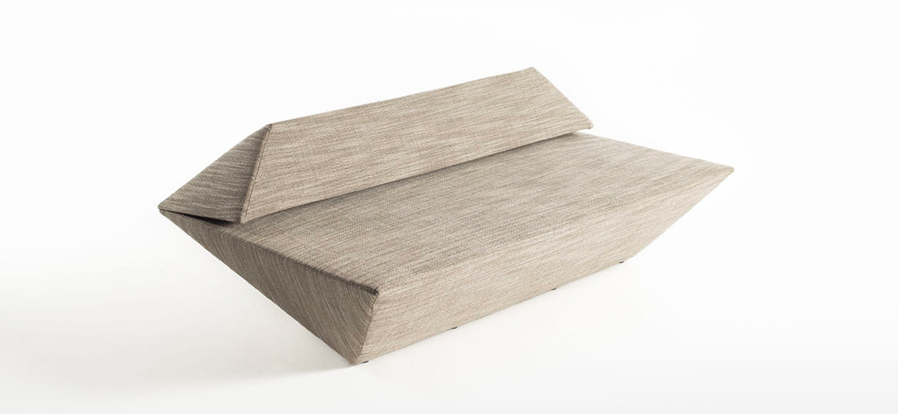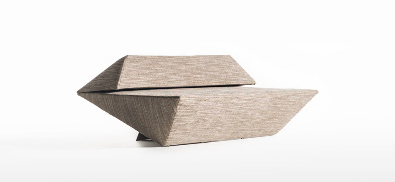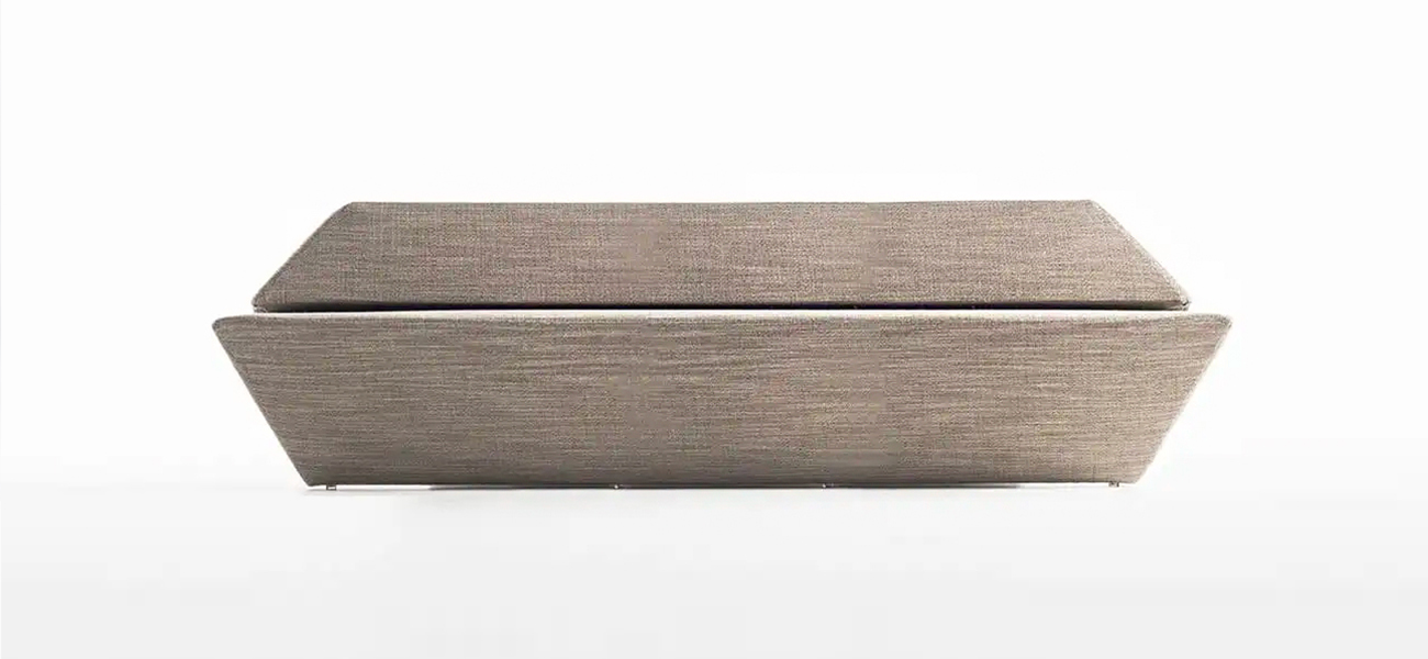 このソファは隈氏の建築に呼応するかのように、座面以外はすべて角度がついた面で構成されています。端部のシャープな形状を維持しながら、ソファに求められるクッション性を両立させました。薄いプレートの脚は、できる限り本体の内側に配置することでその存在感を消し去りました。空間の中に三角錐が浮いたように存在する彫刻的なソファが完成しました。