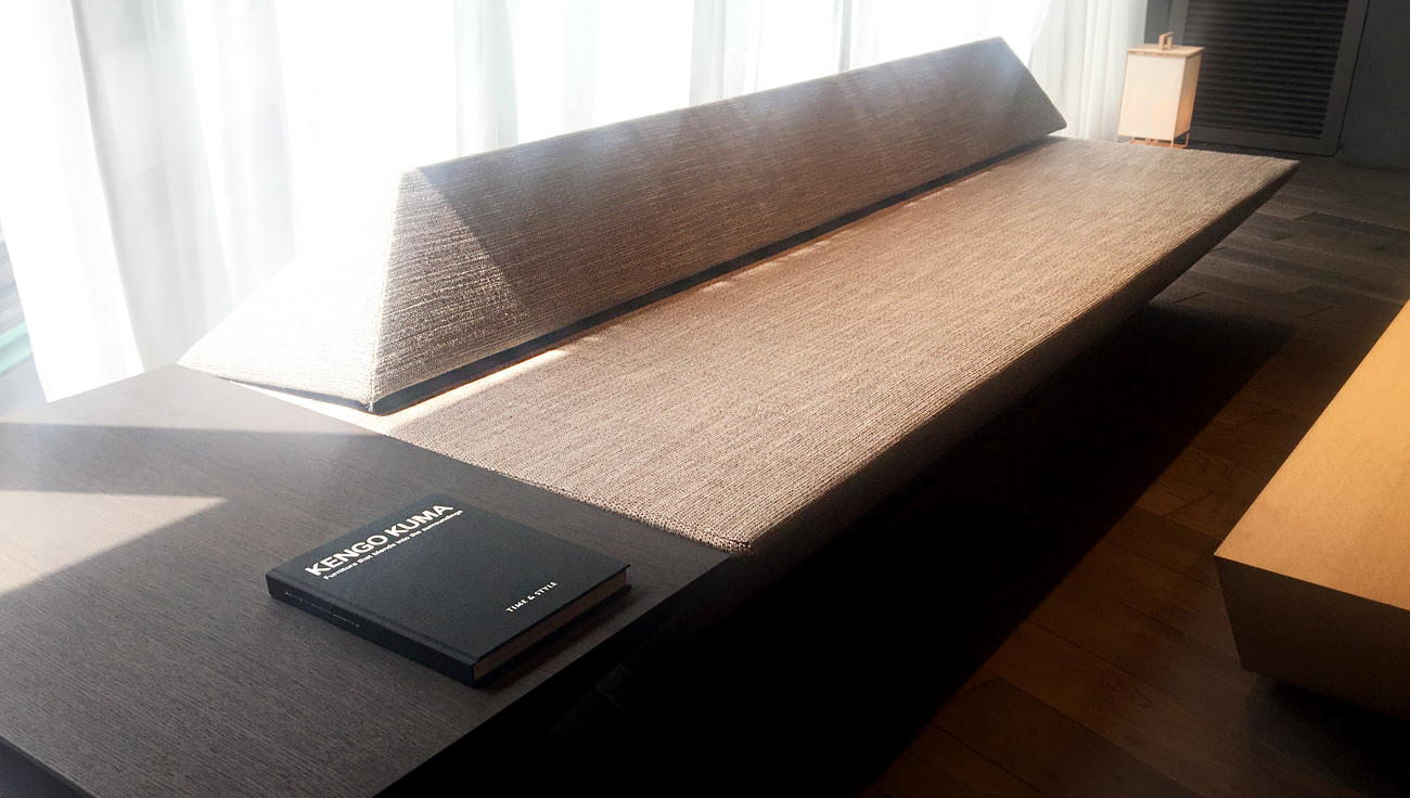 KAは隈研吾氏の建築と密接な関係性を持ったプロダクトだと言えます。隈氏の建築では水平でフラットな天井や壁があまり存在しません。繊細な素材で多面的に構成されたり、木組みのモチーフが使われ、陰影が奥行を感じさせます。