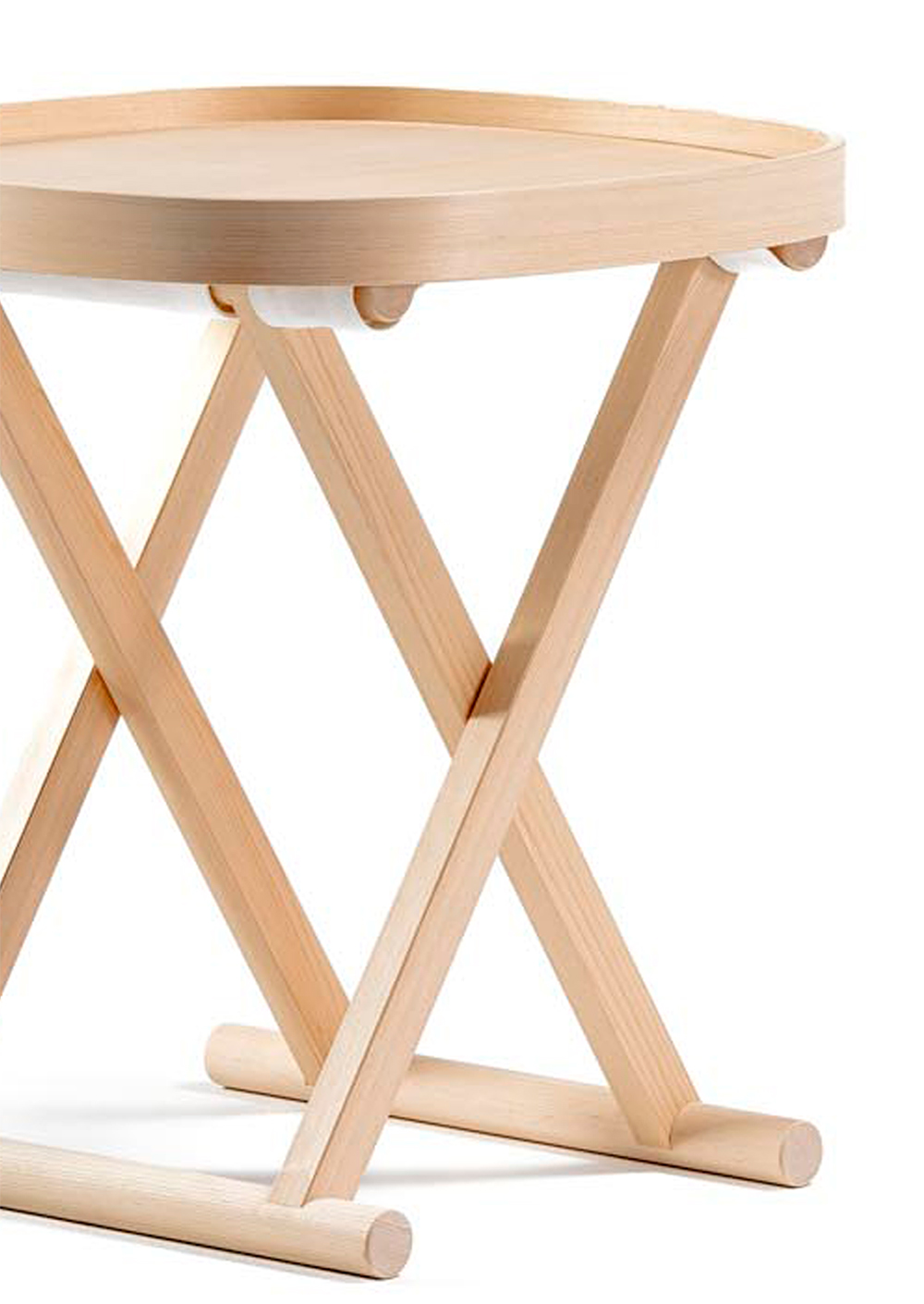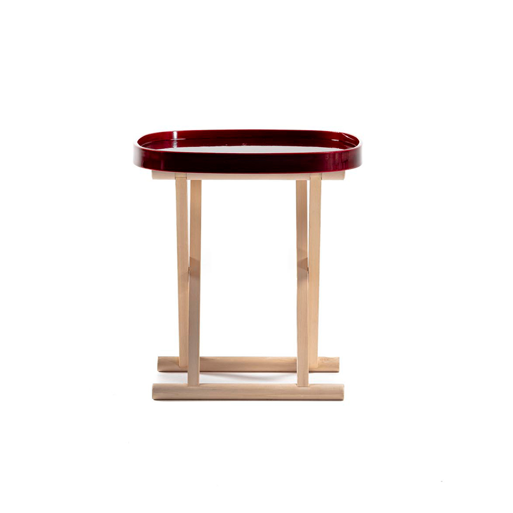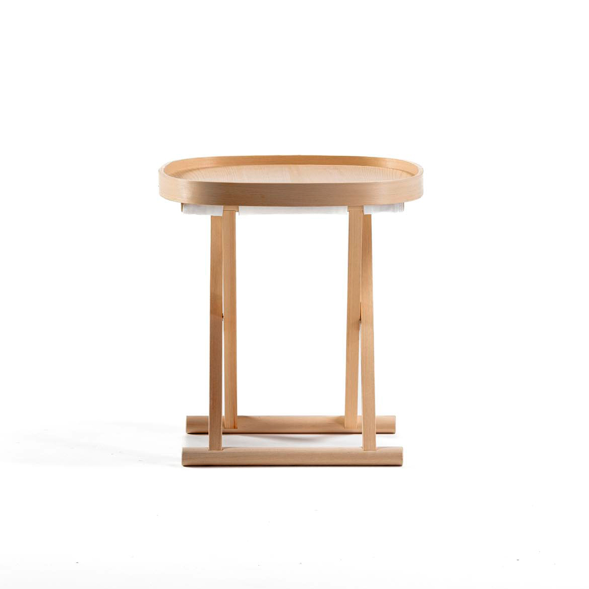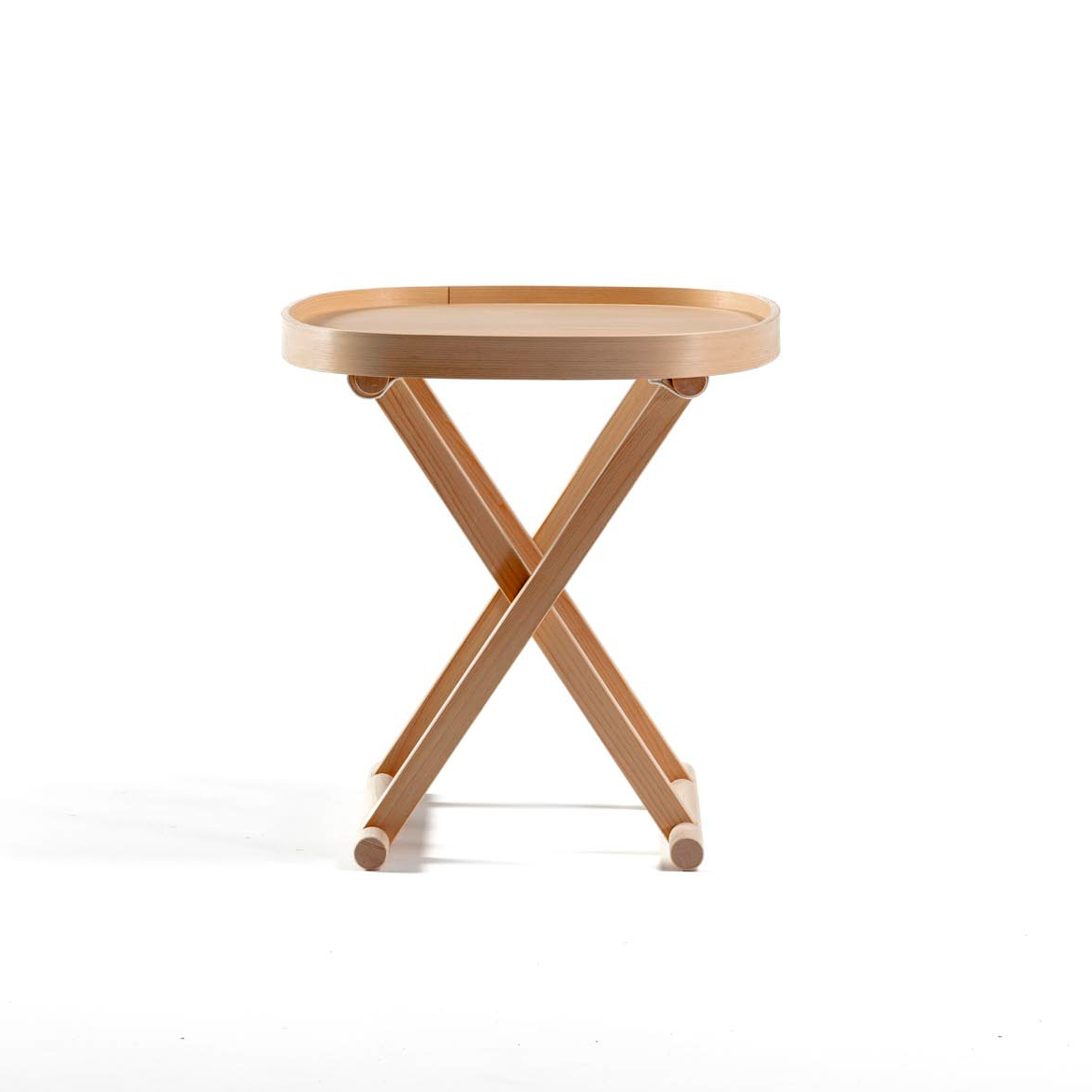 岐阜県中津川で木曽檜だけ製材している製材所を訪れた時に、木曽檜の木目の肌理の緻密さや美しさ、その繊細な表情を見て、木曽檜の家具を作りたいと思いました。日本独自の折り畳み椅子である胡床にお盆を乗せたサイドテーブルです。