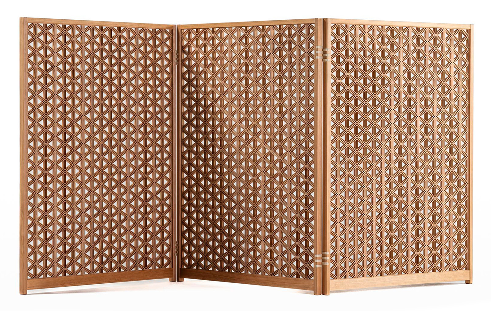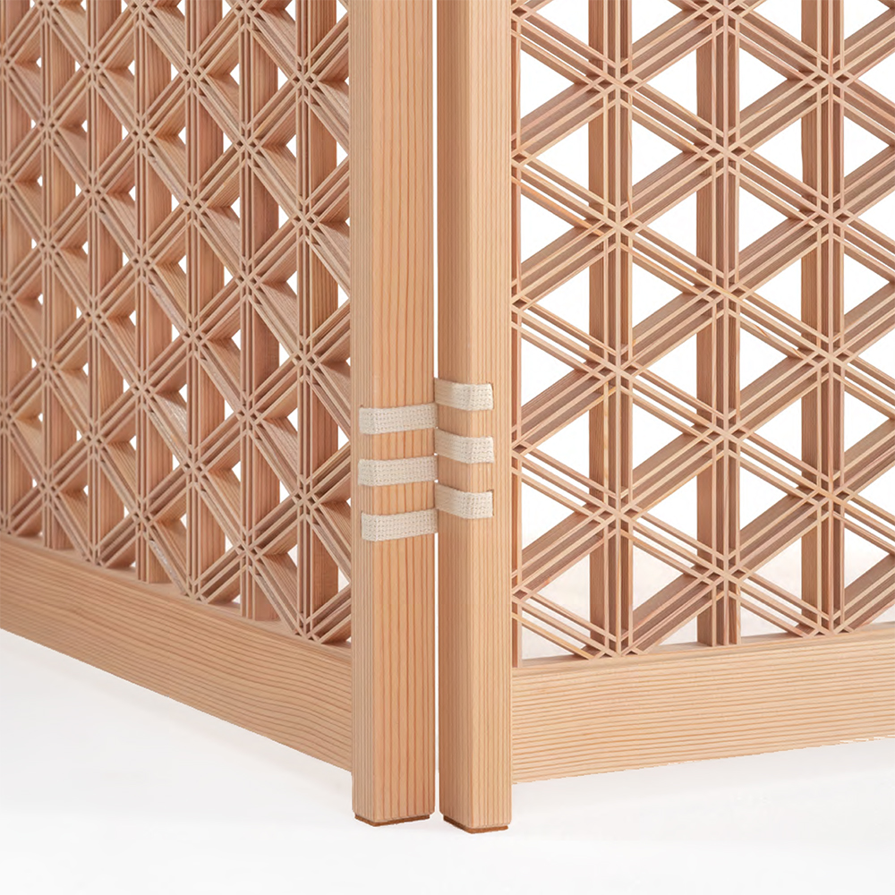 このパーティションは良質な杉材を使用しフレームを極限まで細くすることで、組子紋様の美しさを際立たせるシンプルなデザインを追求しています。特に金物を使わずに製作された紐丁番により、表裏自在に可動する折りたたみ部分が特徴です。