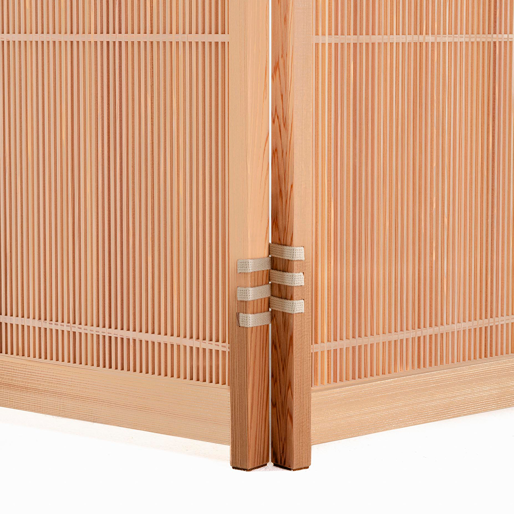 このパーティションは良質な杉材を使用しフレームを極限まで細くすることで、組子紋様の美しさを際立たせるシンプルなデザインを追求しています。特に金物を使わずに製作された紐丁番により、表裏自在に可動する折りたたみ部分が特徴です。