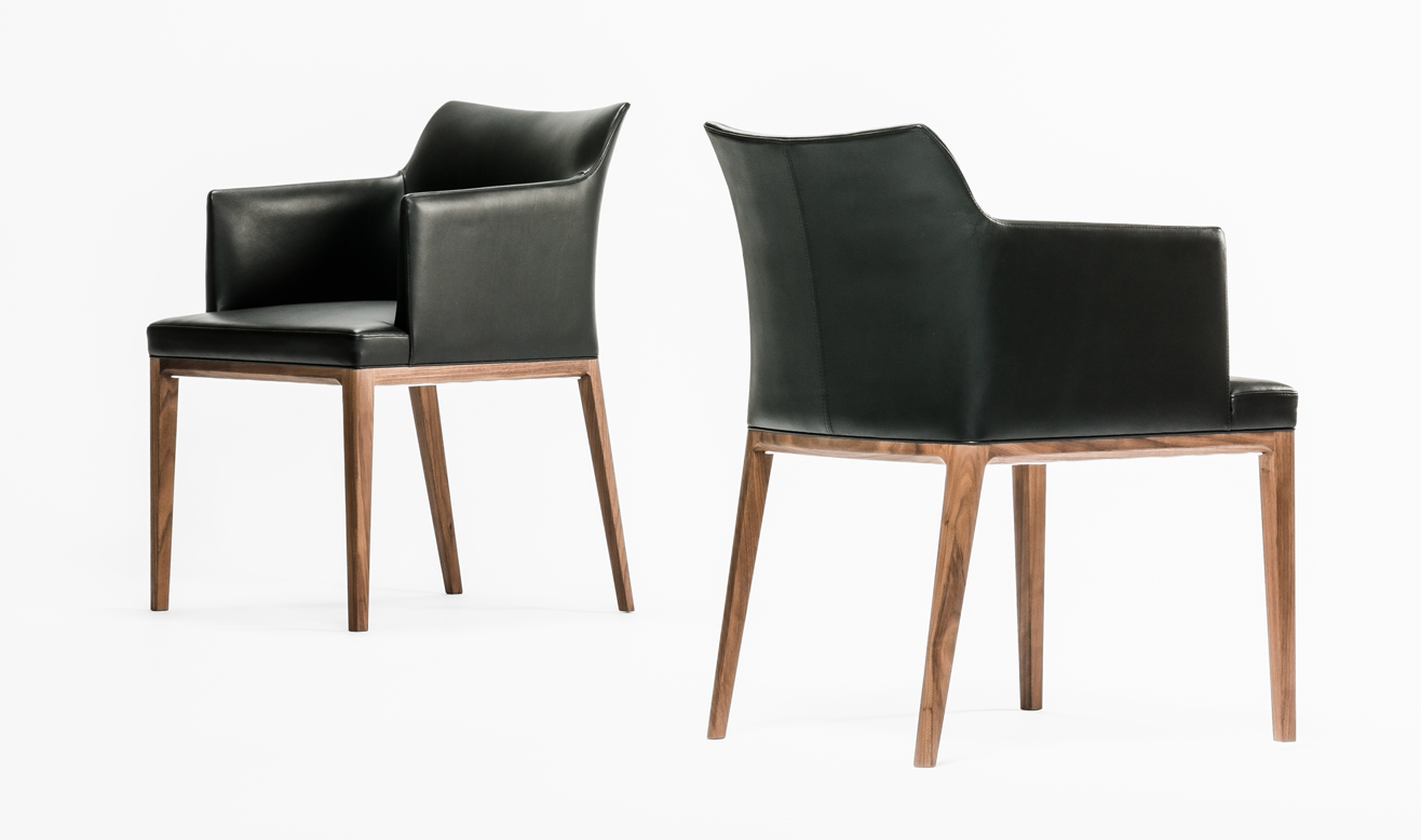 アームが短くなることで座面が側面から見え、よりスタイリッシュで動きのある佇まいが生まれました。機能面においては、テーブルにセッティングした時に立ち座りのストレスがなく、スムーズな掛け心地が得られます。
