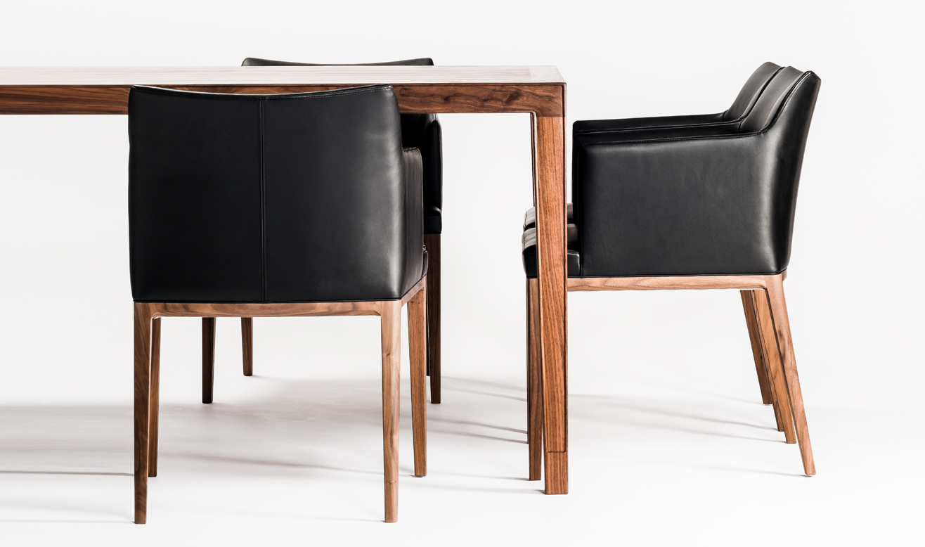 また、後脚を繋ぐ座枠に大きなカーブを付けることで背もたれの形状に丸みを持たせ、これまでのアームチェアよりも上質な質感と品格を生み出しています。ふくよかでゆったりと座ることができるようになり、ダイニングチェアとしての機能性を高めることにも繋がりました。