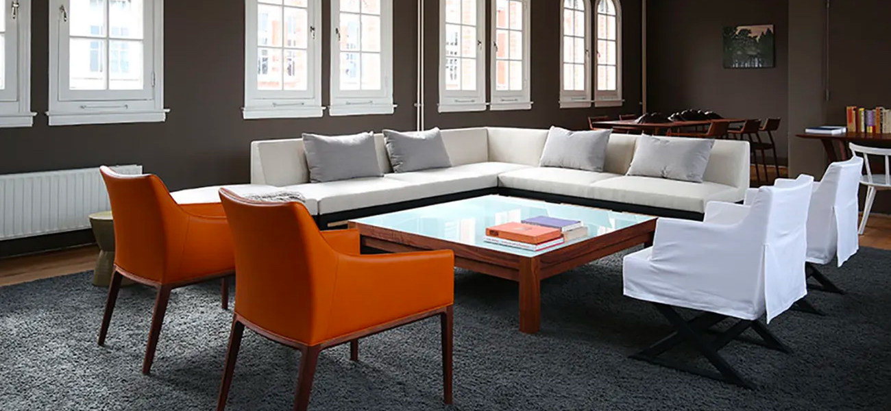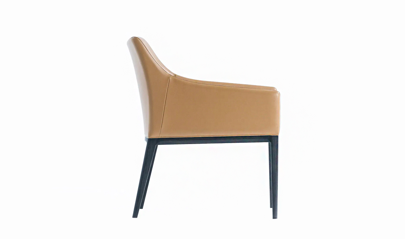 このラウンジチェアは、アームの先端を摘んだように、1 本のステッチラインで繋ぐことをデザインのポイントとしました。ステッチラインはアームの先端からシェルのトップをぐるりと一周して脚へと繋がります。シェルと脚の境界線にはパイピングを施し、全体を引き締めました。