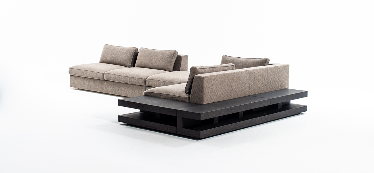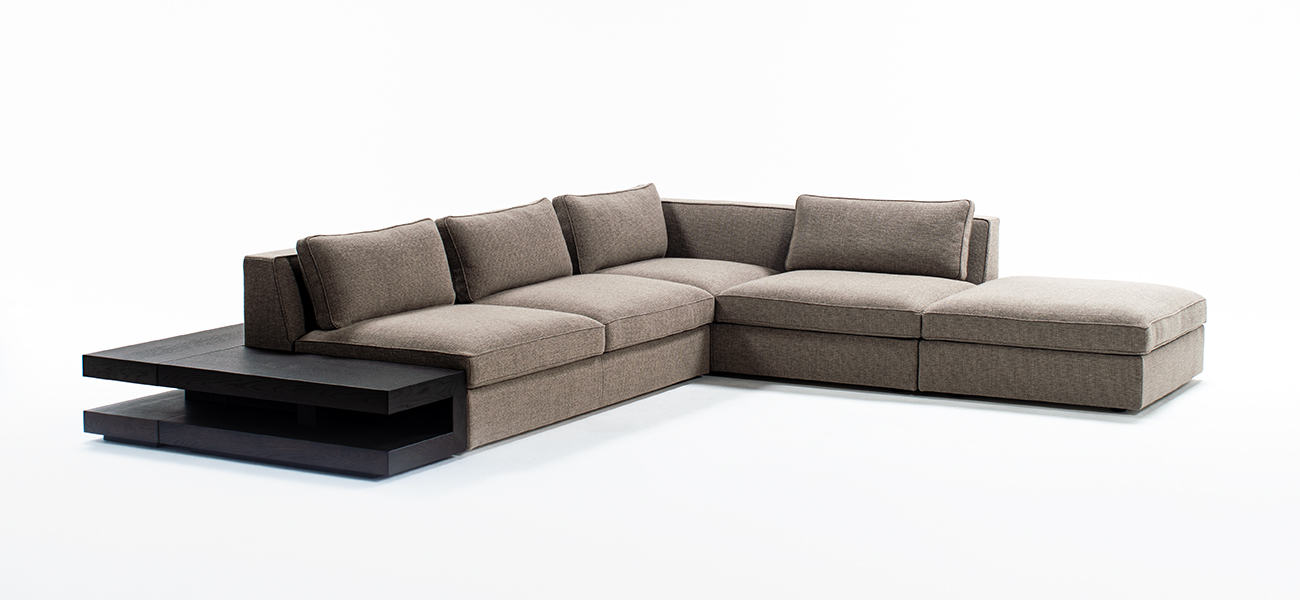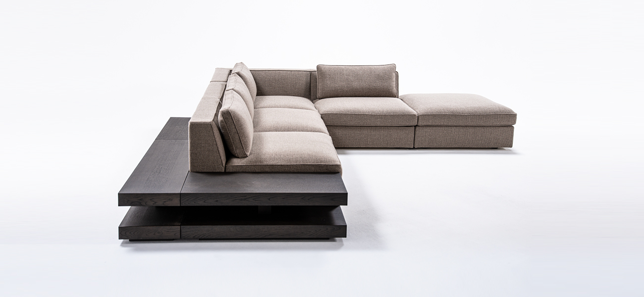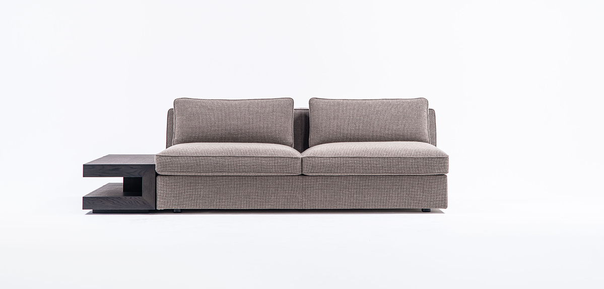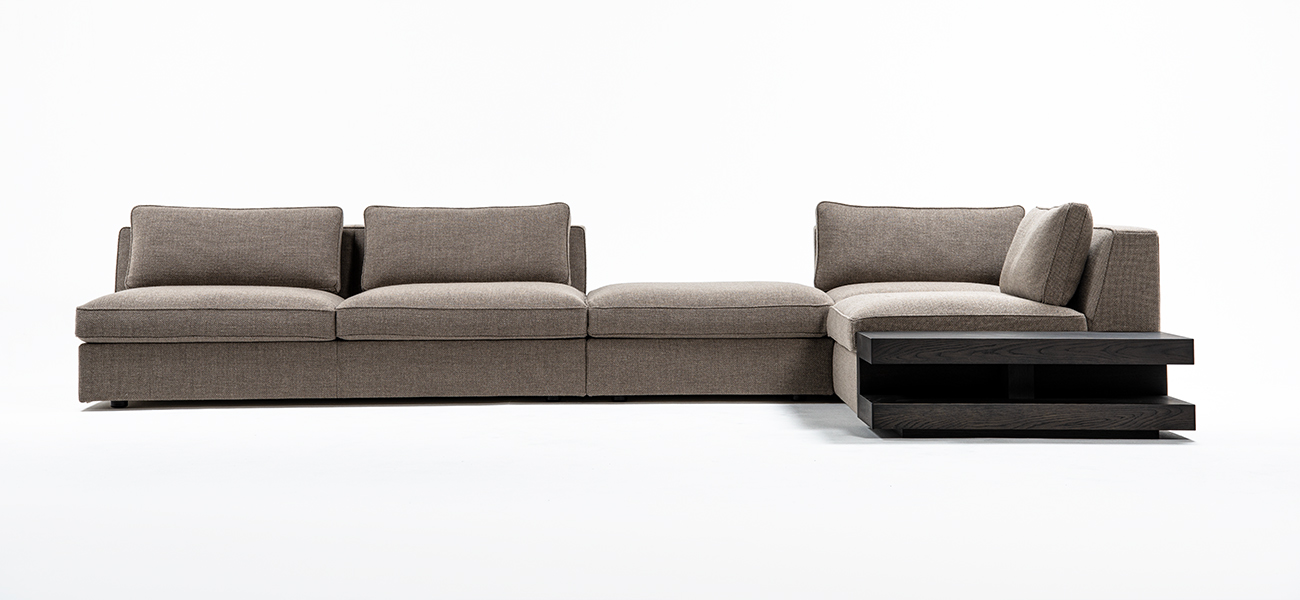 全身の力を抜いて身体を預けることができる快適性を、スタンダードデザインのソファの中で追求しました。本体の座面はベースシートとシートクッションの 2 層で構成し、ベースシートの内部にはウレタンを積層して適度な弾力を持たせています。シートクッションの芯材にはウレタンフォームを使用し、その芯材を化繊綿で包むことでソフトな感触を作りました。同じ内部構造の背クッションを添えることで、座面と背中面の弾力を近づけ、座った時に身体全体を同じ柔らかさが包み込みます。また、ソファのサイドや背面に設置するテーブルを選ぶことがで きます。テーブルを組み合わせることで伸びやかな広がりのある空間を作り、多様な表現を可能にします。