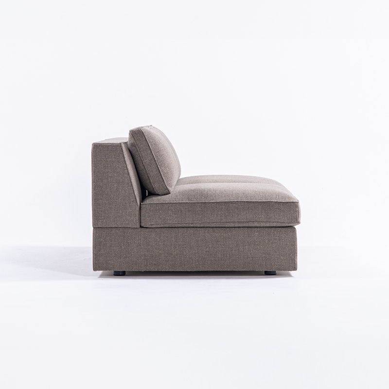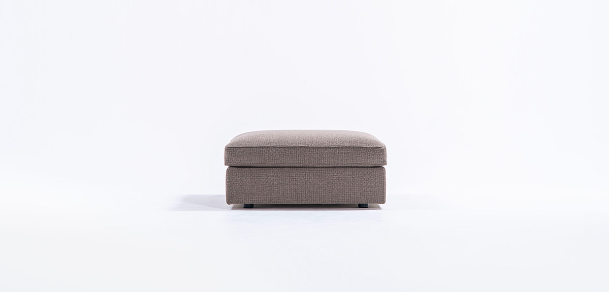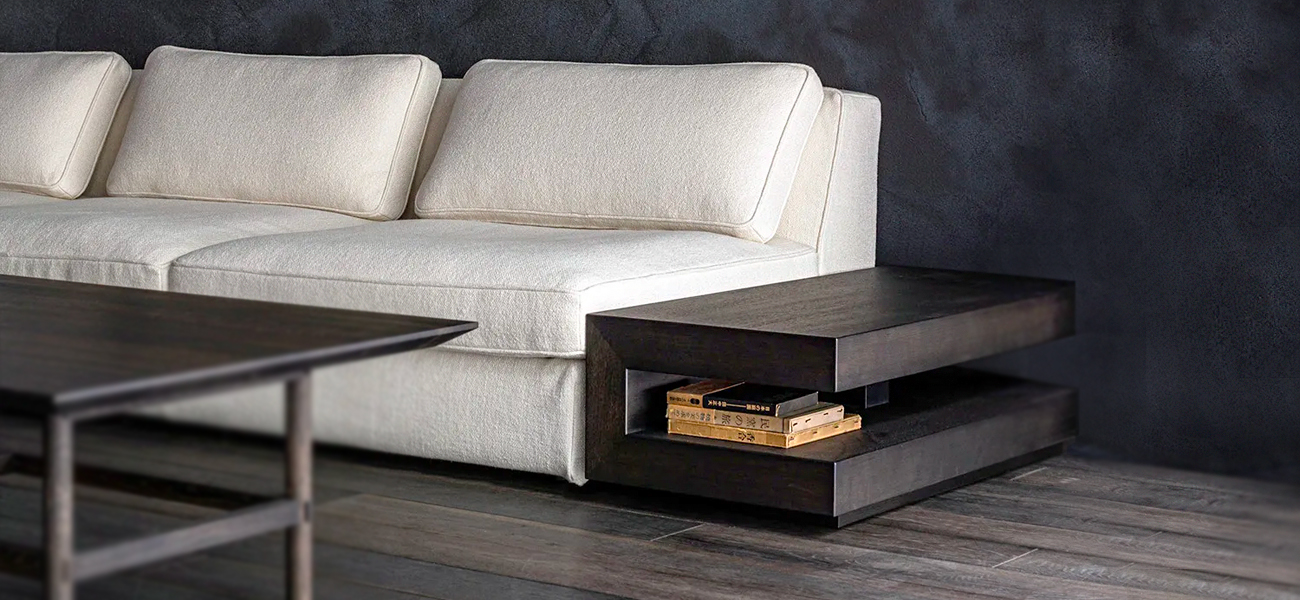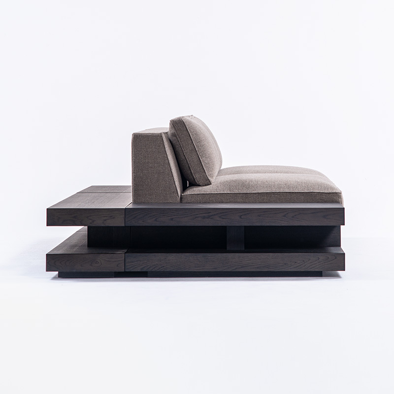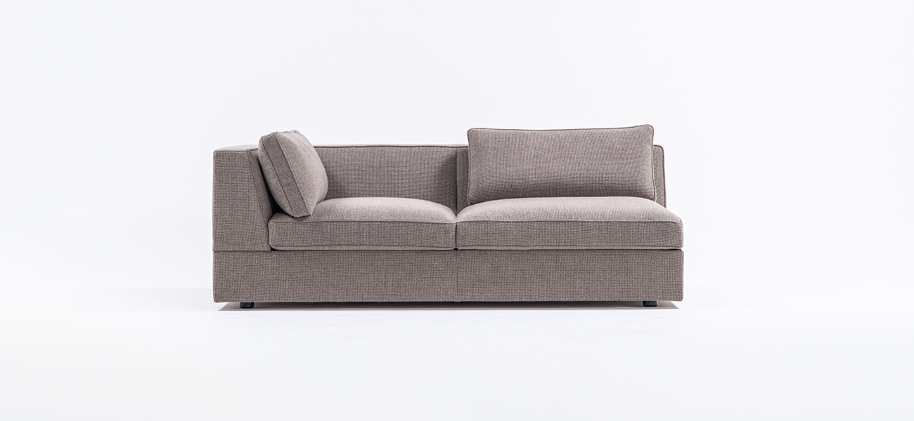 全身の力を抜いて身体を預けることができる快適性を、スタンダードデザインのソファの中で追求しました。本体の座面はベースシートとシートクッションの 2 層で構成し、ベースシートの内部にはウレタンを積層して適度な弾力を持たせています。シートクッションの芯材にはウレタンフォームを使用し、その芯材を化繊綿で包むことでソフトな感触を作りました。同じ内部構造の背クッションを添えることで、座面と背中面の弾力を近づけ、座った時に身体全体を同じ柔らかさが包み込みます。また、ソファのサイドや背面に設置するテーブルを選ぶことがで きます。テーブルを組み合わせることで伸びやかな広がりのある空間を作り、多様な表現を可能にします。