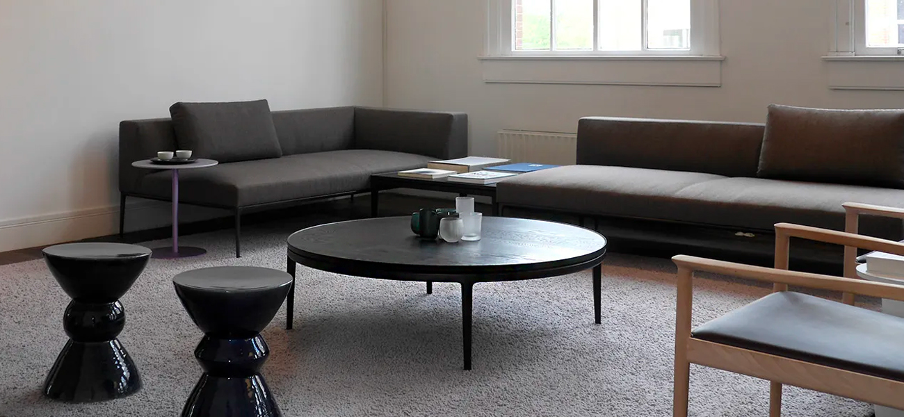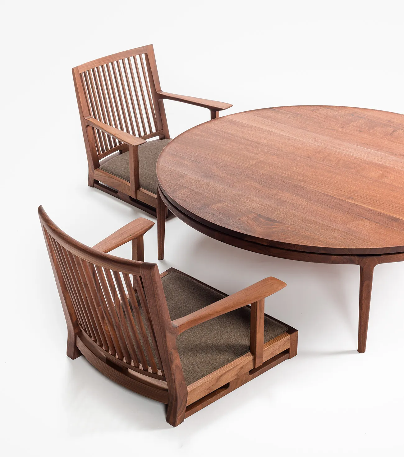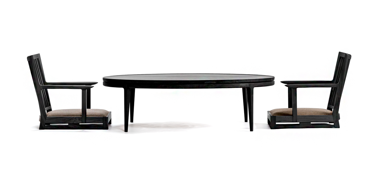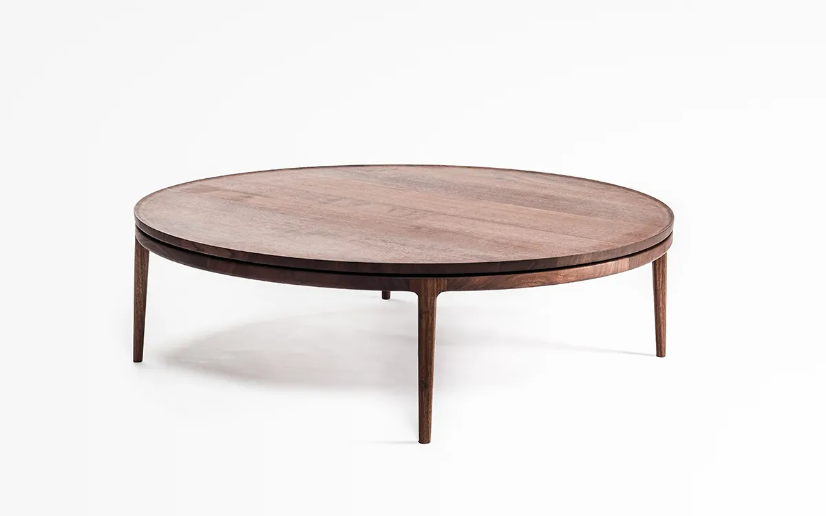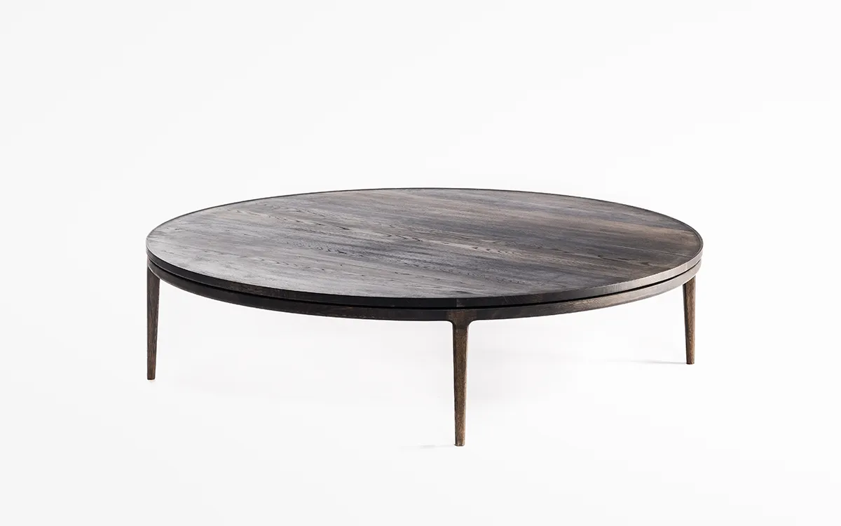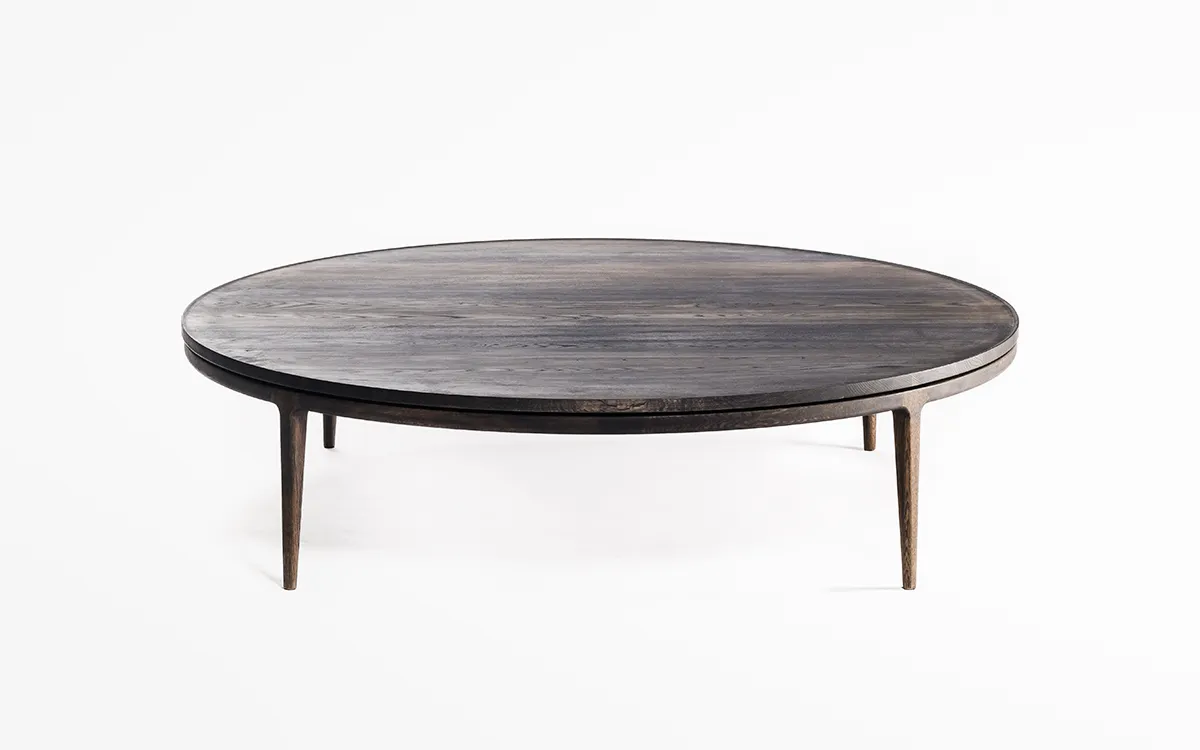 丸い無垢材の天板の内側を薄く削り出し、縁にリムが立ち上がったローテーブルを作りました。削り出された天板の美しい滑らかな表面は、職人の丁寧な研磨によるものです。素手で木材に触れながら感触を確かめて仕上げていきます。天板を支持する円弧を描く貫も無垢材を削り出して繋いでいます。リムによって縁取りされた天板は、大きな蓮の葉をイメージしました。