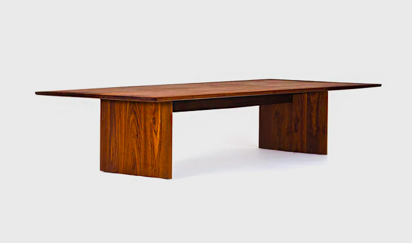 無垢材を削り出して縁取りされた天板が静かに際立つように、天板と 2 枚の脚と天板を支える幕板の 4 つの部材のみの簡素な要素で構成しました。神社の鳥居のような形状をした、シンプルな存在感を持つローテーブルです。空間に密度のある意匠性と削り出した木材の奥行き感が醸し出されています。