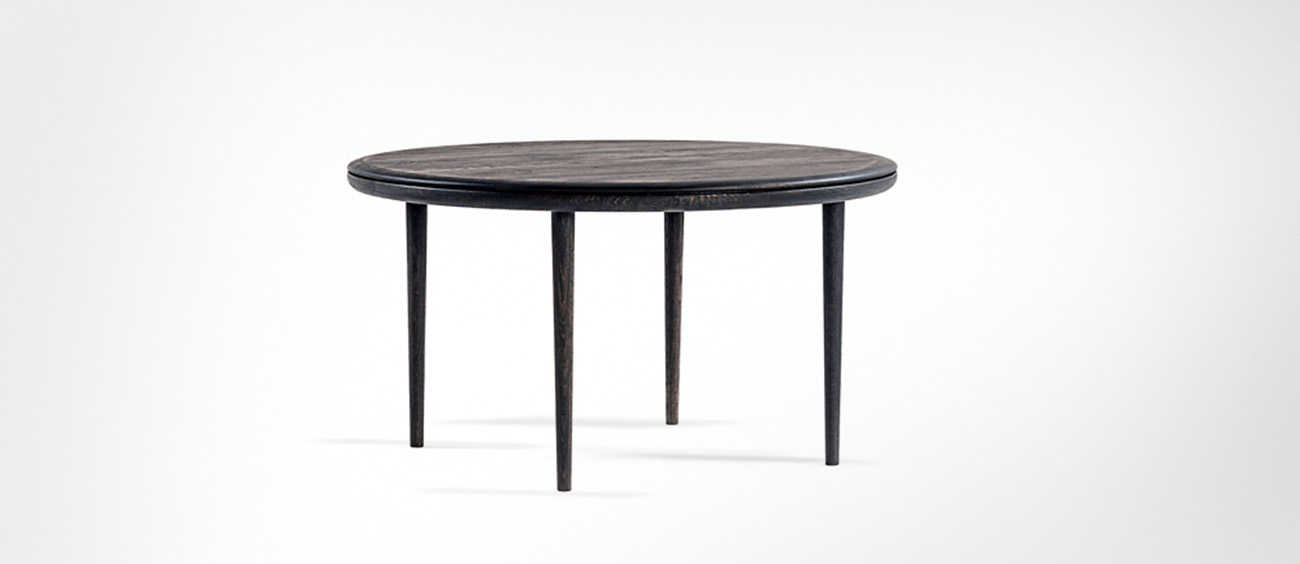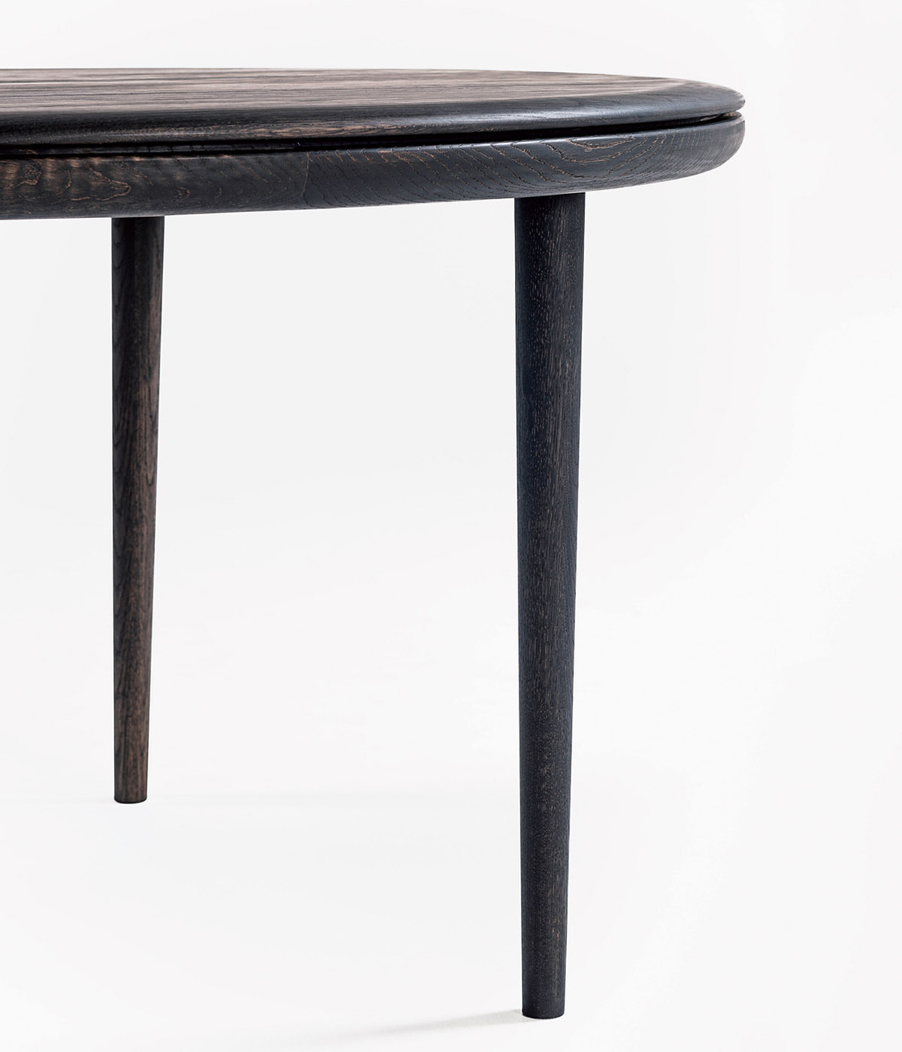 天板とそれを支えるフレームを上下対称に削り出した形状は、手加工と機械加工を駆使して精度を高めました。手に触れる部分は全て無垢材を曲面で丁寧に仕上げています。シンプルで柔らかな印象は、多様な空間と幅広い椅子との親和性があるテーブルです。内側にセットバックした脚は、高度な技術で組まれたフレームにノックダウン式で取り付けられています。