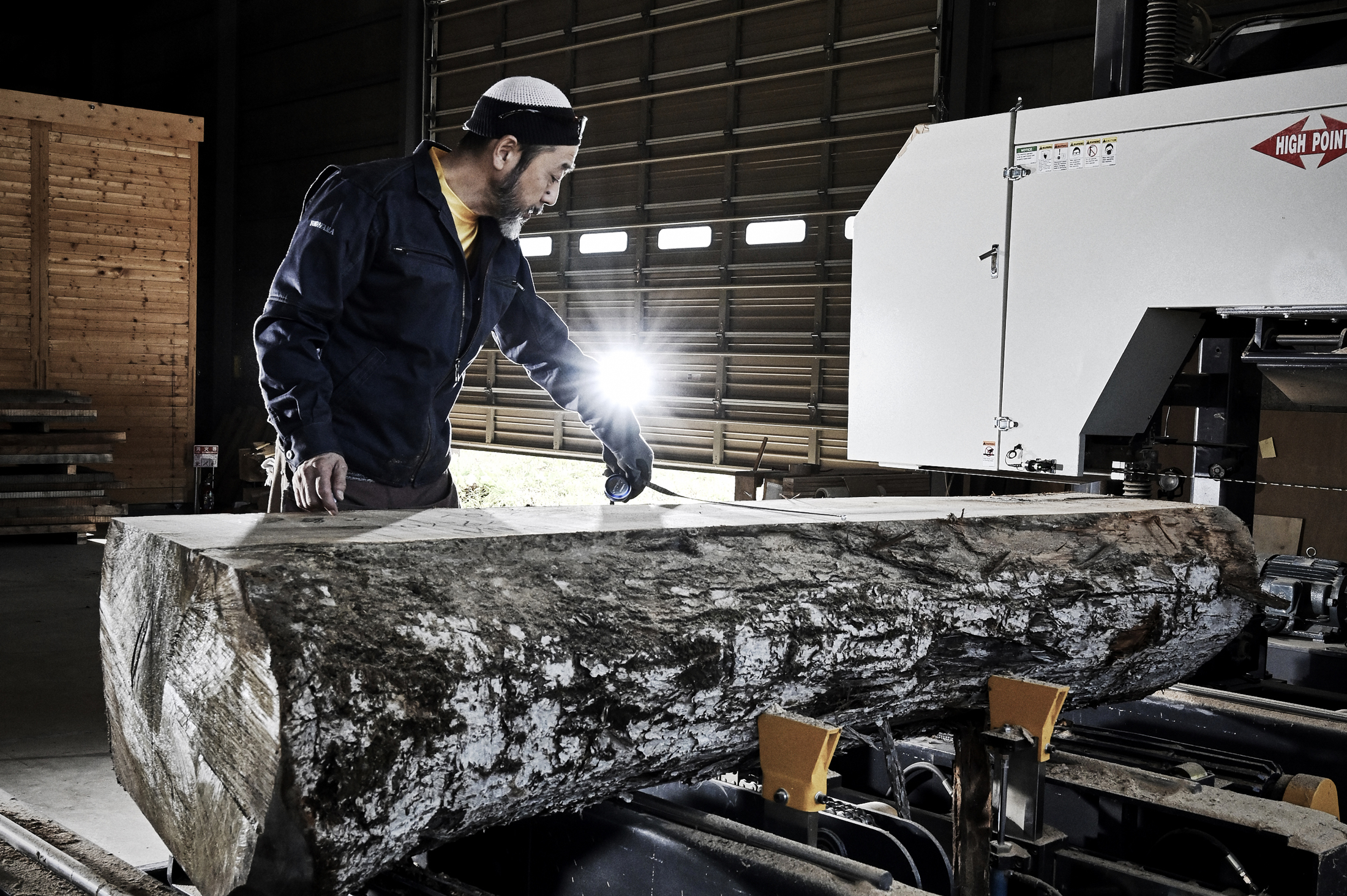揺るぎのない製品を作るには、素材選びが最も重要です。私たちは、これまで家具として使われることのなかった樹種や市場では取引されない曲がった丸太や二股に分かれた木材なども積極的に仕入れています。日本全国の材木市場に足を運び、原木を自らの目で選び、昔ながらの乾燥や加工方法にヒントを得たり、試みられなかった技術に挑みながら、これまで関心を持たれることのなかった材料にも新たな価値を作りたいと考えています。多種多様な樹種に恵まれた日本で、素材の個性を生かした製品づくりに取り組んでいます。