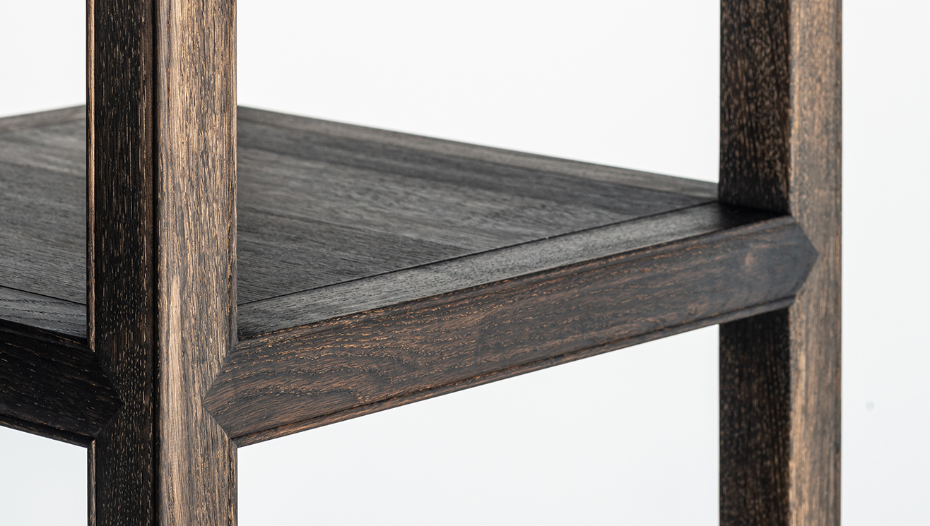 この Mingle シリーズは、王朝時代の調度品として献上された家具の意匠を踏襲しています。フレームに繊細な玉縁を施すだけの控えめな意匠ですが、丁寧なものづくりの技術によって、静かな存在感を持っています。東洋の歴史的背景と混ざり合い、日本の木工技術によって現代の生活空間と融合する形を見出しました。