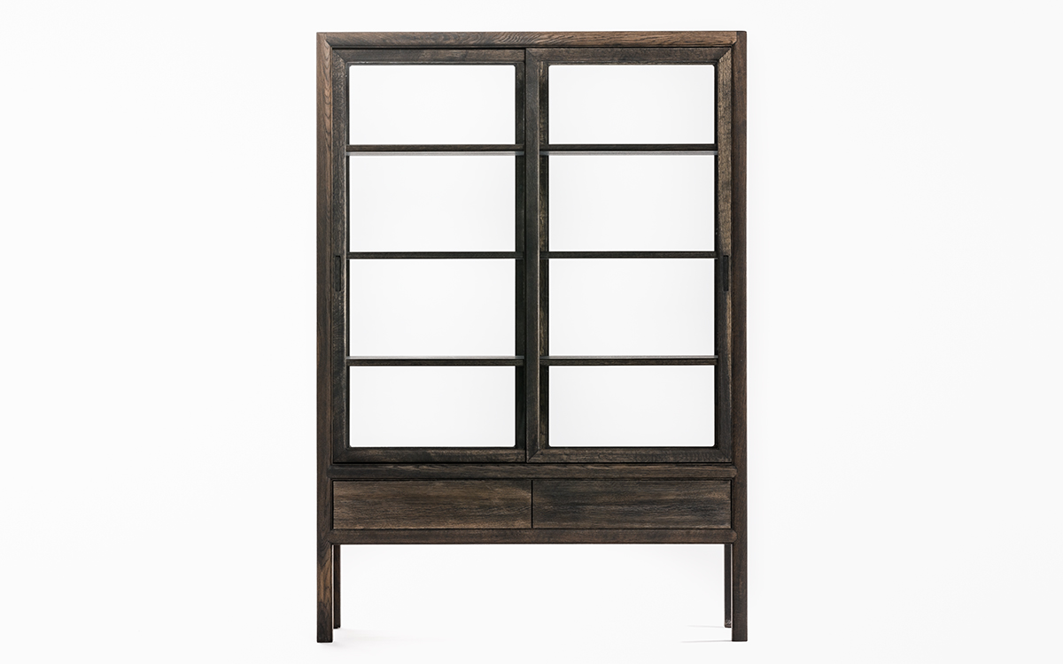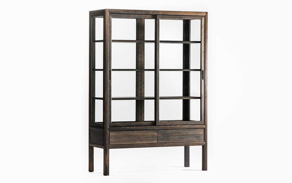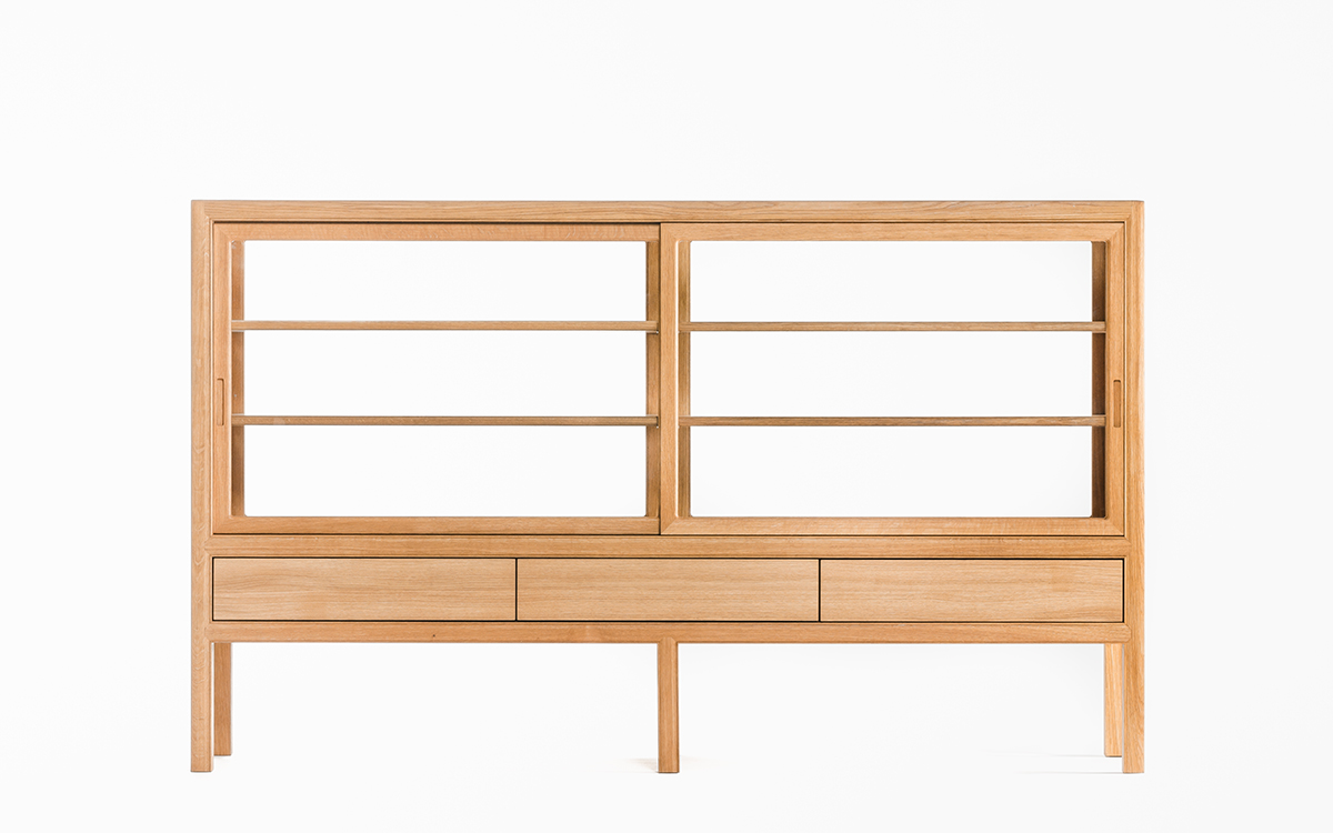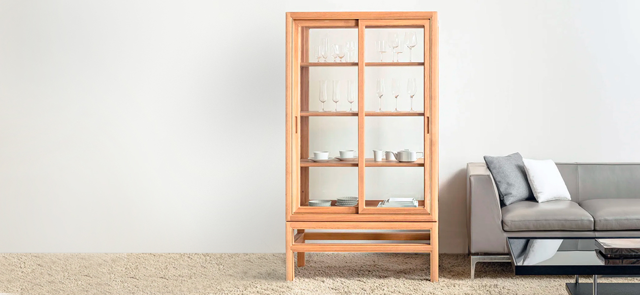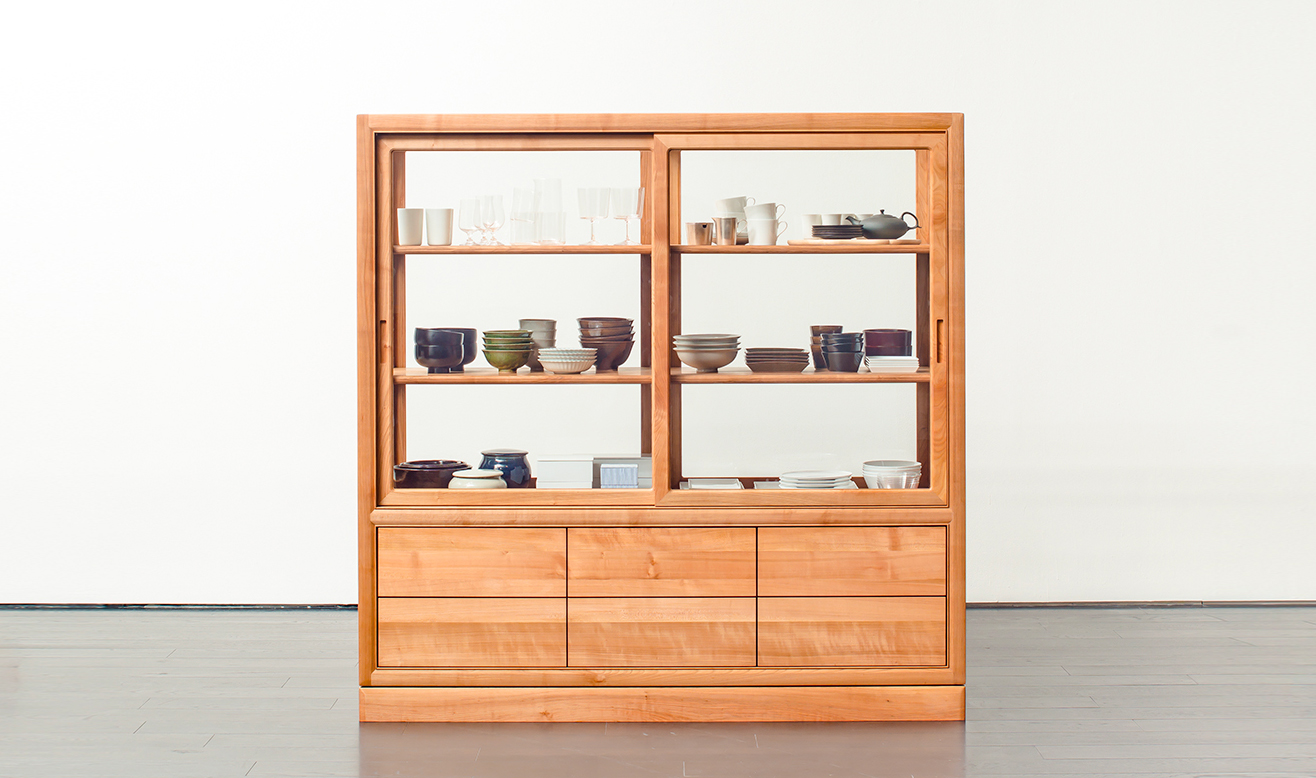 そして、美しい建築物が大開口から光を取り込むように、5 面のガラス面から差し込む自然光は、仕舞われている品々を美しく照らします。窓際に設置すれば、窓の外の緑を借景に収納物を映し出します。光に満 たされたキャビネットは、収納という機能を超え、美しいオブジェのように存在します。