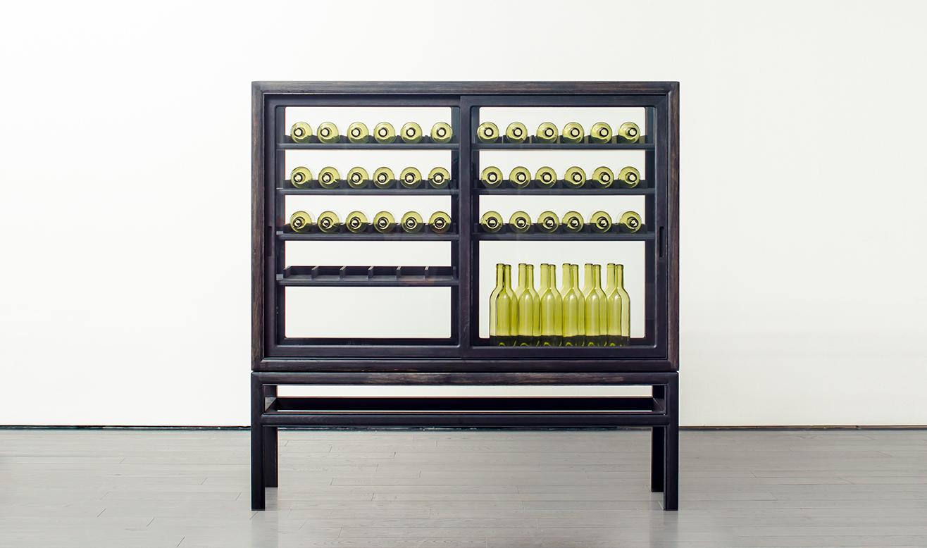 小さな建築物を造るように、日本の木工技術のみでこのキャビネットを作りました。木造建築の軸組を連想させるフレームの構成や建築物を支える木組みのような脚部は、日本の洗練された建築をイメージしています。