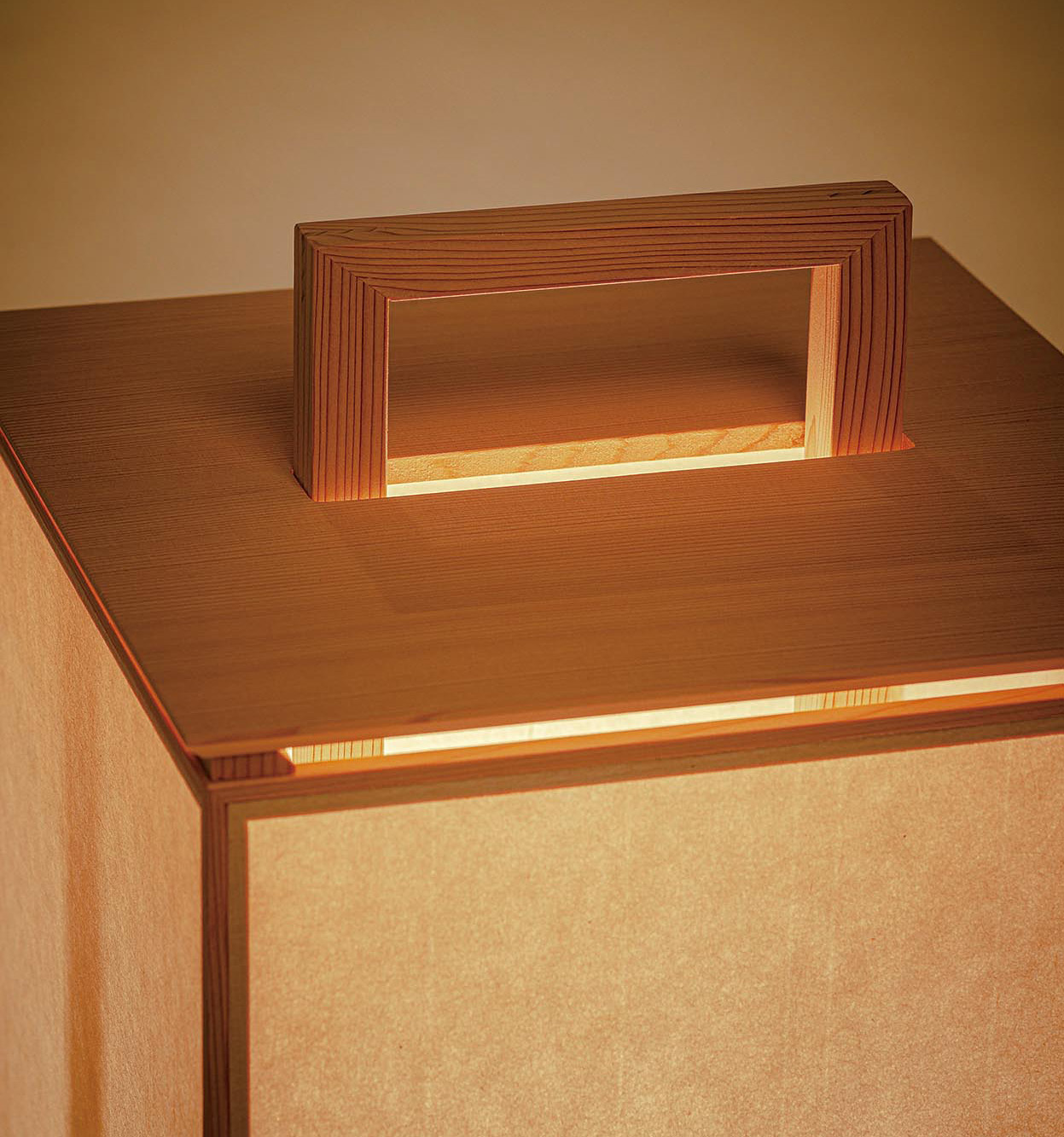 Nagoyaは、多くの歴史書や古道具の資料から精選した、江戸時代中期以降に用いられた角行燈の一種である「名古屋行燈」を手本にしました。骨格となるフレームの素材に選んだ秋田杉は、日本の寒冷地である東北地方の厳しい環境の中、時間を掛けてじっくりと成長するからこそ年輪の密度が高く、繊細な木目を持っています。真っ直ぐに伸びる秋田杉は、割れや反り伸縮などの変化が少なく、加工性が高いこともあり、行燈づくりには適した材です。