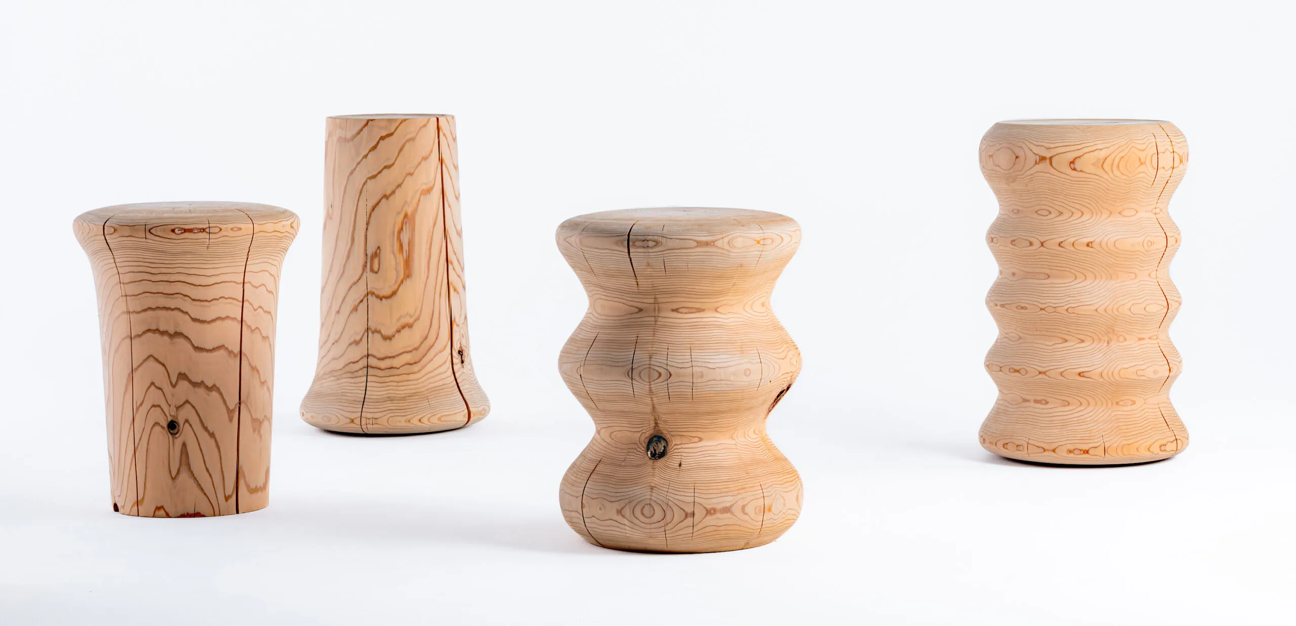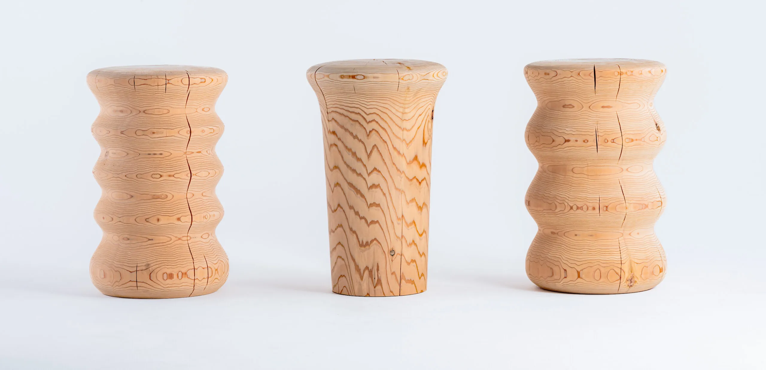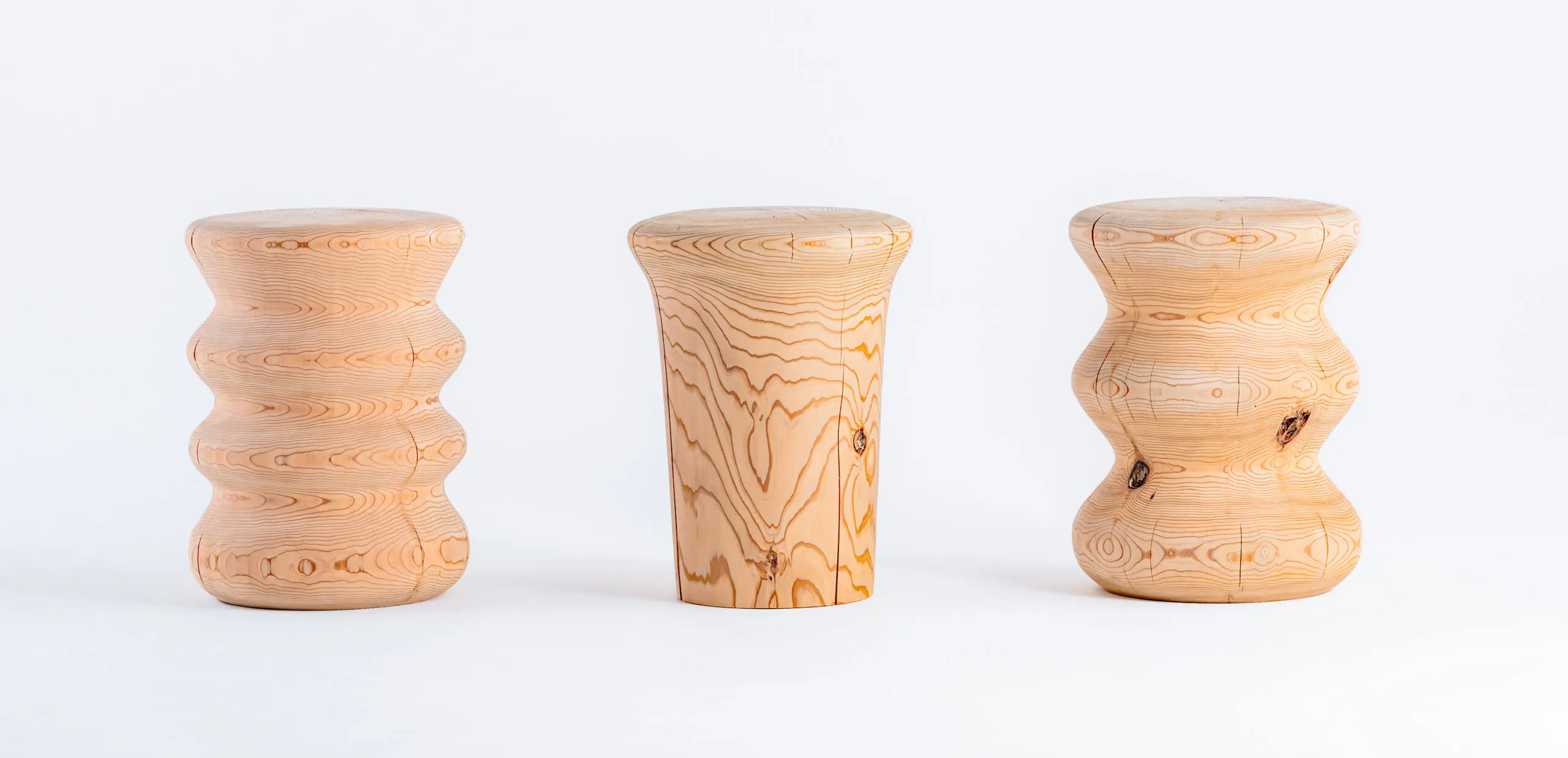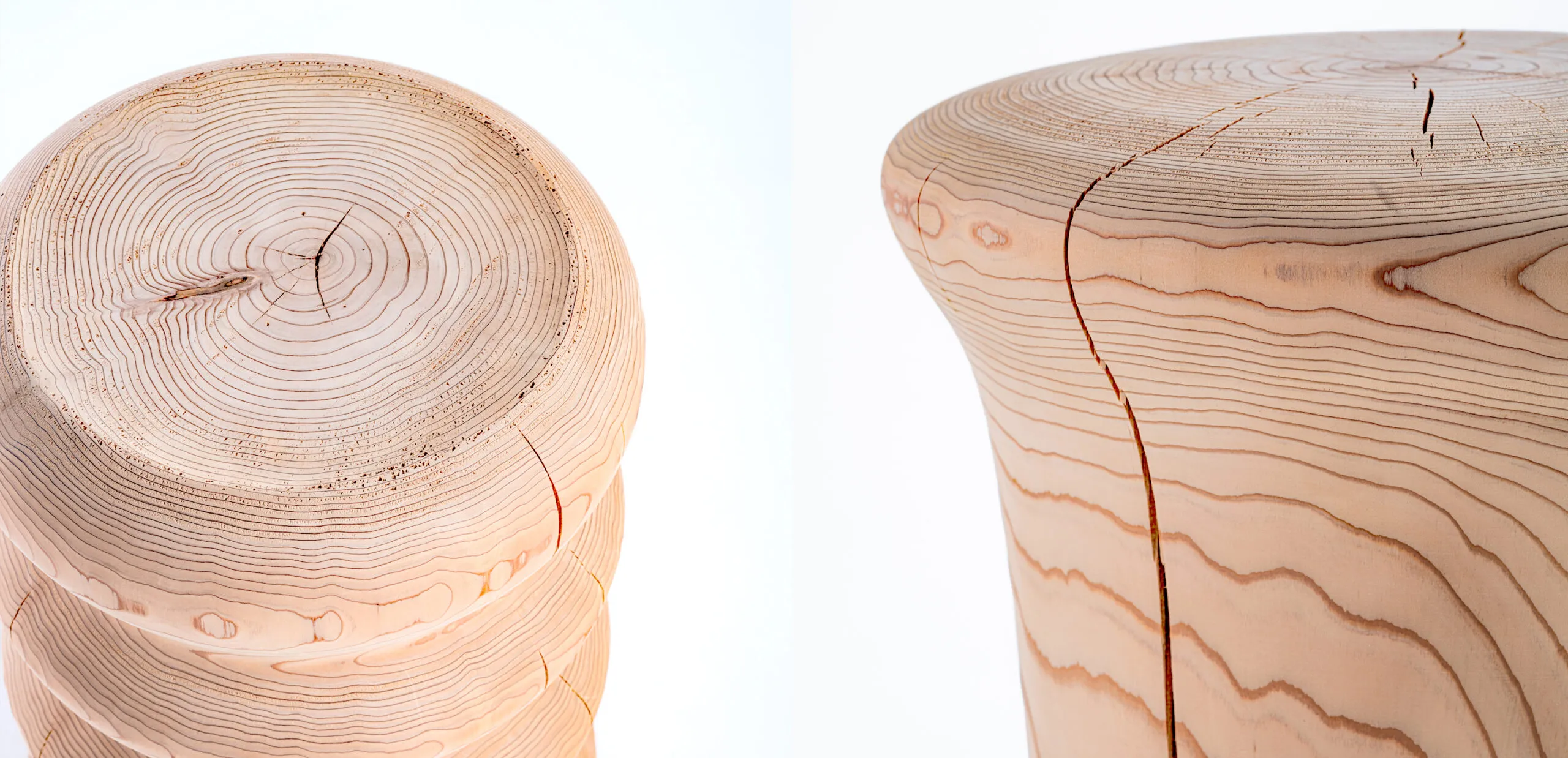 Nenrin は、日本三大人工美林の一つである吉野杉を木工ろくろで削り出して作られた、両面使いが可能なスツール兼サイドテーブルです。吉野地方では、密植、枝打ち、間伐といった手間を惜しまない丁寧で計画的な管理により、質の高い森林資源が循環し、500 年以上に渡って人工林が維持されています。他産地の 3〜4 倍もの密度で植えられた苗木が競い合い、間伐を繰り返して長い年月をかけて育てられた、年輪の幅が細かく均一な木材は吉野杉の特徴です。その美しい色艶と香りは、この産地ならではの魅力といえます。
