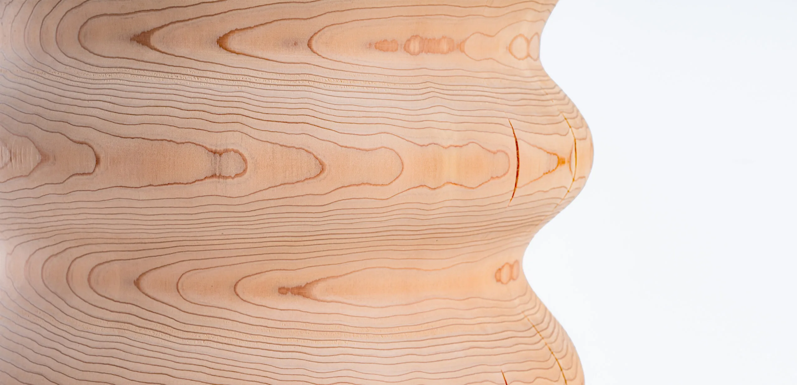 このプロダクトでは、吉野杉の均一で細やかな年輪を最大限に活かすため、ろくろ加工を観察しながら形状を慎重に決めました。削る角度や形状によって年輪の見え方が異なり、それに伴い製品の雰囲気も大きく変化します。それぞれの木目、色、節などには一点一点異なる個性があり、そこには長い時間をかけて山で育まれた木々の歴史が詰まっています。