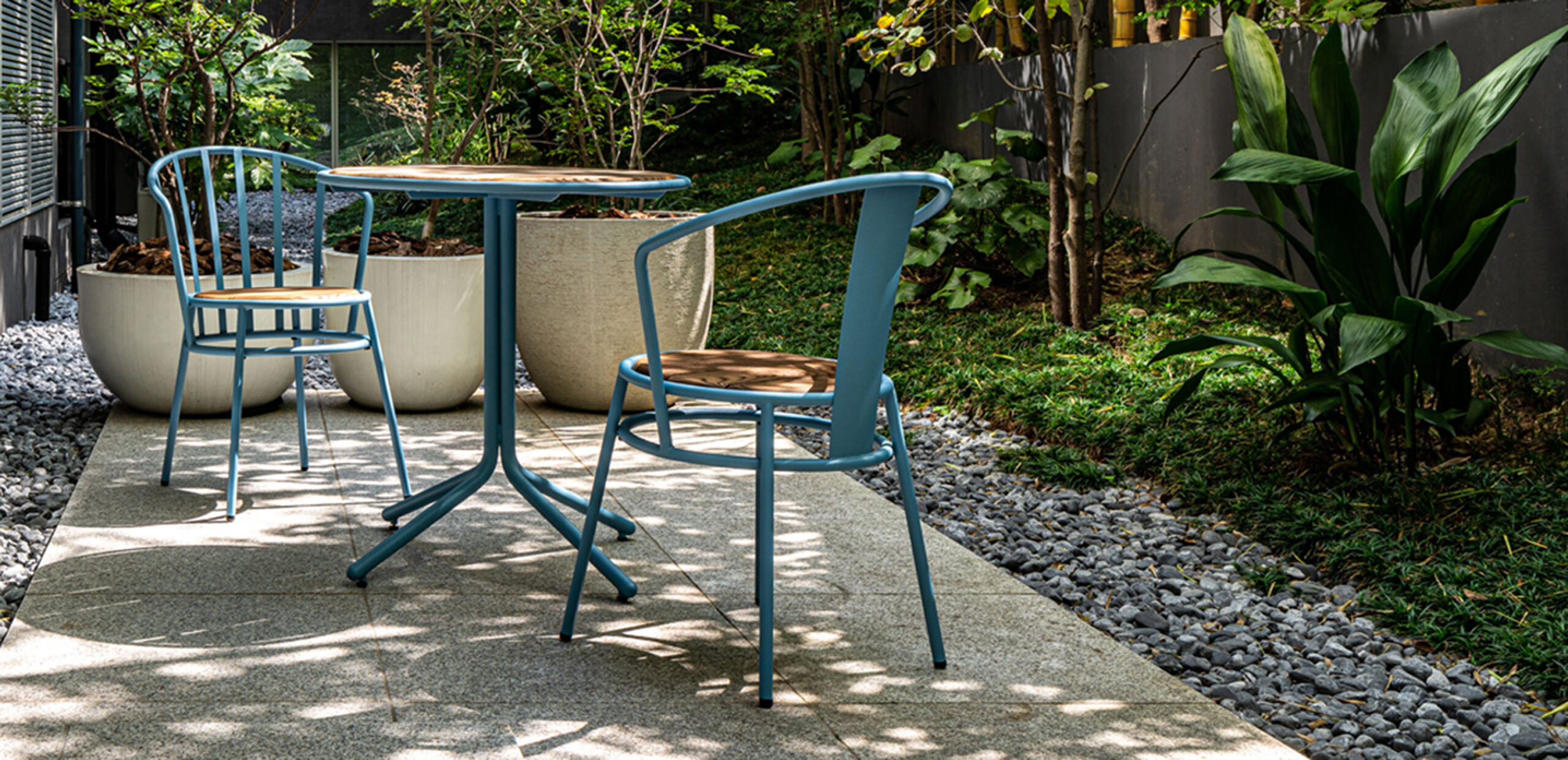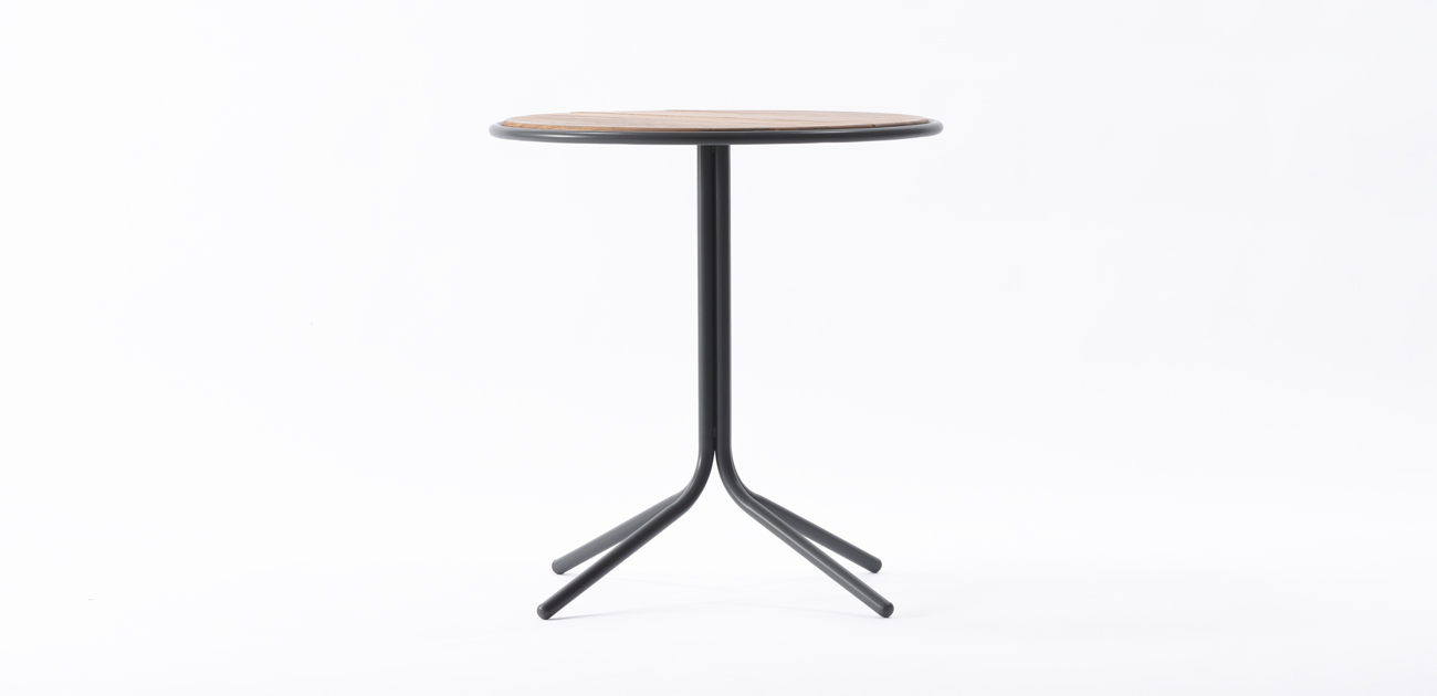 Offset chair の構造を金属パイプで再構築し、屋外でも使用できるようにしました。このチェアの原型は、18世紀のイギリスでガーデンチェアとして人気を博したウインザーチェアです。そのウインザーチェアと同じように、Offset Outdoor も庭やテラスの風景と調和する雰囲気を目指しました。テーブルとチェアはスチールパイプを構造とし、木部を囲むスチールパイプが天板と座面を衝撃から守り、堅牢性を高めています。座面と天板の木部は窒素加熱処理によって耐水性、耐朽性、防腐に優れ、時間の経過と共にじっくりと風合いを増す無塗装仕上げにしました。スチールと木材のコントラストが、一般的な屋外家具の無機質な印象を和らげ、安心感のある優しい雰囲気を持つプロダクトです。