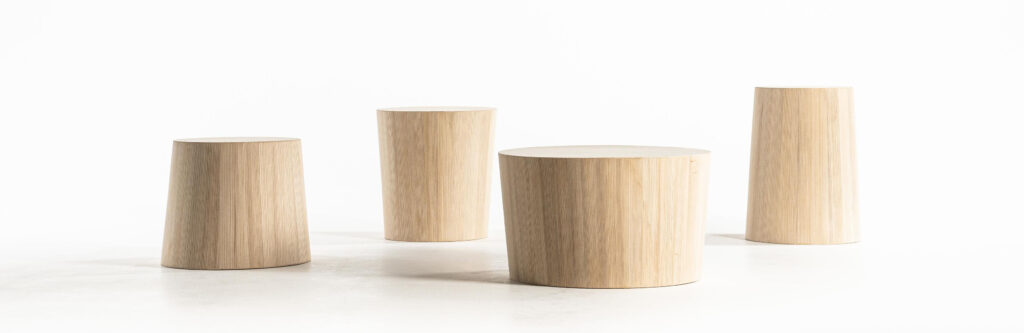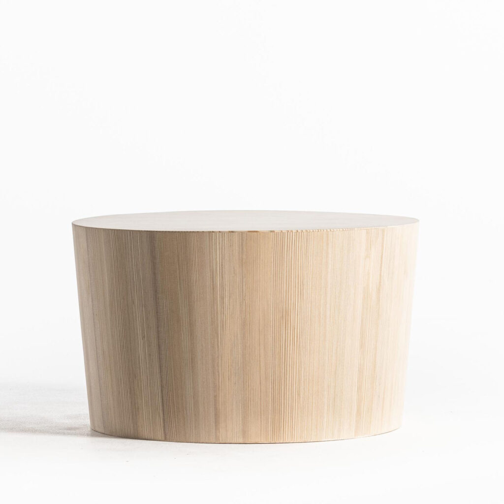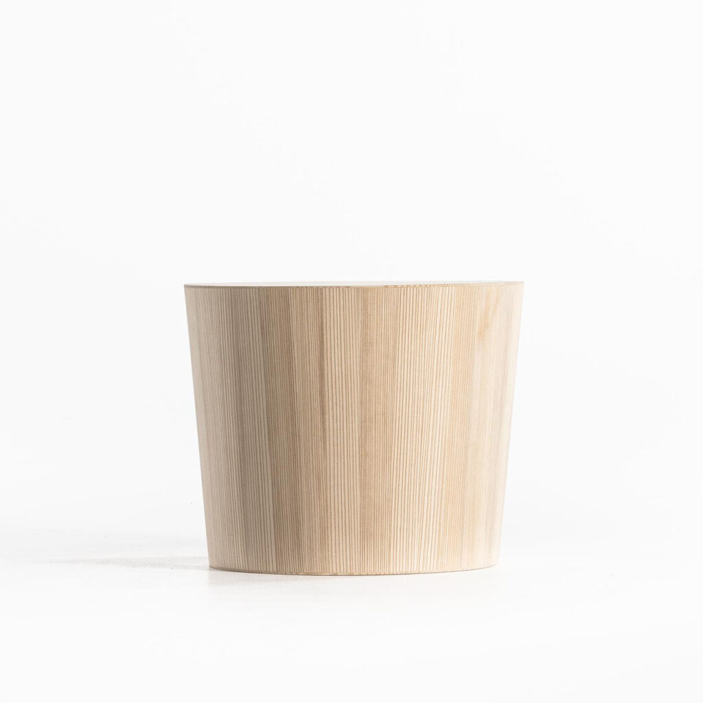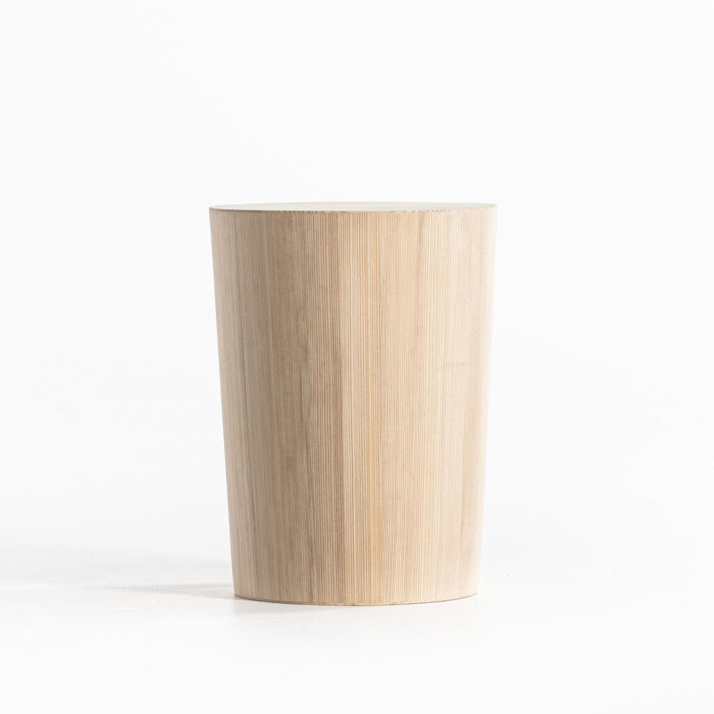 私たちは日本の家具メーカーとして、桶を再解釈し、日常の中に溶け 込む家具が出来ないかと考えました。意匠として上下を留加工し蓋を被せ、仕口をシームレスにみせることで、桶のアイコニックな形としました。 傾斜のついている側板に対し、上下に留加工しピッタリと納めることは 非常に高い加工精度と熟練した技術が求められる工程です。桶は一見、 正円に見えますが、完全な円ではないため、蓋を入れた後、1 点 1 点、手鉋で削り、留部分の調整を丁寧に行います。留加工は何度も試作と検 証を重ねたことで、一体感のあるプロダクトが完成しました。