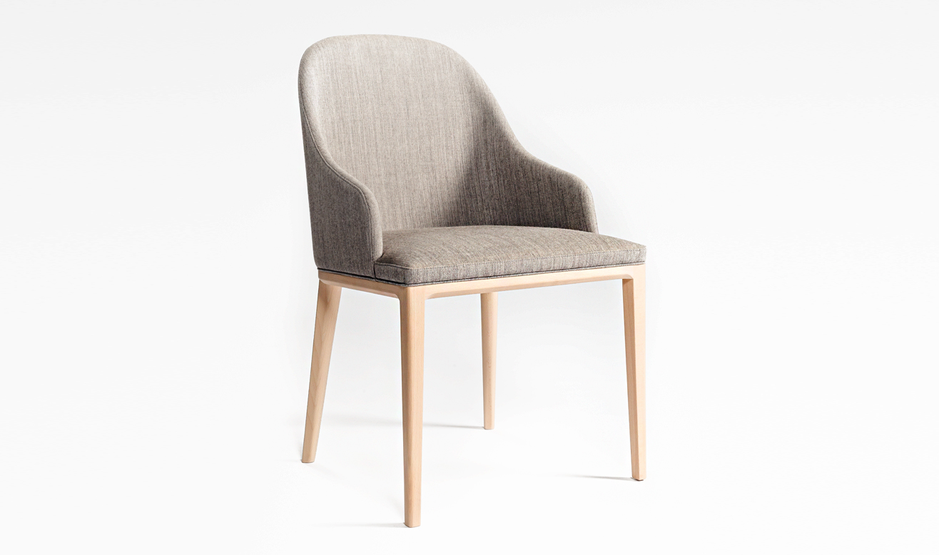 背もたれからサイドにかけて柔らかくカーブしたシェルは、見た目の印象よりも身体全体をしっかりと受け止めます。脚と座枠が一体化しているため、座った時の安心感があります。また、重い印象になりすぎないように座枠の下部を R 形状に削り出すことで、座面から座裏に向けて緩やかな繋がりが生まれました。シェルと座枠の一体化は、椅子全体に上質な品位を生みます。