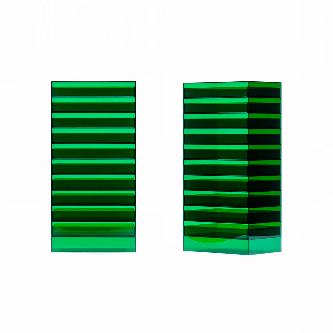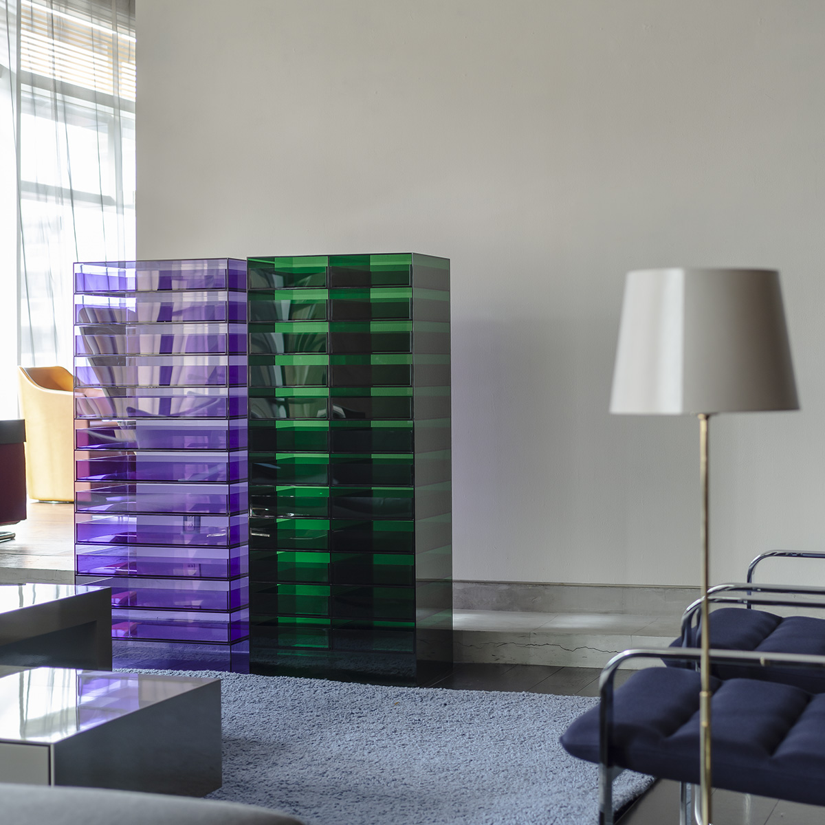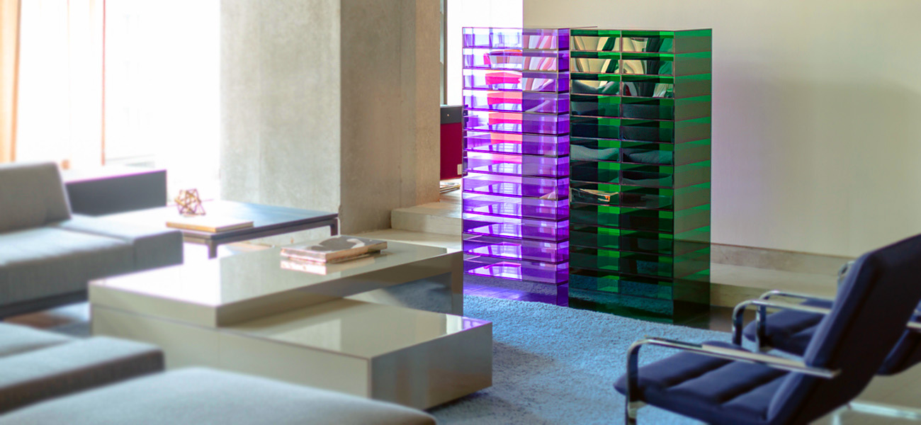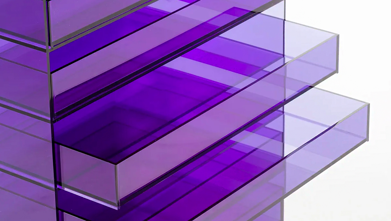 透明のカラーアクリル板を加工したドロワーです。厚さ 5 ミリのアクリル板を効率的に配して部材を切り出し、組立てます。棚板にはわずかな溝を彫ることで、トレーが側板に当たることなく真っ直ぐに引き出すことが出来ます。