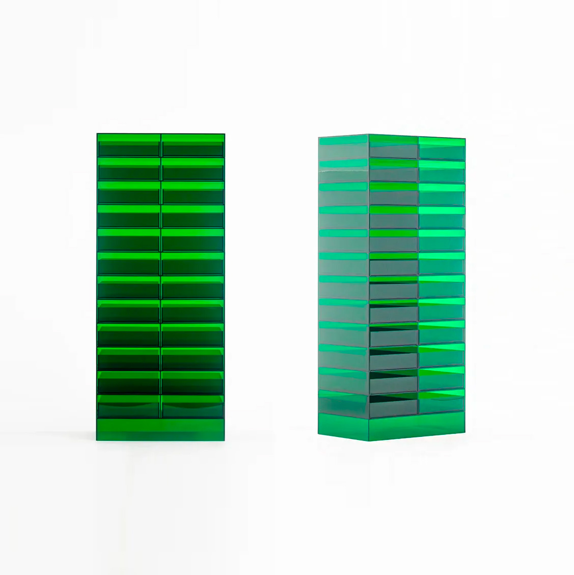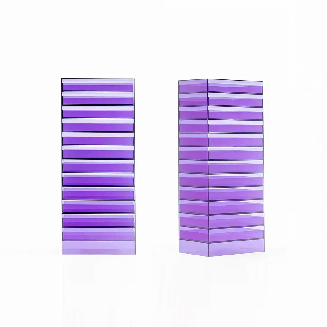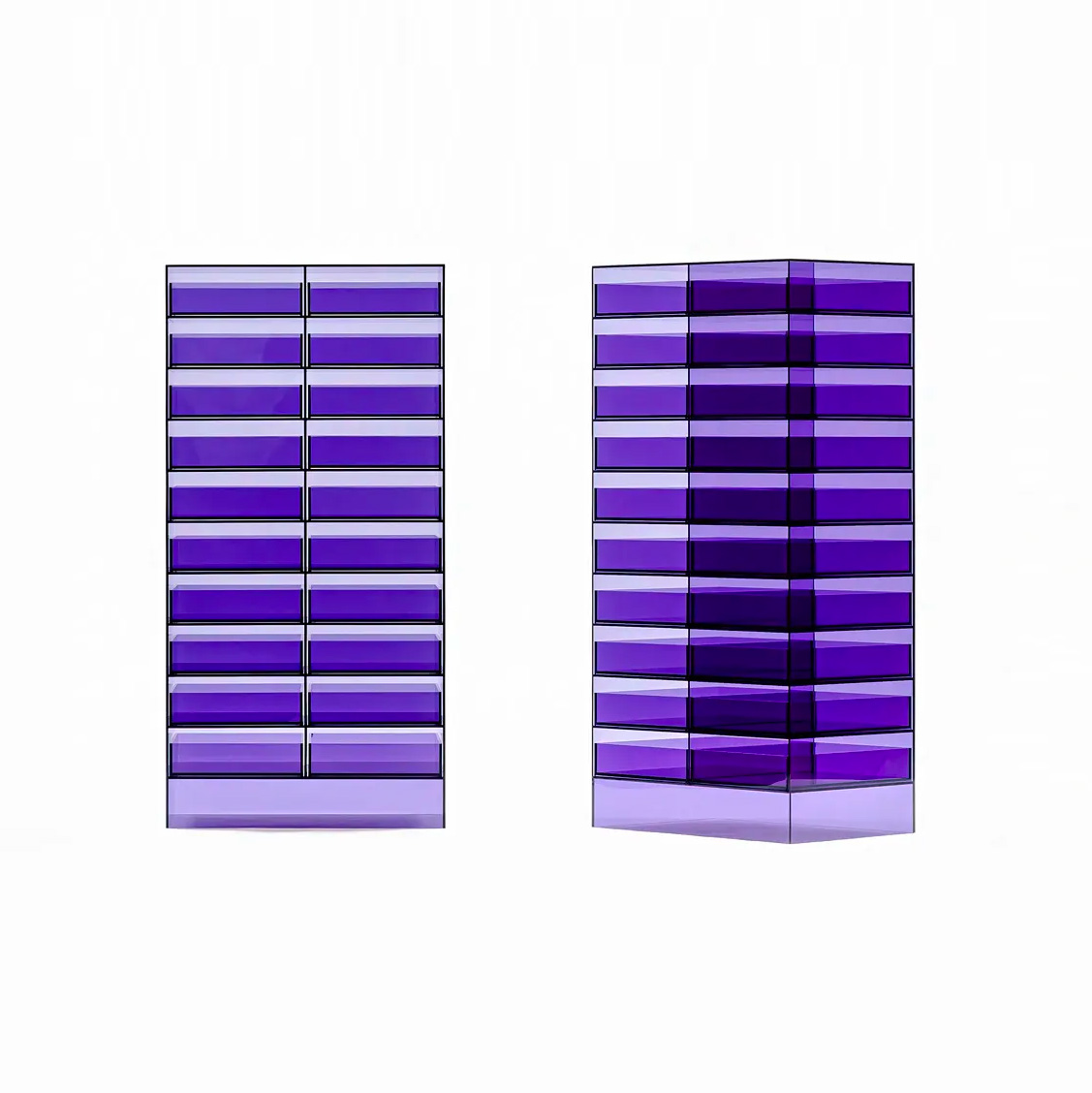 透明のカラーアクリル板を加工したドロワーです。厚さ 5 ミリのアクリル板を効率的に配して部材を切り出し、組立てます。棚板にはわずかな溝を彫ることで、トレーが側板に当たることなく真っ直ぐに引き出すことが出来ます。