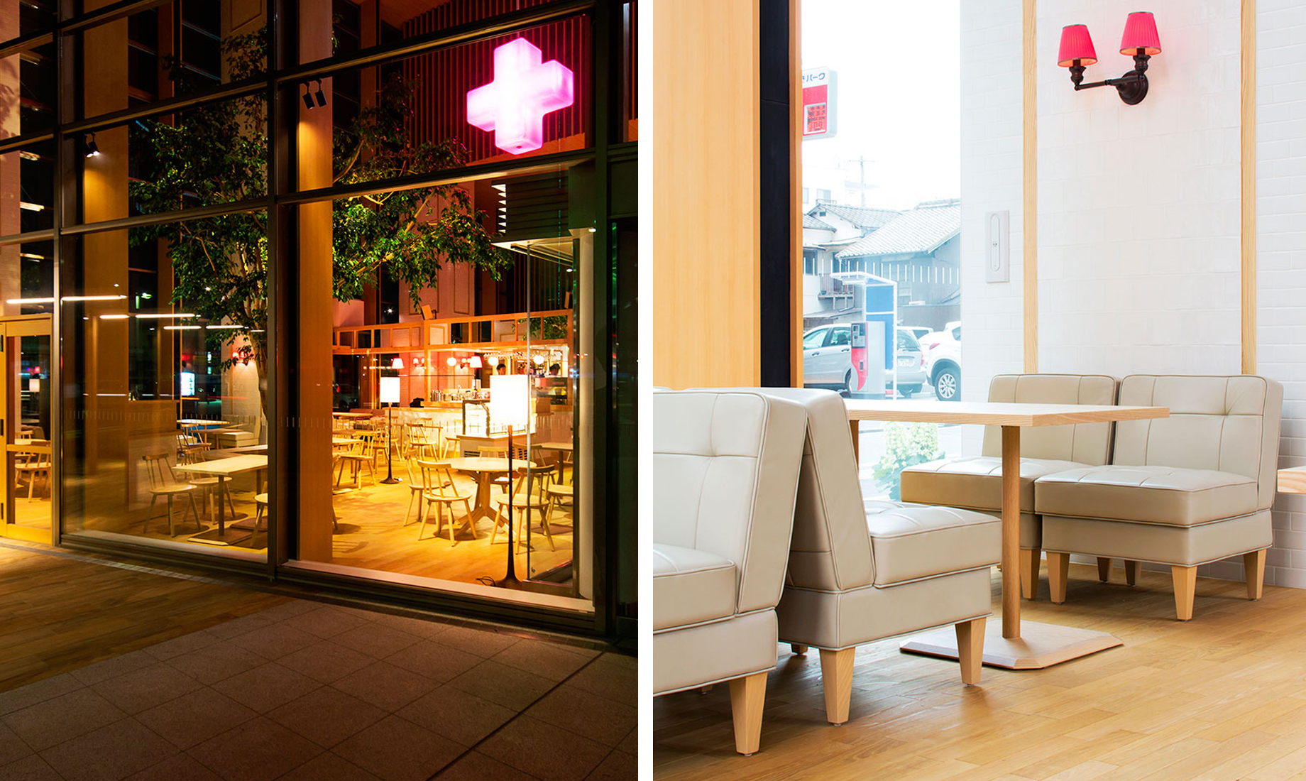 桜十字福岡病院の1 階にあるラウンジダイニング「Rejoyce」は、人が行き交い、病院と街を繋ぐ場所として、新しいライフスタイルを提案するスペースを目指してオープンしました。当社は、内装に合わせたこだわりのグレーベージュ色の特注レザーでソファやベンチを製作しました。病院内のため、消毒にも耐えられる耐水性のレザーを採用。親しみやすい印象のウィンザーチェアやソファがインテリアデザインを引き立てています。