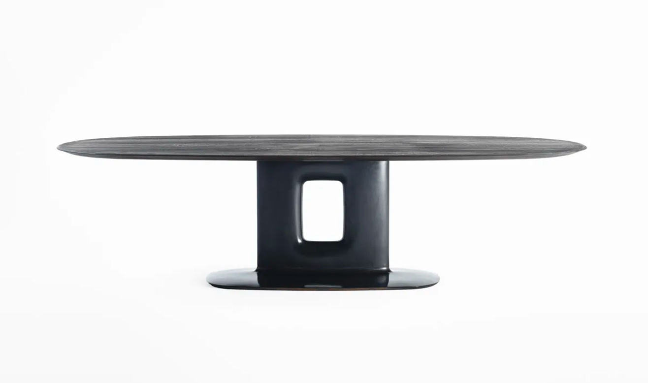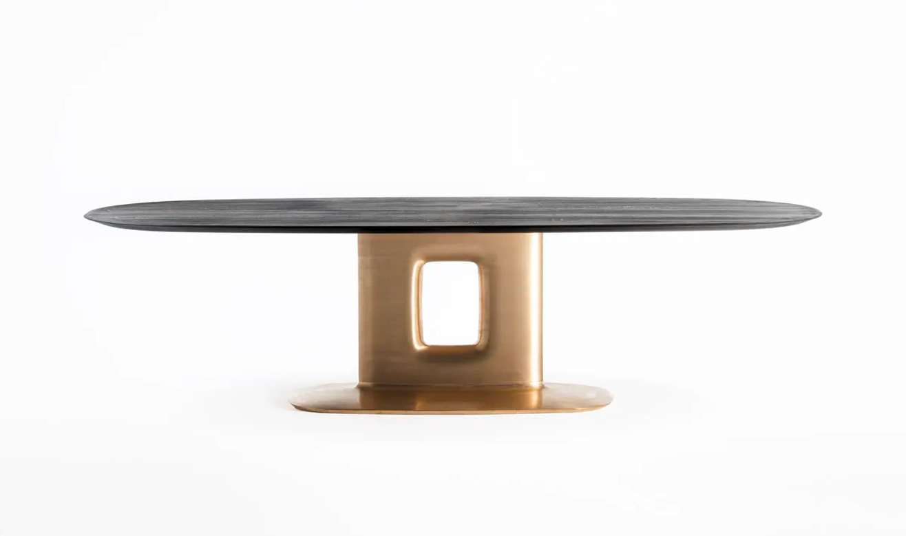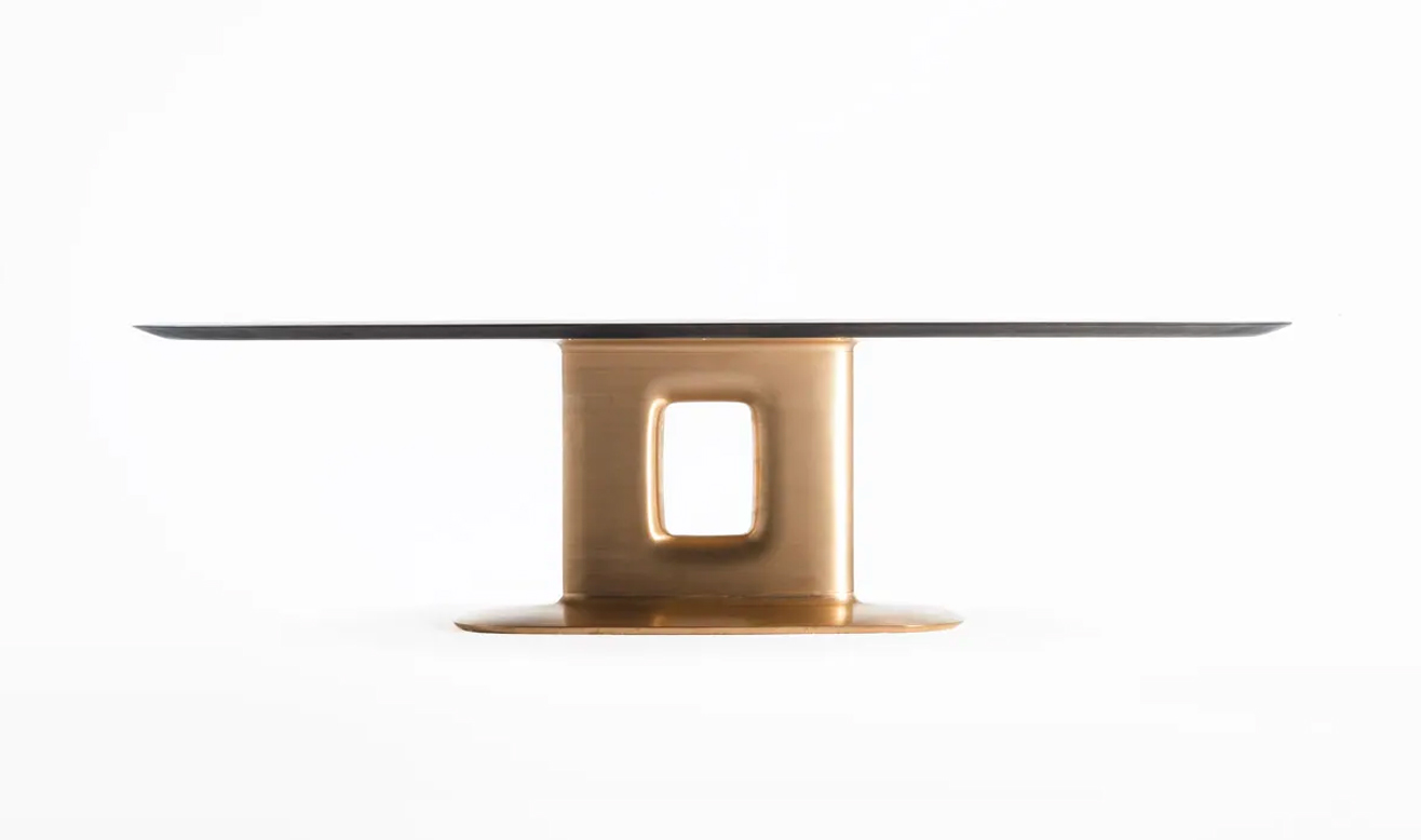 Elliptical cylinder casting bronze tableのデザインを原形とし、くり貫かれた脚部が鋳物であることをより明確に伝え、彫刻的な造形を作り出すことにチャレンジしました。支柱部分をくり貫くことでテーブルとしての大胆な存在感が増したばかりでなく、構造的には 2 本の柱によって大きな天板を支えることとなり、脚部の振動を抑え、テーブルとして安定感が生まれました。