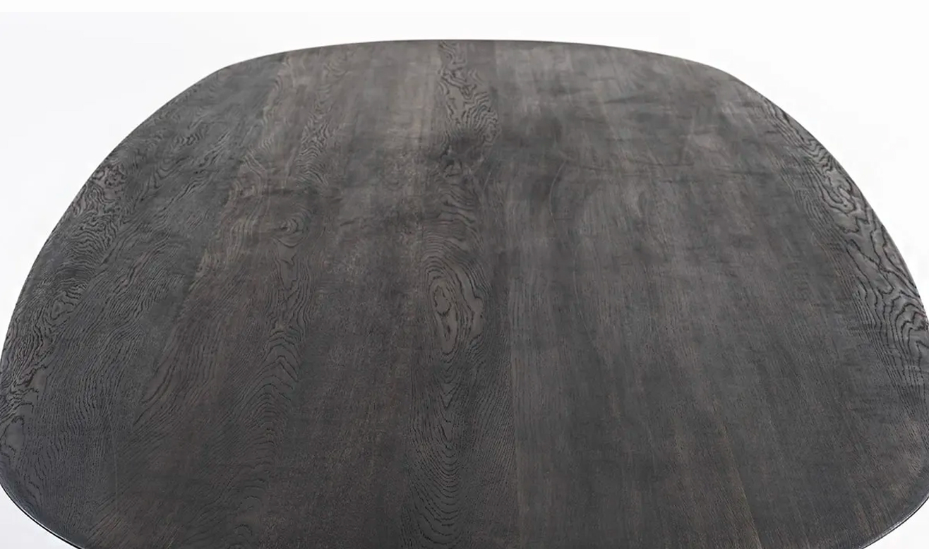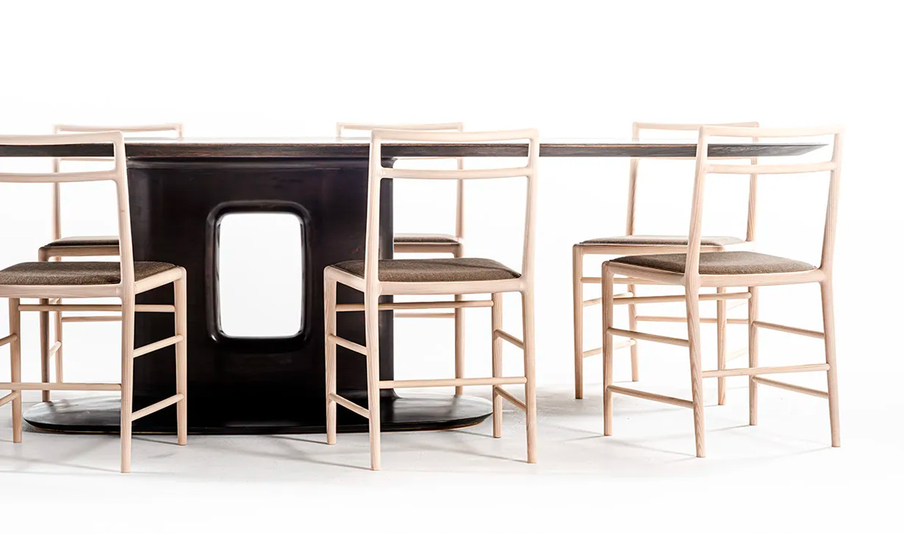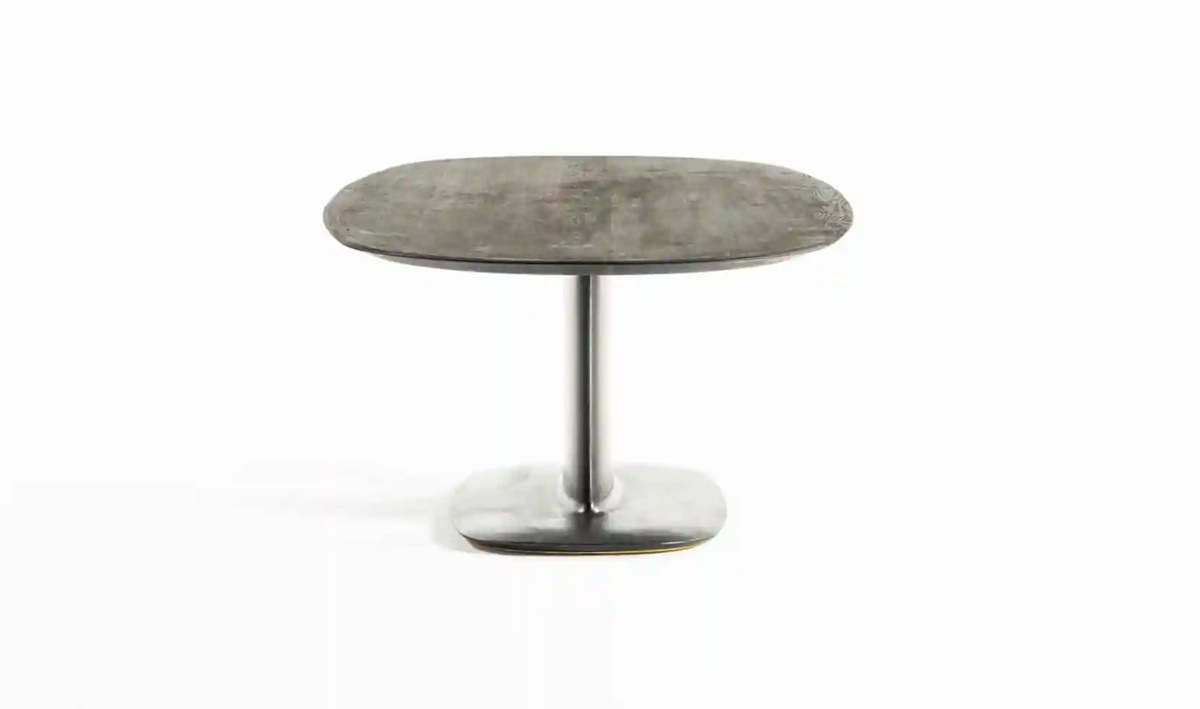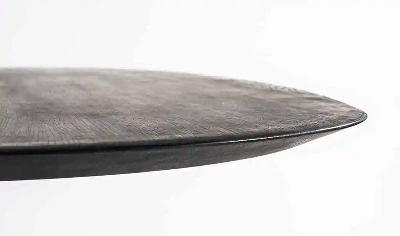 Elliptical cylinder casting bronze tableのデザインを原形とし、くり貫かれた脚部が鋳物であることをより明確に伝え、彫刻的な造形を作り出すことにチャレンジしました。支柱部分をくり貫くことでテーブルとしての大胆な存在感が増したばかりでなく、構造的には 2 本の柱によって大きな天板を支えることとなり、脚部の振動を抑え、テーブルとして安定感が生まれました。