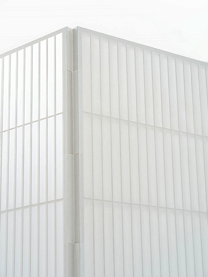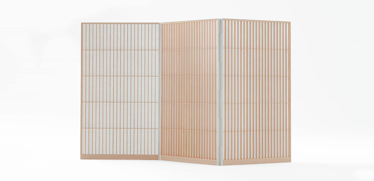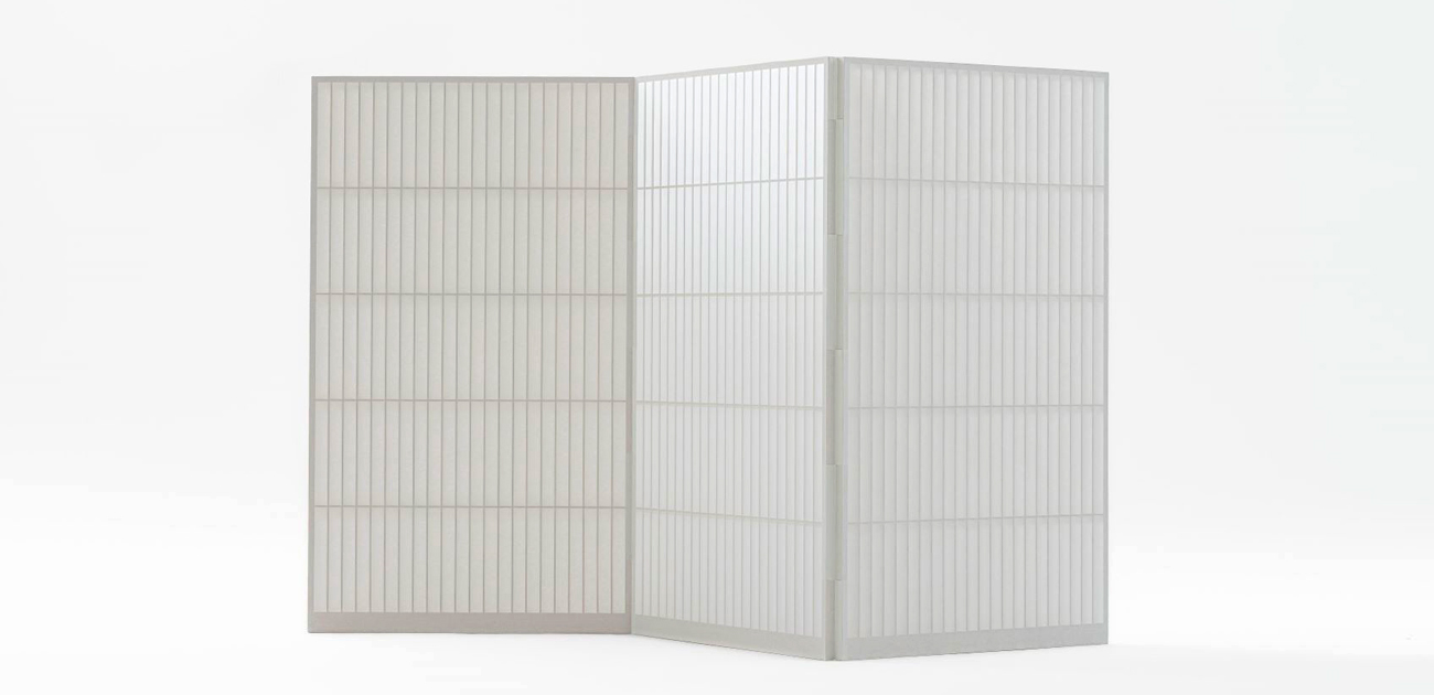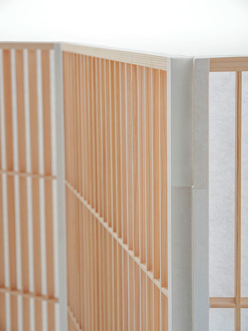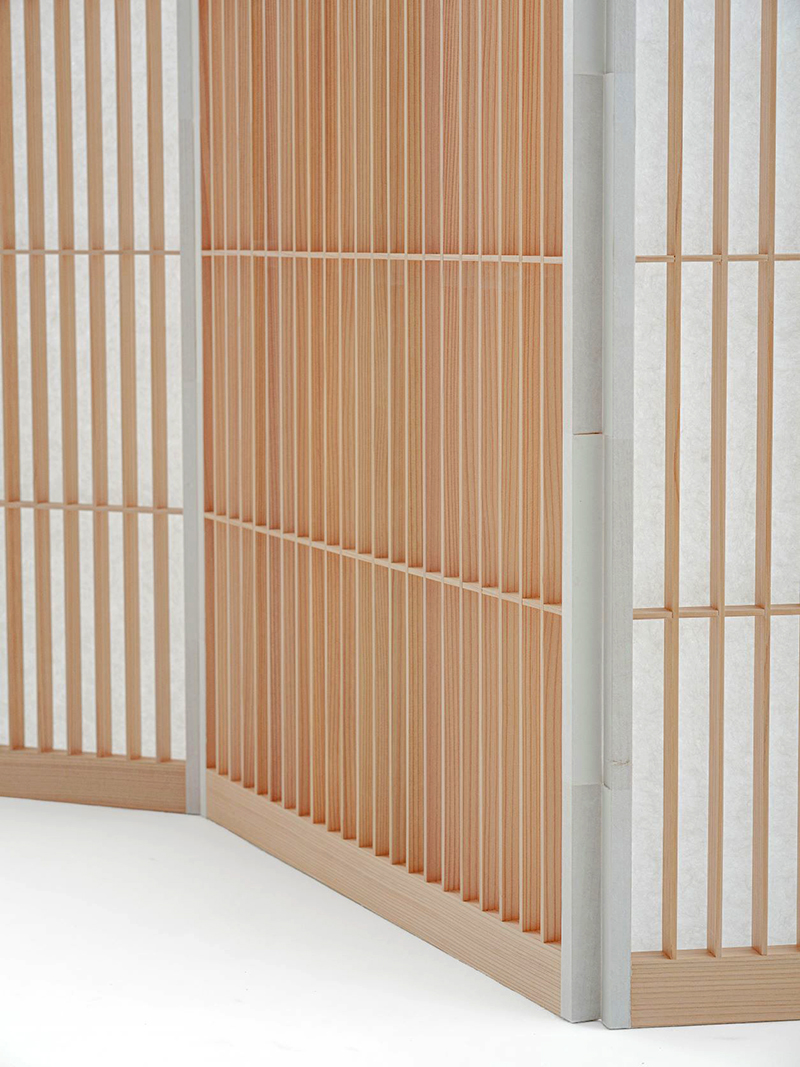 Shojiは、木目がまっすぐ伸びた秋田杉を細やかな格子に組み、杉本来の質感と香りを感じられるよう無塗装で仕上げました。片面には、日本三大和紙の一つである福井県の越前和紙を貼っています。約1500年の歴史をもつ越前和紙は大判を得意とし、襖や屏風のような大きな建具に継ぎ目なく貼ることができる丈夫な和紙です。そして、Shojiの3枚の建具は、和紙を糊付けした紙丁番で繋ぎ合わせています。金物は一切使わず、秋田杉と越前和紙のみの日本古来の工程によって製作されたパーテーションです。