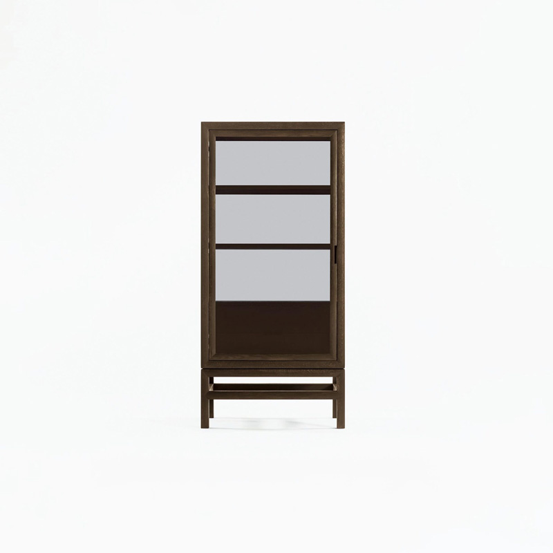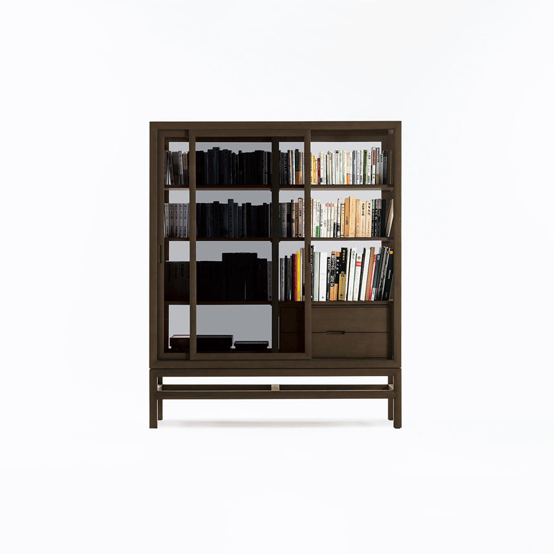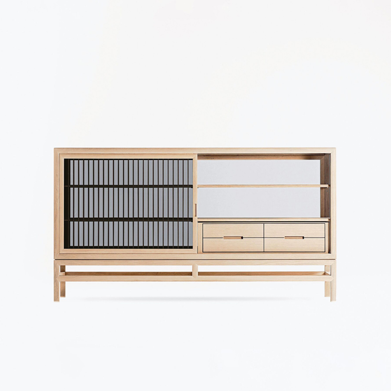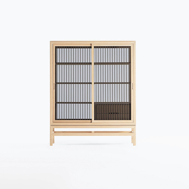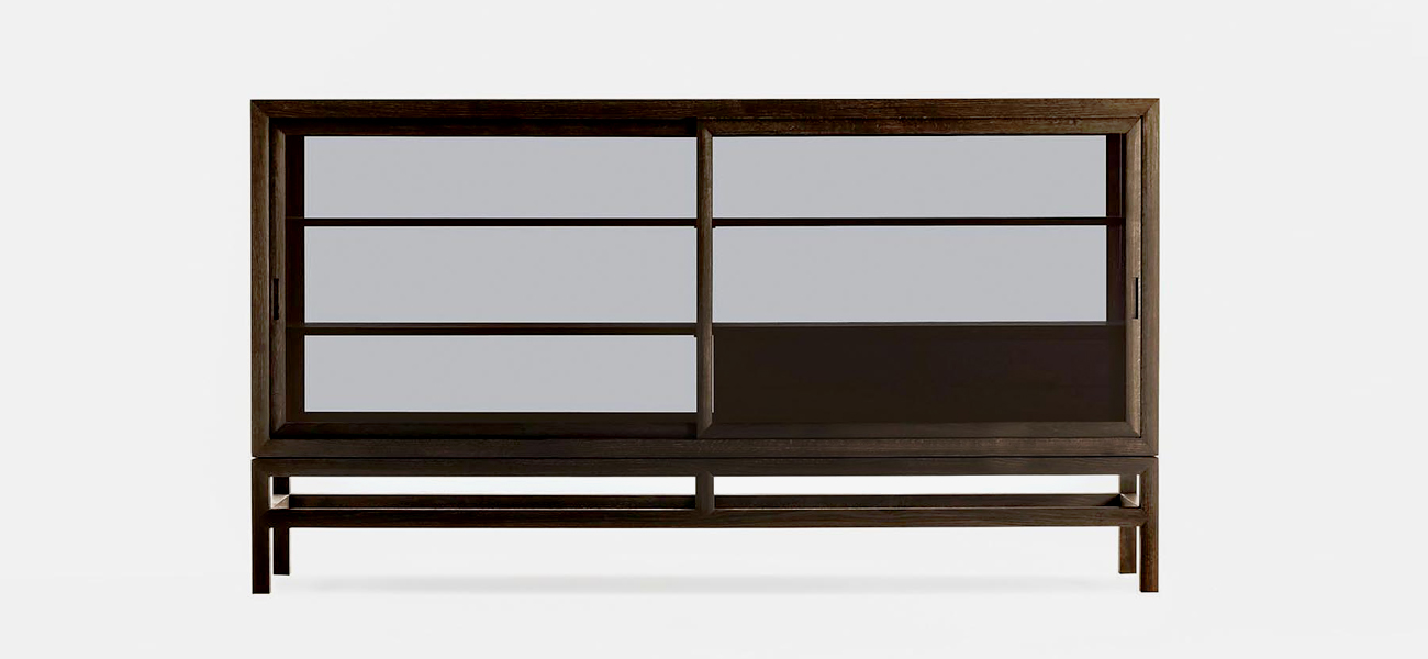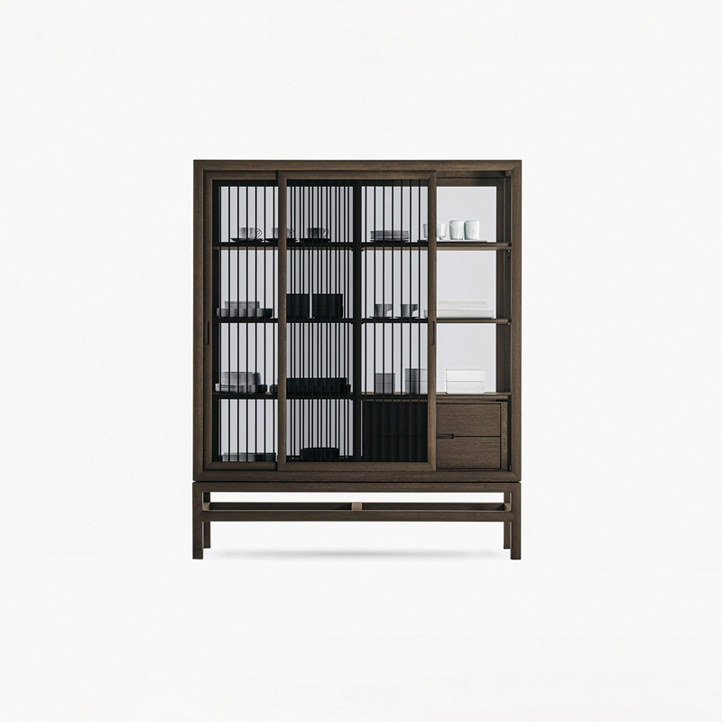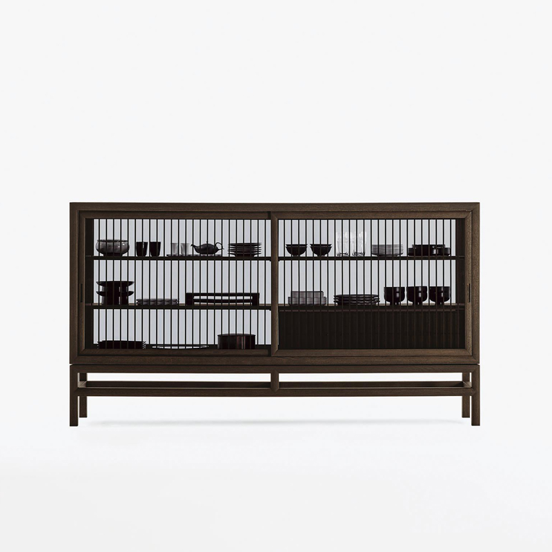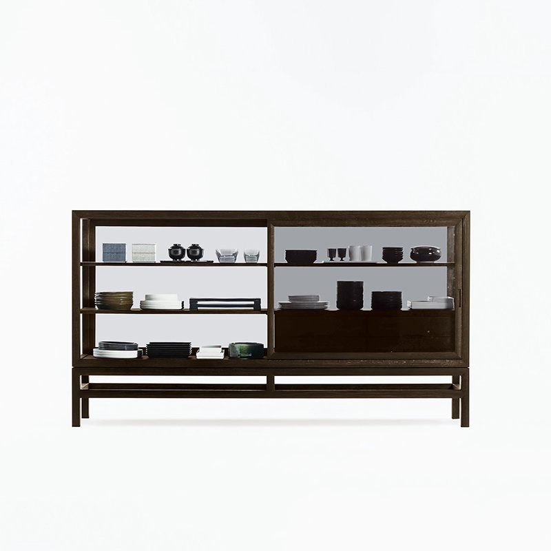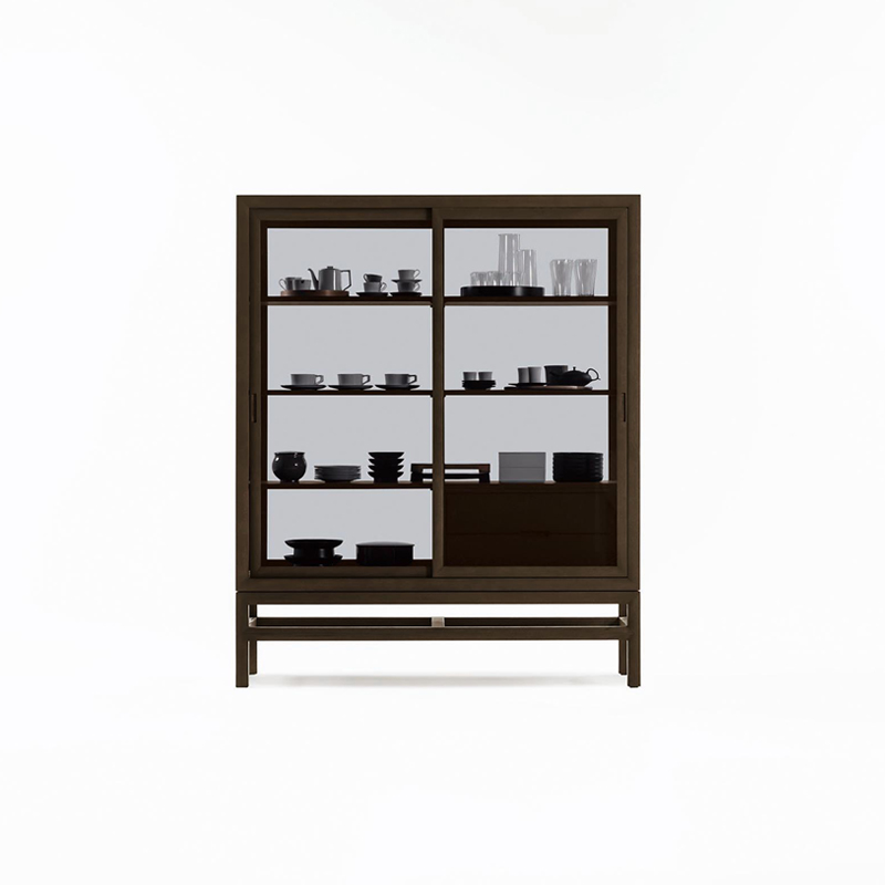 伝統に囚われることなく、日本の美意識を現代に通じる美として表現したのがSilent cabinetです。一般的なショーケースはLED照明を組み込んで内部を明るくしますが、人工の光に照らされた収納物は決して美しいとは言えません。一方、照明のない棚は下の段ほど暗くなり、中がよく見えません。Silent cabinetは、照明を使うことなくキャビネットに光を呼び込み、収納物が美しく引き立つように、前後、両側面、天井面の5方向全てをガラスにしました。またW1400とW2200 のタイプには引き戸を採用しました。引き戸は古くから日本家屋の空間を間仕切る襖や障子といった建具に使われる仕様です。キャビネットの内部で扉を互い違いにスライドさせて開けることができるので、大きな扉であっても開閉のスペースを必要としません。