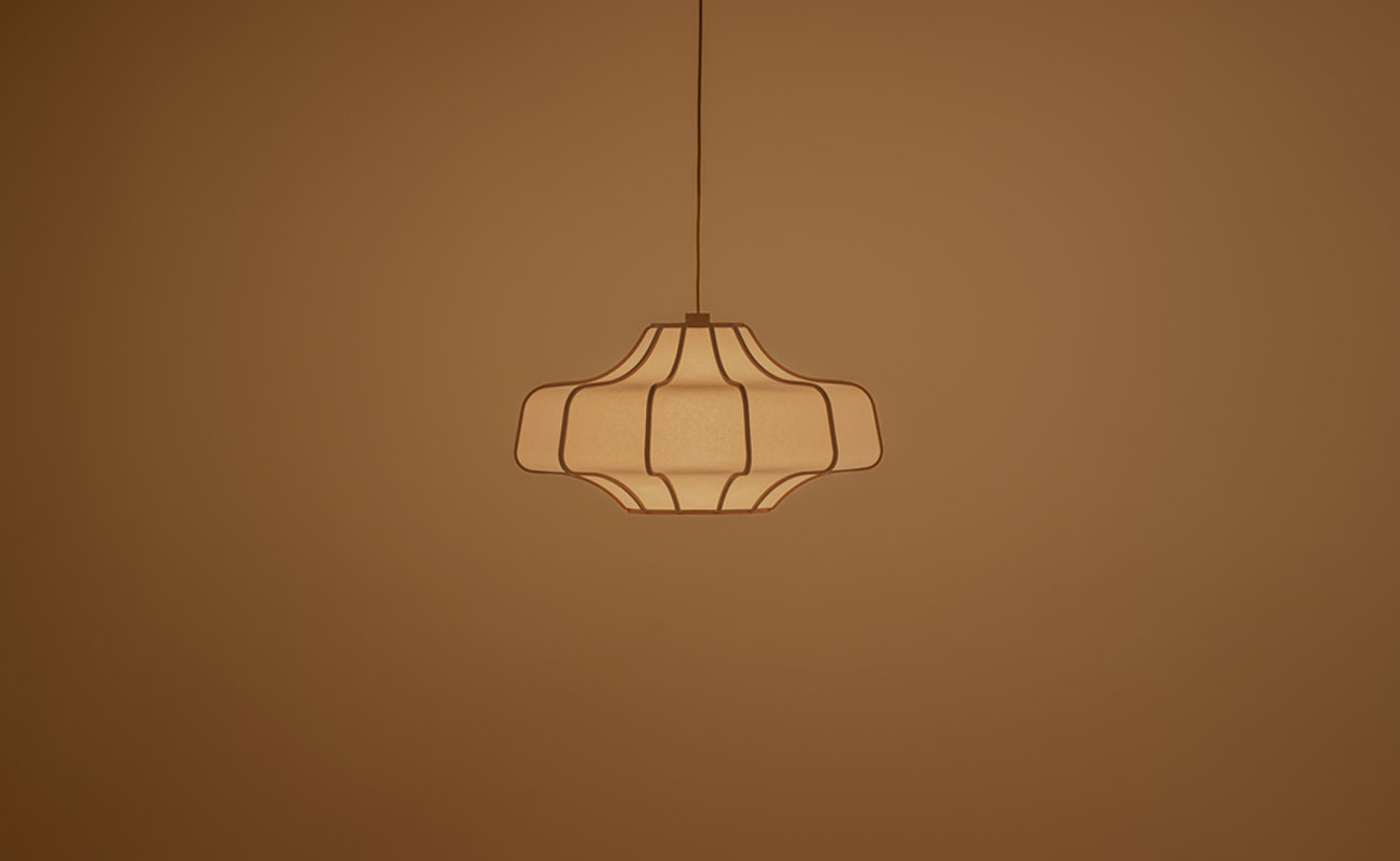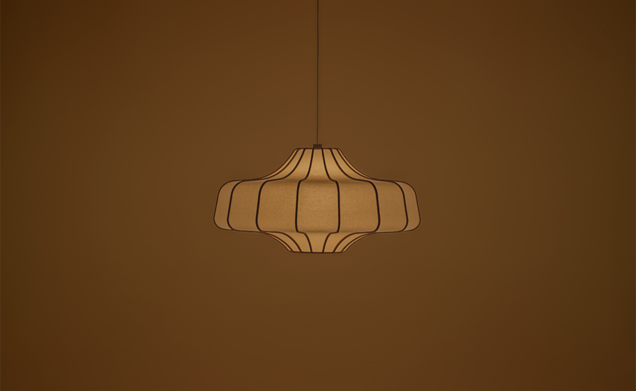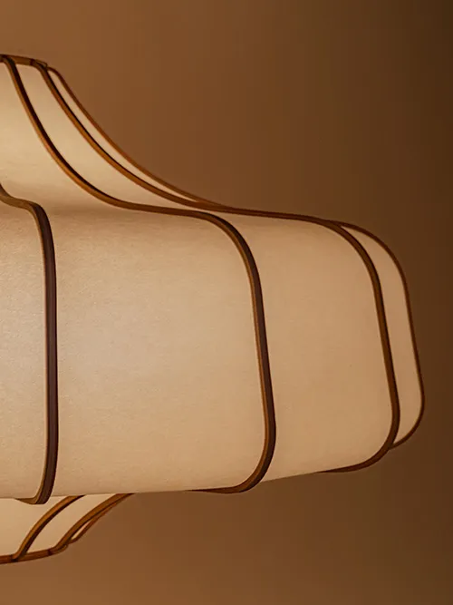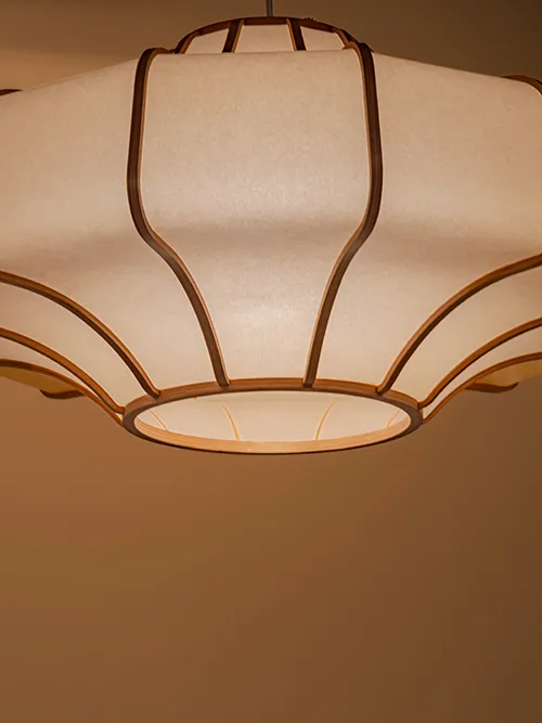 Spacecraft は、その名の通り、想像の中の宇宙船を思わせる形状のシェードが特徴的なペンダントライトです。日本を代表する木材である秋田杉は寒冷地の厳しい環境でゆっくりと成長するため、年輪が詰まり、美しい細やかな木目と高い強度を兼ね備えた特別な素材です。日本全国に生育する杉材は、古来より建築や器具に広く用いられ、日本人の生活に欠かせない存在です。シェードの内側には最高級の那須楮を原料にした美濃和紙が用いられています。この手漉きの和紙は、幾重にも重なる楮の繊維が光を柔らかく拡散し、優しく複雑な反射光を生み出します。木材と和紙という日本の伝統的な素材の組み合わせにより、心地よい光と温かみのある質感を空間にもたらします。強い曲線で構成されたダイナミックなフォルムは、曲木加工の限界に挑戦し、木の厚みや加工方法、そして和紙の貼り方を一から模索しながらこの形状を実現しています。1 本のフレームは、薄い板を熱で柔らかくし、慎重に曲げと接着を繰り返して幾重にも重ねて作られます。また、複雑な曲線部分には独自の方法で和紙が貼られ、熟練の職人によって丁寧に 1 枚ずつ仕上げられています。低い天井の空間でも大きなペンダントライトをバランスよく設置できるよう、横幅を広くしながら高さを抑えました。