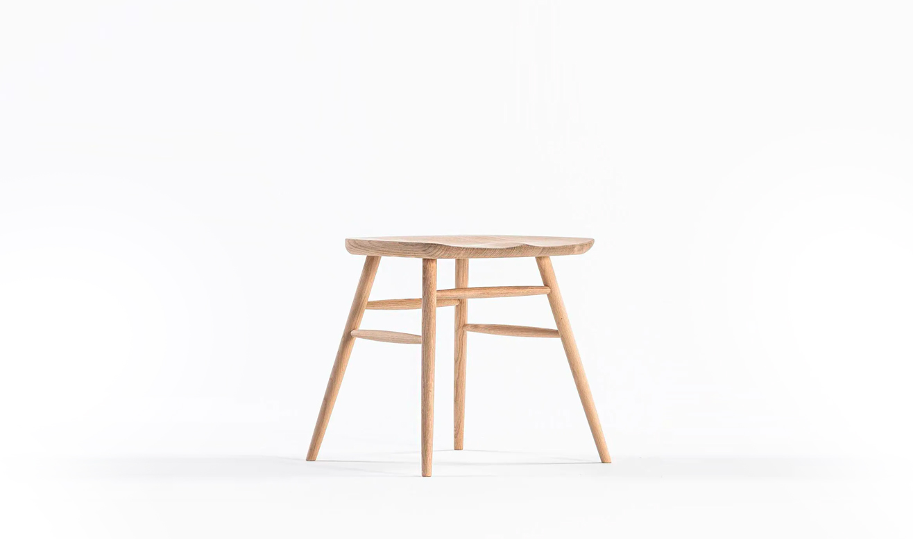 このスツールは伝統的な工法を受け継いだ職人が、ほとんどの工程を手作業で 1 脚ずつ丁寧に作っています。柔らかな曲線で細く削り出された脚と、座り心地を考慮して座ぐりされた座面で構成された、繊細で静かに佇む利便性の高いスツールです。