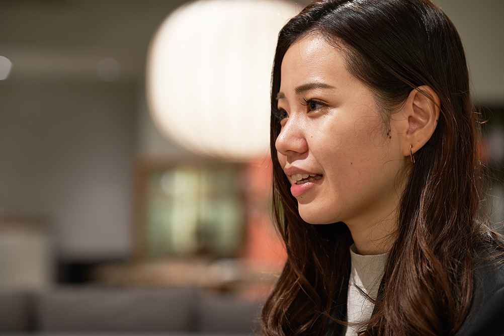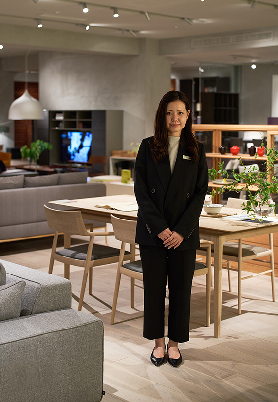 大学で専攻していた授業でインテリアコーディネートを学ぶ機会がありました。そこでインテリアの楽しさを知り、インテリアや家具の道に進もうと決めました。タイムアンドスタイルを選んだ理由は、他のインテリアショップと違い、日本の伝統的な技術や産地の素材を活かした製品づくりをしていることと、製品を販売するだけの「物売り」ではなく、一人ひとりのお客様に合わせた提案をして、空間を作り上げるという点に魅力を感じたからです。