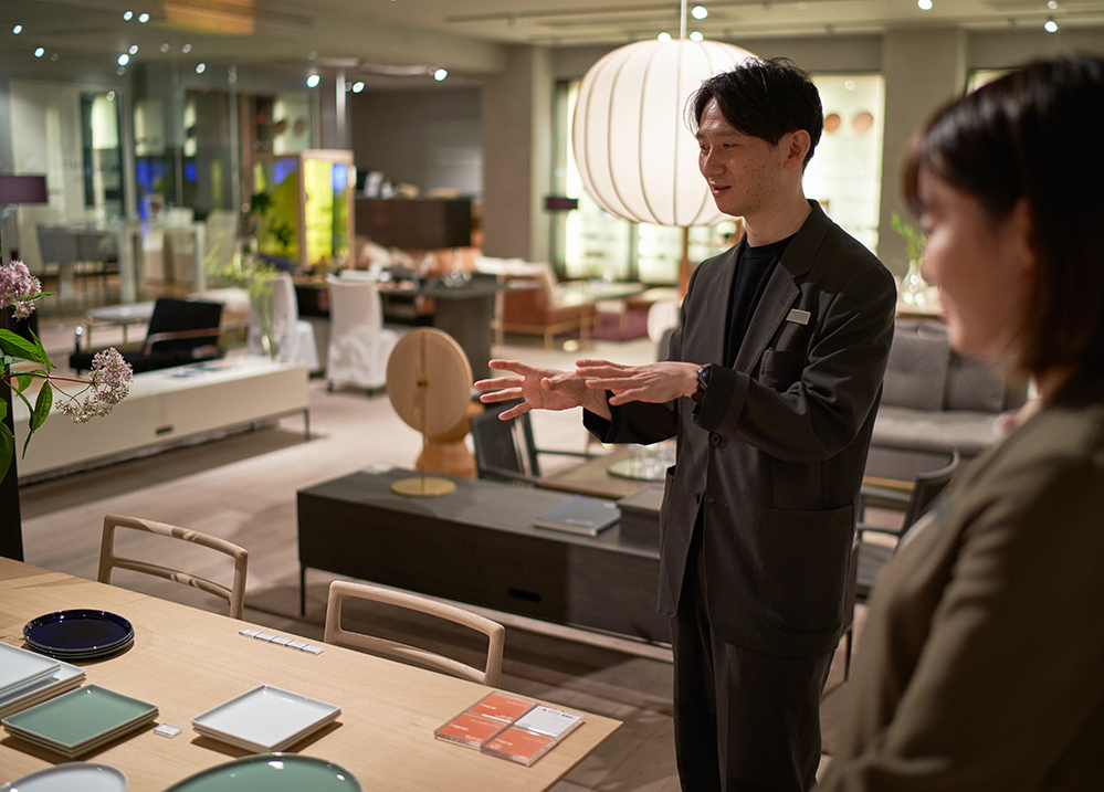 私たちの製品は、展示品以外の素材やサイズなどをお選びいただけるので、実際に見たり触れたりすることができない製品をご説明するのはとても難しいです。ただ、新しい家具を置くことで生活がより快適になるように、住まい方や生活スタイルをヒアリングして、お客様のことを理解するように常に心掛けています。製品だけの説明にとどまらず、住まい方までイメージしていただけるようにお話しすることは難しい部分でもあり、プランニングスタッフの大切な役割でもあると自覚しています。