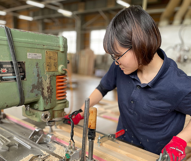 力仕事が多い仕事なので、みなさんに比べて腕力が弱い私には大変に感じることもあります。機械加工の時には木材をしっかりと押さえて作業をしなければ、大きな怪我に繋がる可能性もあります。入社したばかりの頃は、手で押さえることが苦手でいつも奮闘していましたが、入社2年目には治具(加工位置を誘導するために用いる器具)などを使うことを覚えたので、加工がしやすくなって作業時間が縮まり、さらには加工精度が上がりました。