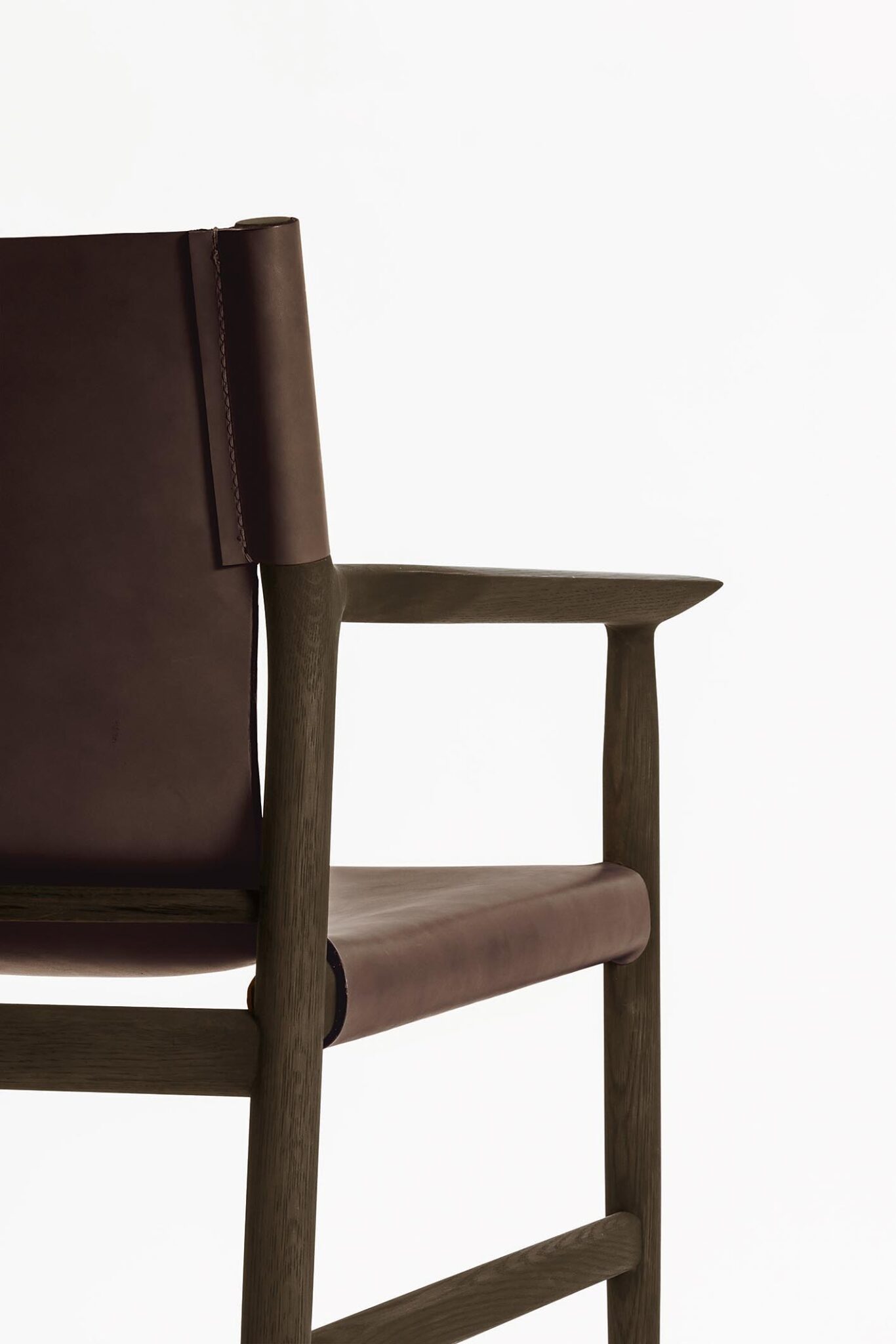 オーク材のフレームは広島県の椅子工場で削り出し、兵庫県・姫路で作った厚いヌメ革を兵庫県・豊岡で裁断縫製しています。日本のそれぞれの地域産業の特性を生かし、職人の手によって一つひとつ生み出されたこの製品は、日本の地域性の可能性を示す新しい形のチェアです。