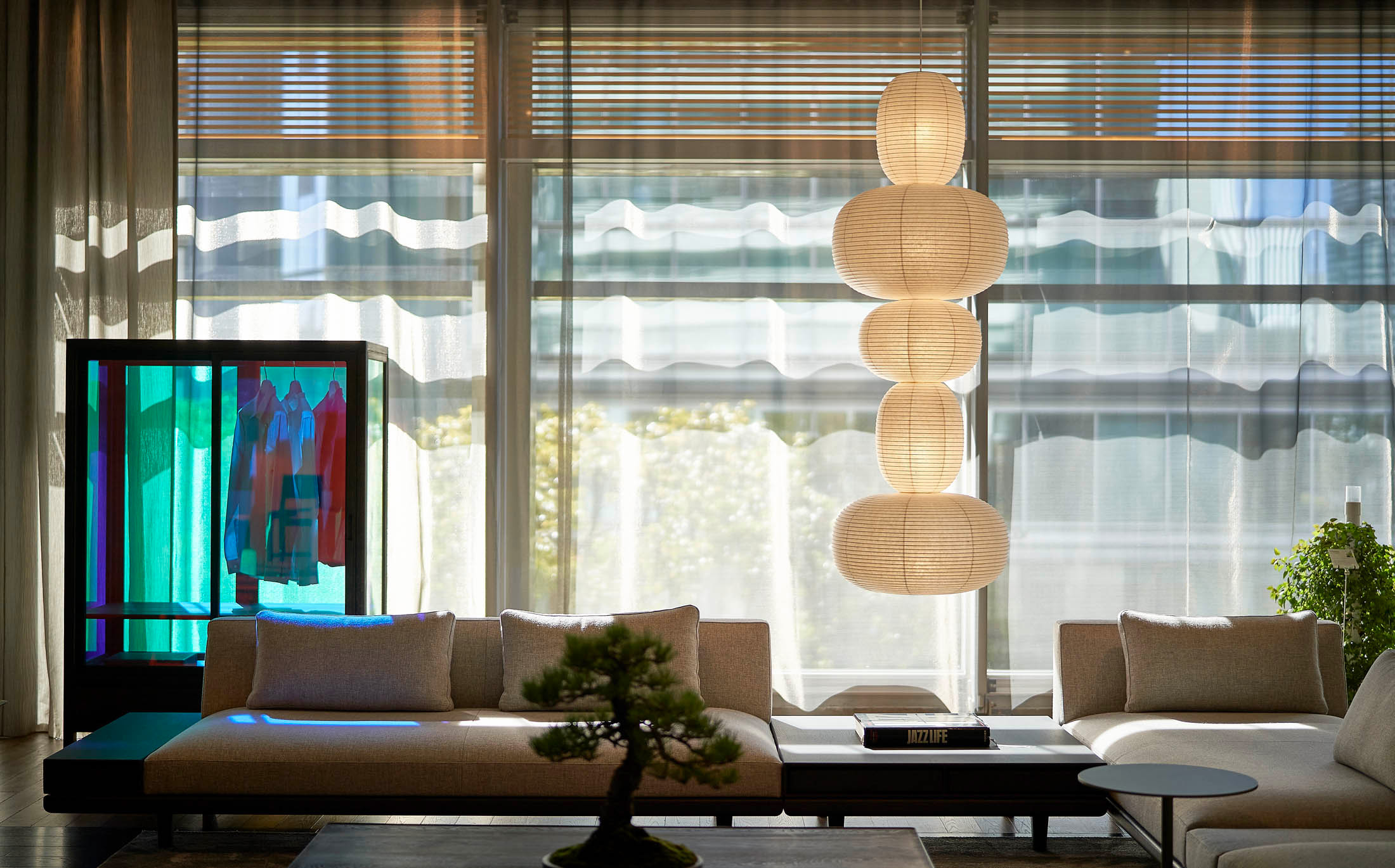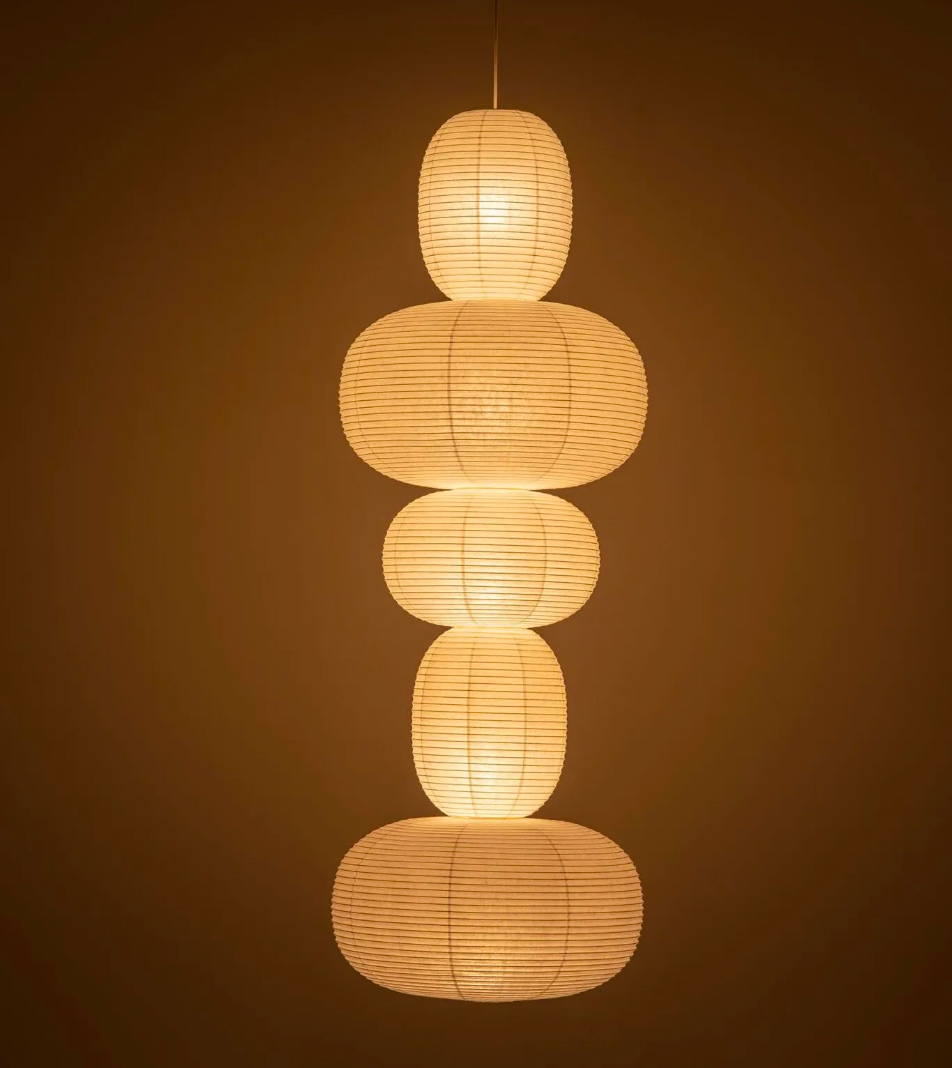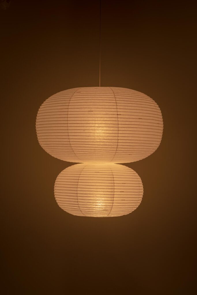 堅牢な作りを誇る水府提灯と大きなサイズの和紙を漉くことができる石州和紙だからこそ、これほどまでの大きな提灯を作ることができました。自然素材と日本の伝統から生まれた光の造形がモダンな空間を照らし、豊かな情景を生み出します。